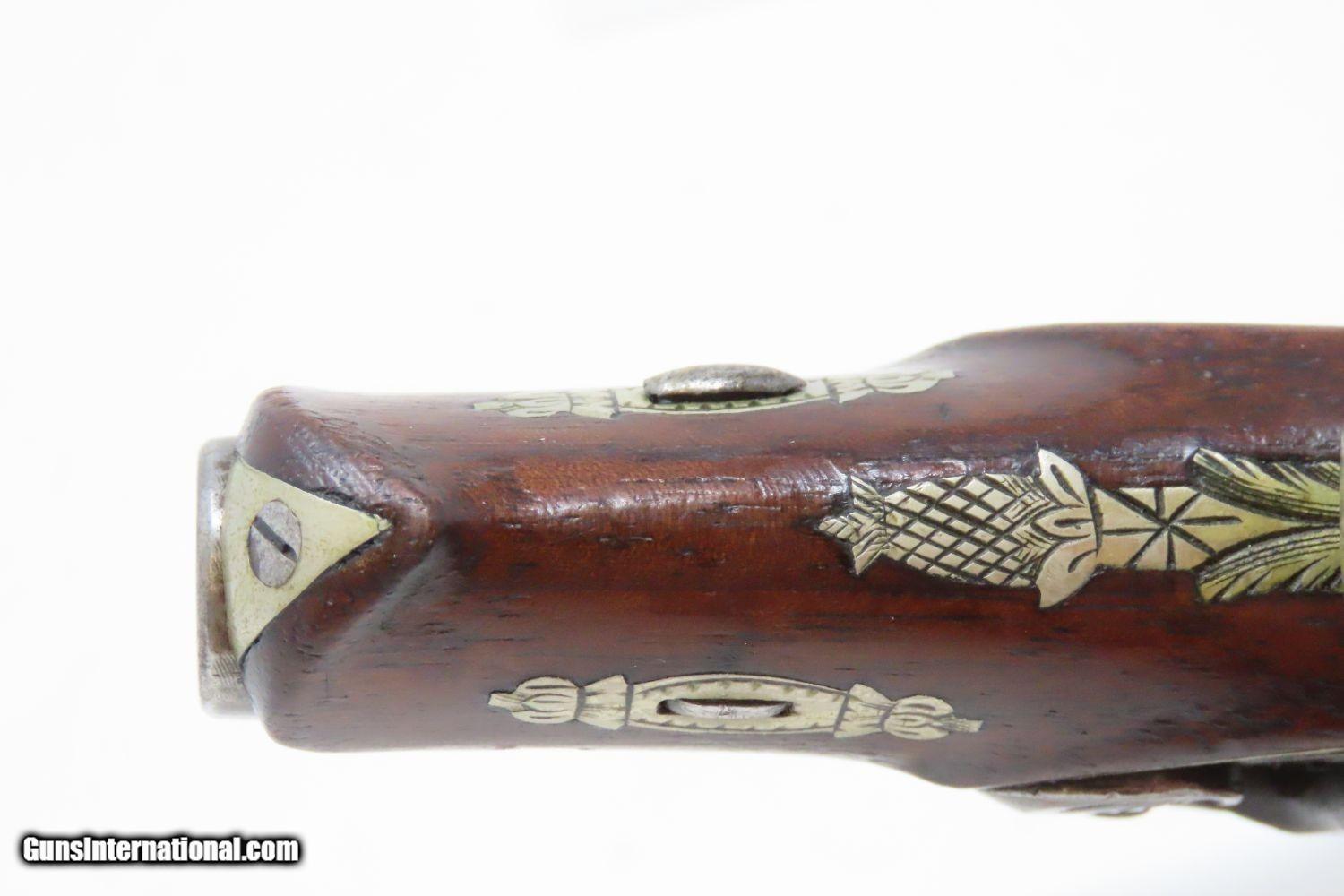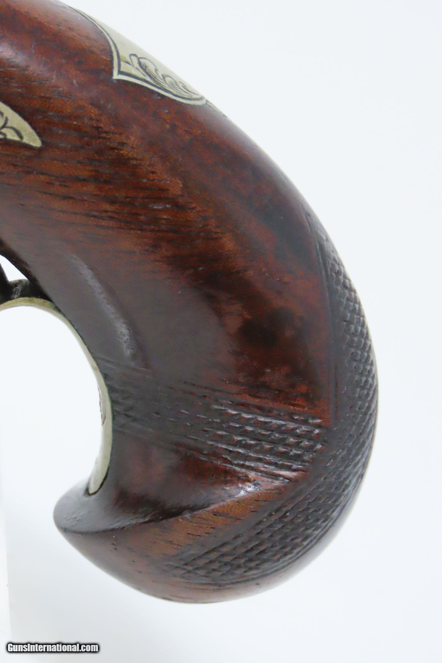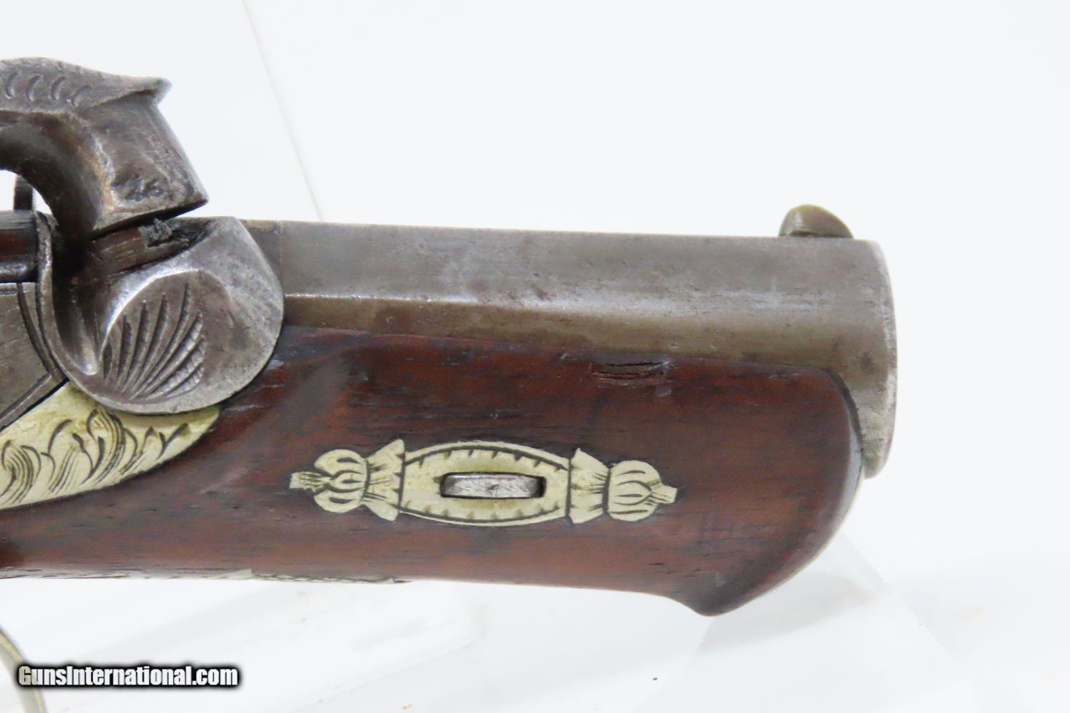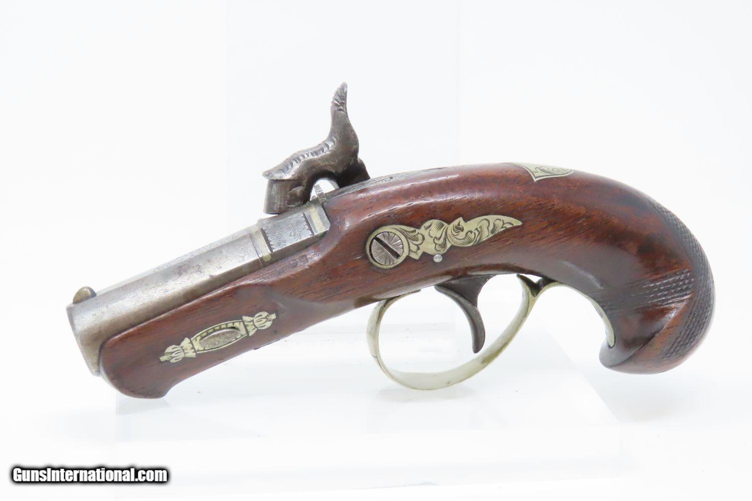 Description: CURRY of SAN FRANCISCO Antique HENRY DERINGER Percussion Pistol CURRY Marked HIDEOUT Pistol, Turbulent Mining Town Here we present an antique Henry Deringer Percussion Pistol, made circa 1863 in Philadelphia, Pennsylvania. It is marked on the barrel with the San Francisco retailer “N. Curry & Bro/San Franco Cala”. In 1863, Nathaniel and John Curry inherited their brother Charles’s business upon his death, placing this example with a production date of circa 1863. Curry was a large distributor of legitimate “Deringers” and a former citizen of Philadelphia as well. Henry Deringer was a very successful Pennsylvanian gunsmith who started his own company in his early twenties, circa 1809. It was not until the 1850s that his prototypical “Deringer” percussion pistol became extremely popular. Once it did become popular, the basic design was copied in dozens of different shops. Not only was it copied, but Deringer’s good name was stamped on guns made by others, many of them not up to the quality standards of Deringer himself. The inventor was apparently very worried about protecting his good name, so he pursued and sued any of the counterfeiters that he could find and tried to warn the buying public to beware of his spurious imitators. The name “Deringer” often invokes certain historical events, characters or moments in film. Deringer’s name has become both a noun and a catch-all term. President Abraham Lincoln was shot and killed with one of Henry Deringer’s pocket sized percussion pistols, the night John Wilkes Booth revenged the South at the Ford Theater. They conjure images of the California Gold Rush, as well as riverboat gamblers. These pistols were very practical for the time, being small and concealable and of large bore size. Charles Edward Chapel had this to say about the Deringer, especially regarding their use in San Francisco during the gold-mining rush in the 1850s and the decade following: “For a man in a tight spot, with an armed enemy only a few feet away, a pair of single-shot Deringer pistols was more effective than the multishot pepperbox. You either got your man at the first or second shot—if, indeed, you were given the chance to fire twice—or you got a fast funeral. That heavy-calibered little gun was a man-stopper at short range, an effective surprise weapon, an “equalizer” with which many a gold-camp David permanently tamed the muscle-bulging, belligerent Goliaths of the frontier. Included in a man’s personal arsenal, the pistol was carried either as a principal weapon or as a reserve to be used when revolver, pepperbox or Bowie knife failed.” The overall condition is near fine. Strong action. The bore is in great shape. Solid stock. Sharp engravings and clear markings. Here is an original Henry Deringer Pistol, sent to wild San Francisco in the 1860s. Own the original! This is a legitimate antique and not a reproduction. Barrel is 1-5/8 inches. Caliber: .40 Percussion Overall condition as seen in photos. Very Fast. Very Safe. FREE SHIPPING WORLDWIDE. Delivered directly to your door by express mail! Guaranteed AUTHENTIC & Includes CERTIFICATE OF AUTHENTICITY. ancestryguns $3375 #210113 SOLD Antique: Yes |