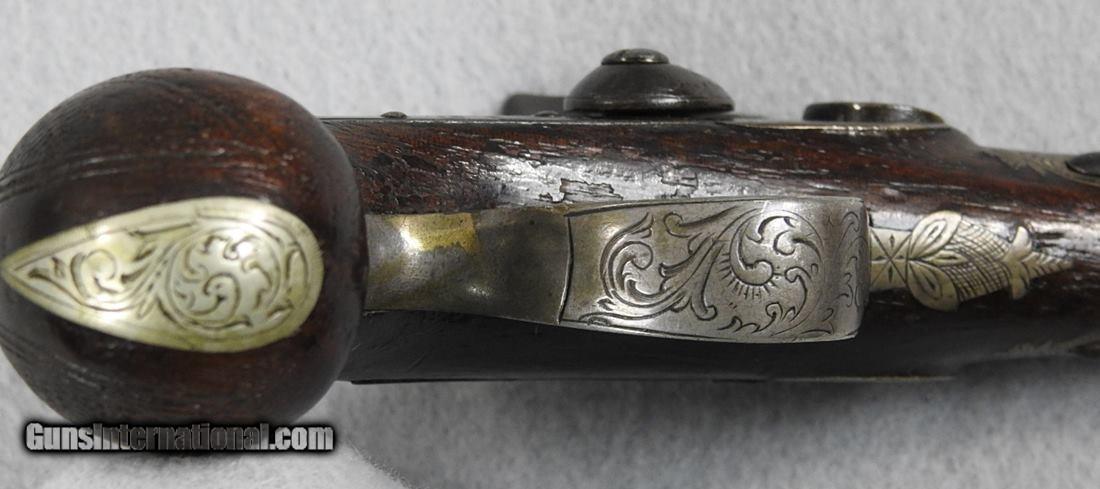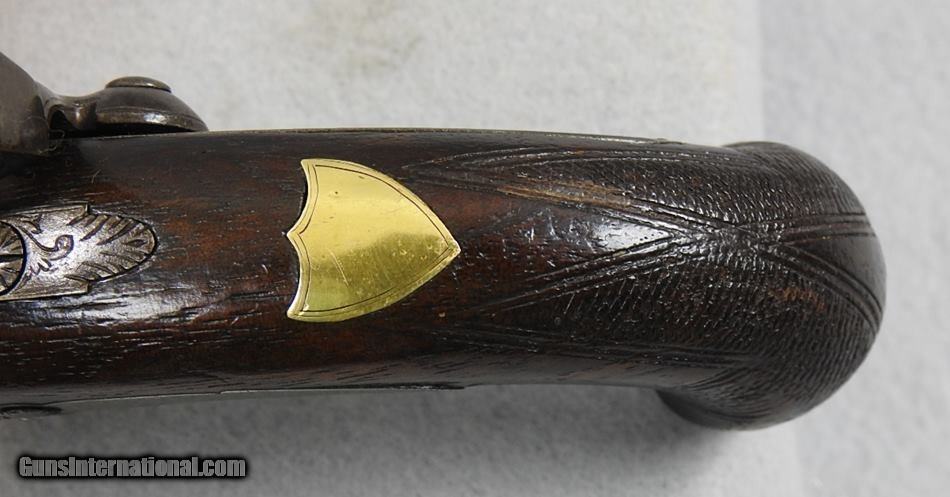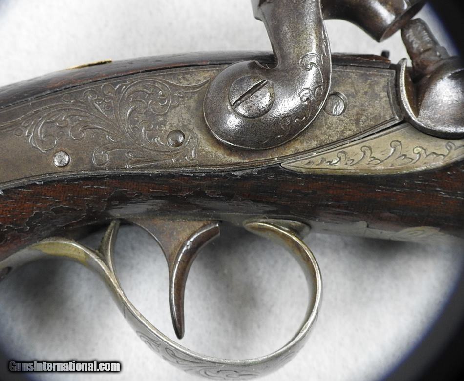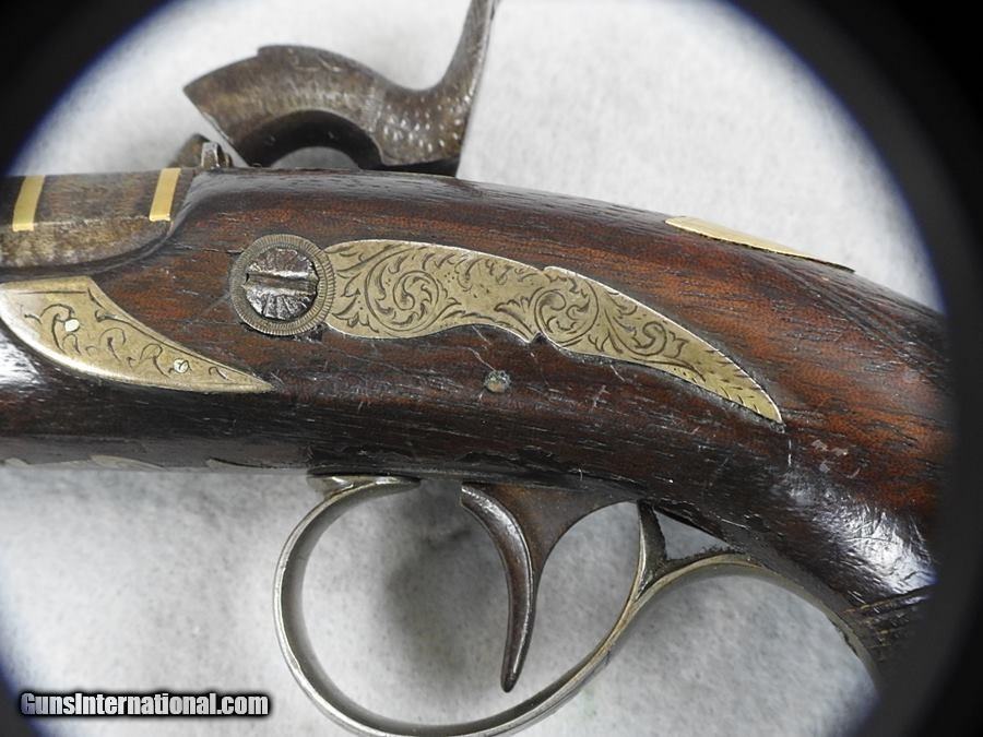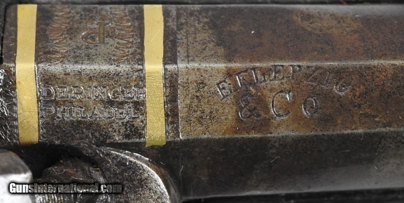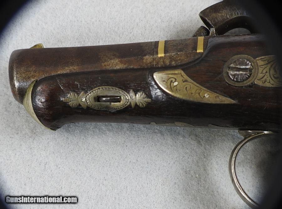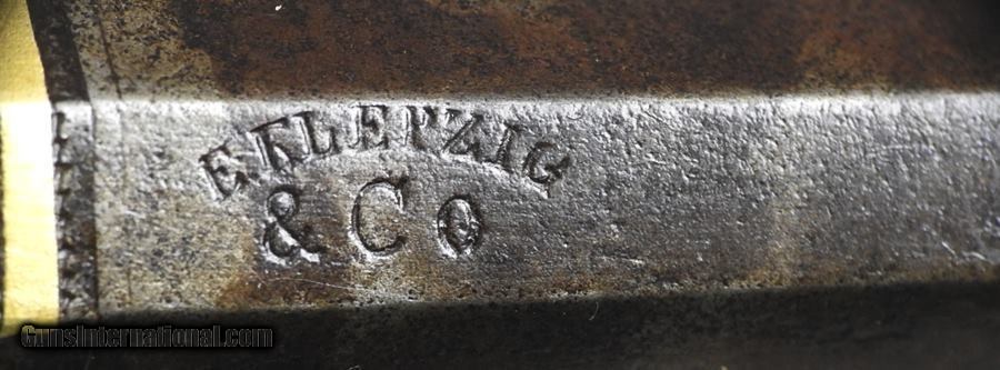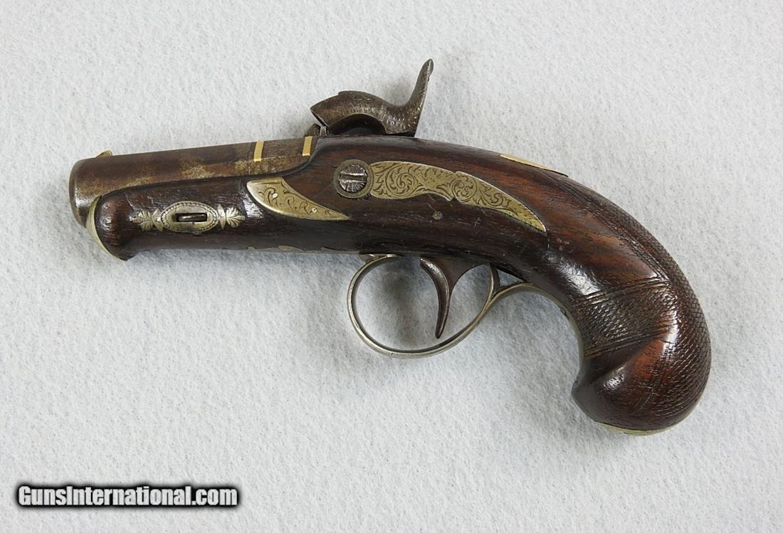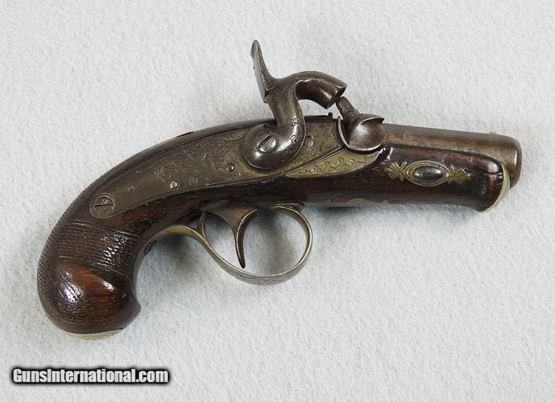 Description: This is a Rare E Klepzig & Co. 38 caliber percussion Deringer of the Philadelphia style. In 1856 they were located at 212 Washington Street, San Francisco and in 1860 relocated to the corner of Battery and Oregon Streets, San Francisco. This one is listed in California Gunsmiths book, 1846-1900 page 149 by the late Lawrence Shelton. This has a nicely engraved lock, tang, hammer and trigger guard. All trim is silver and the barrel has two gold bands and a gold shield on the top of the grip. The mechanical function is very good, the wood is very good. I would consider trades for pre 1899 ANTIQUE PISTOLS and rifles on any of my items.. WHAT DO YOU HAVE TO TRADE? Ask about our 30-90 day lay-away program. We accept Bank Check, Money order, Personal checks or wire transfer. SOLD Antique: Yes Manufacturer: E Klepzig&Co. Model: Philadelphia Style San Francisco Deringer |