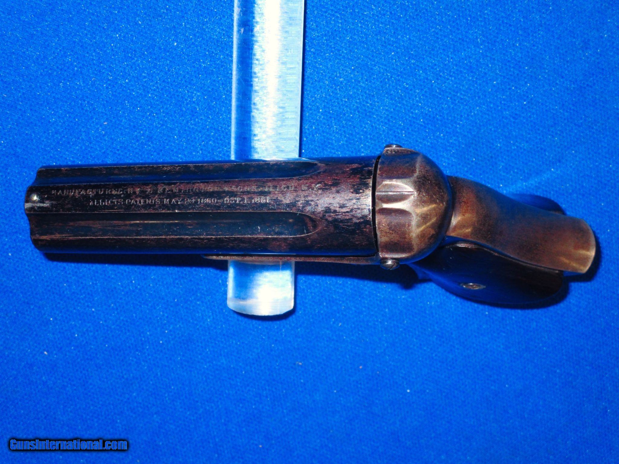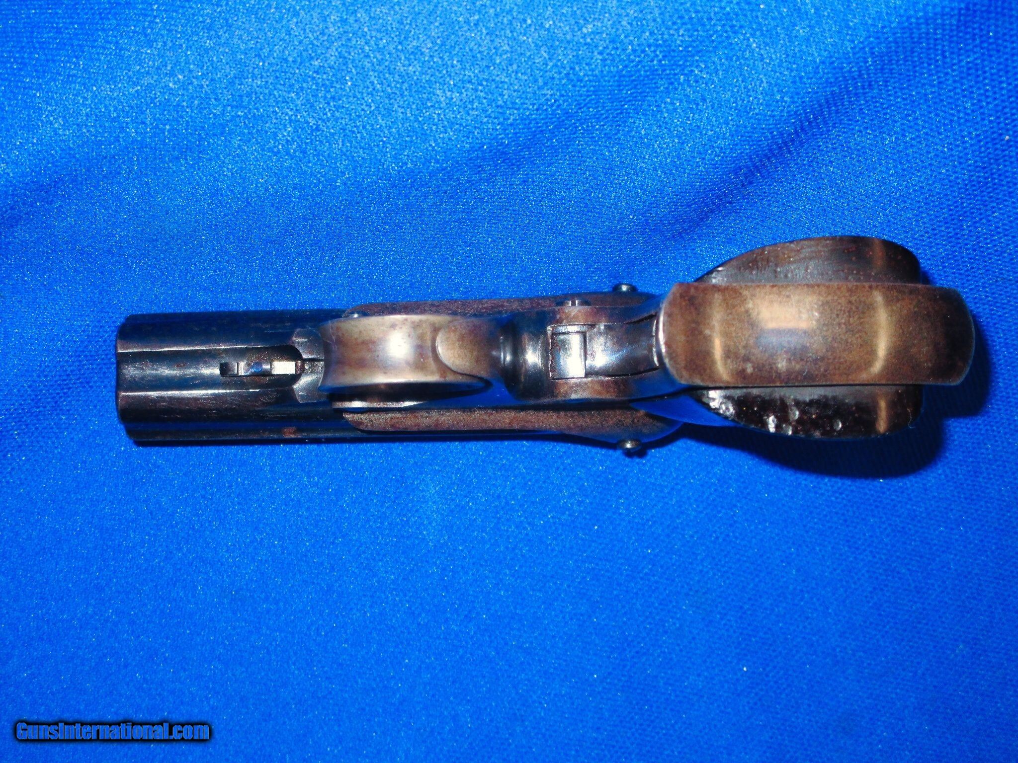 Description: An Early Remington Ring Trigger Five Shot Derringer in Fine Untouched Condition. Serial # 6414, all matching numbers. All original and complete. The derringer has fine metal and markings throughout. All edges are crisp. The barrel on it retains most of its original factory blue finish with the balance turning into a plum brown patina. The frame, back strap, and ring trigger have a plum blue patina with some original colors showing in spots. All screws are fine with original blue on them. The grips on the gun are also fine. The derringer has a fine acion and bores. This Is A Fine Example Of An Early Remington Elliot Ring Trigger Five Shot Deringer With Lots Of Blue Finish Left On It. These Remington Ring Trigger Derringers Are Tough To Find In This Condition! DISCLAIMER: All firearms are sold as collector’s items only – we did not accept responsibility as to the shooting safety or reliability of any antique firearm. All firearms as described as accurately as possible, given the restraints of a catalog listing length. We want satisfied customers and often under describe the weapons. Any city or state regulations regarding owning antique firearms are the responsibility of the purchaser. All firearms are mechanically perfect unless noted, but again are NOT warranted as safe to fire. SOLD Handgun Caliber: .22 Short Manufacturer: Remington Model: Elliot Ring Trigger 5 Shot Serial Number: 6414 Condition: Fine Untouched Metal Condition: Fine Untouched Condition |