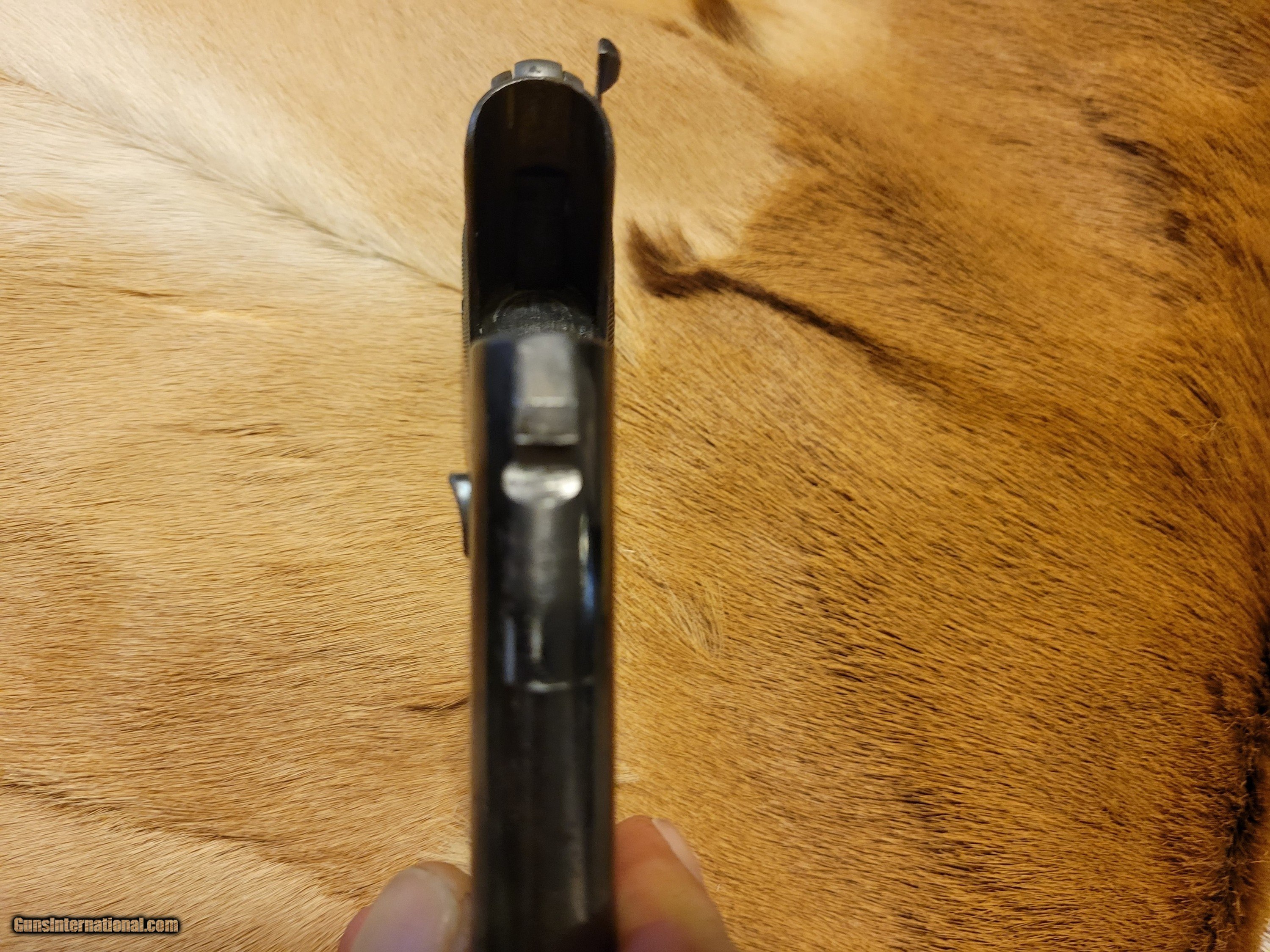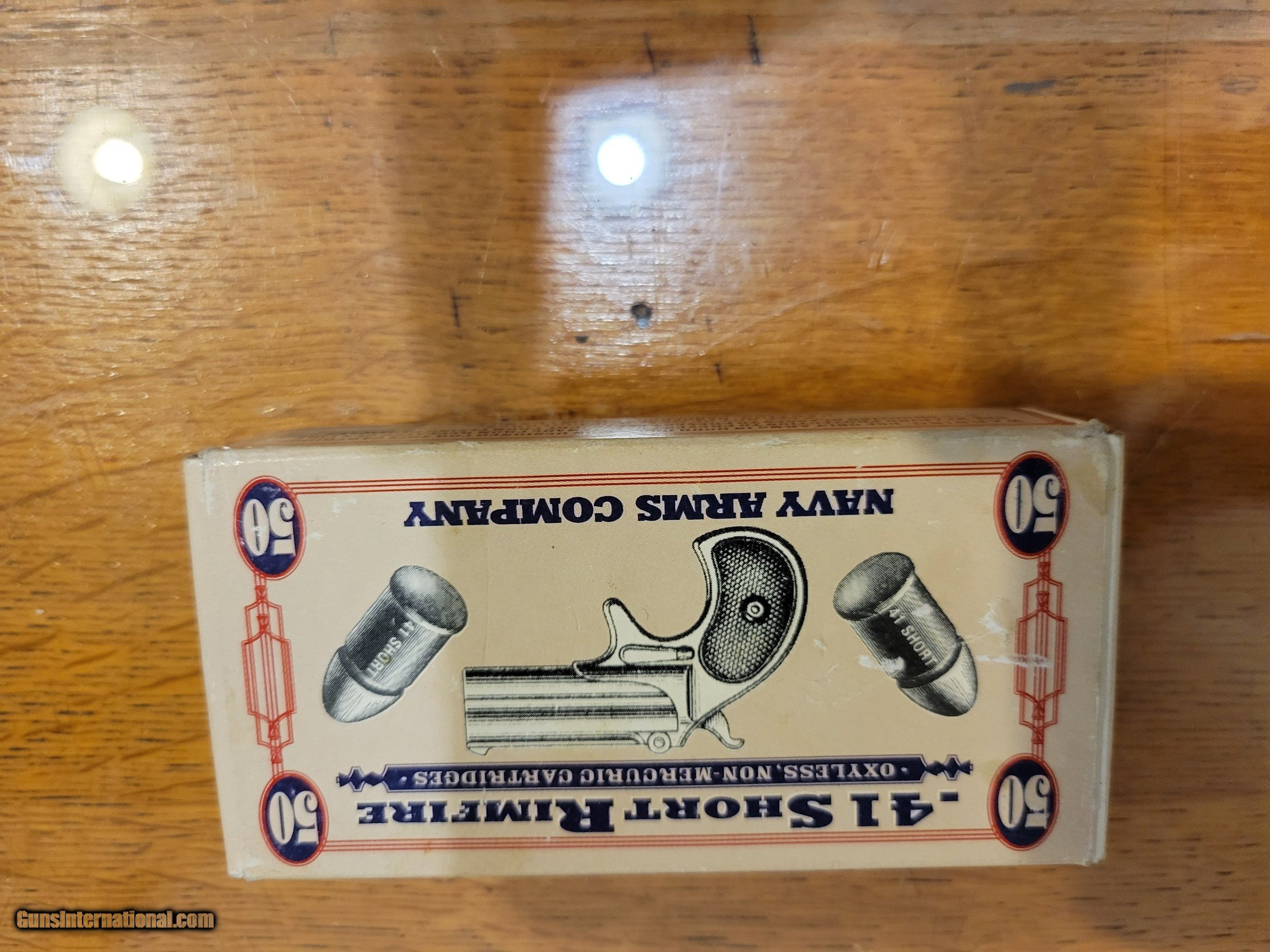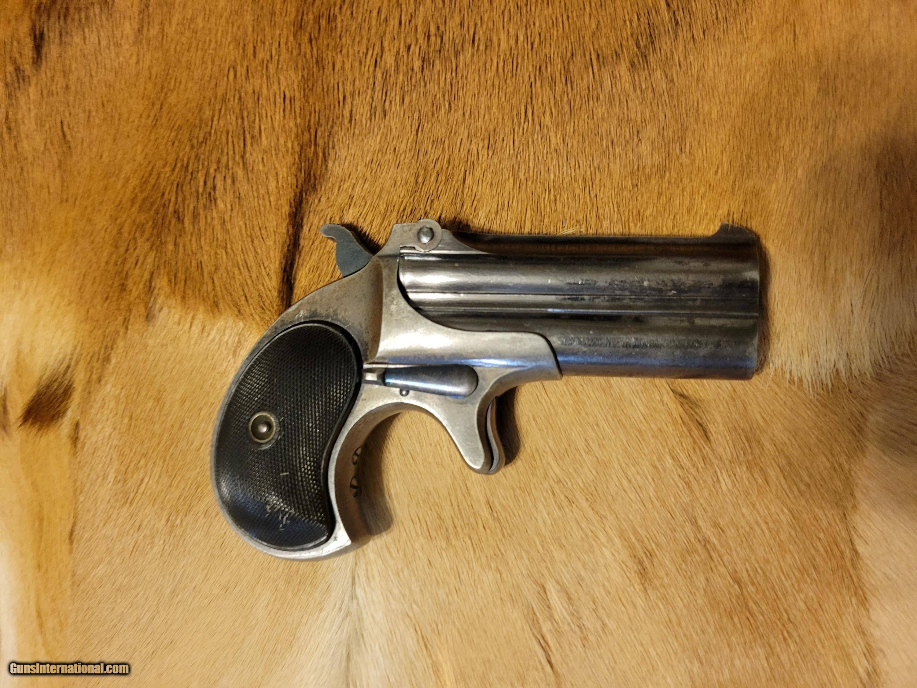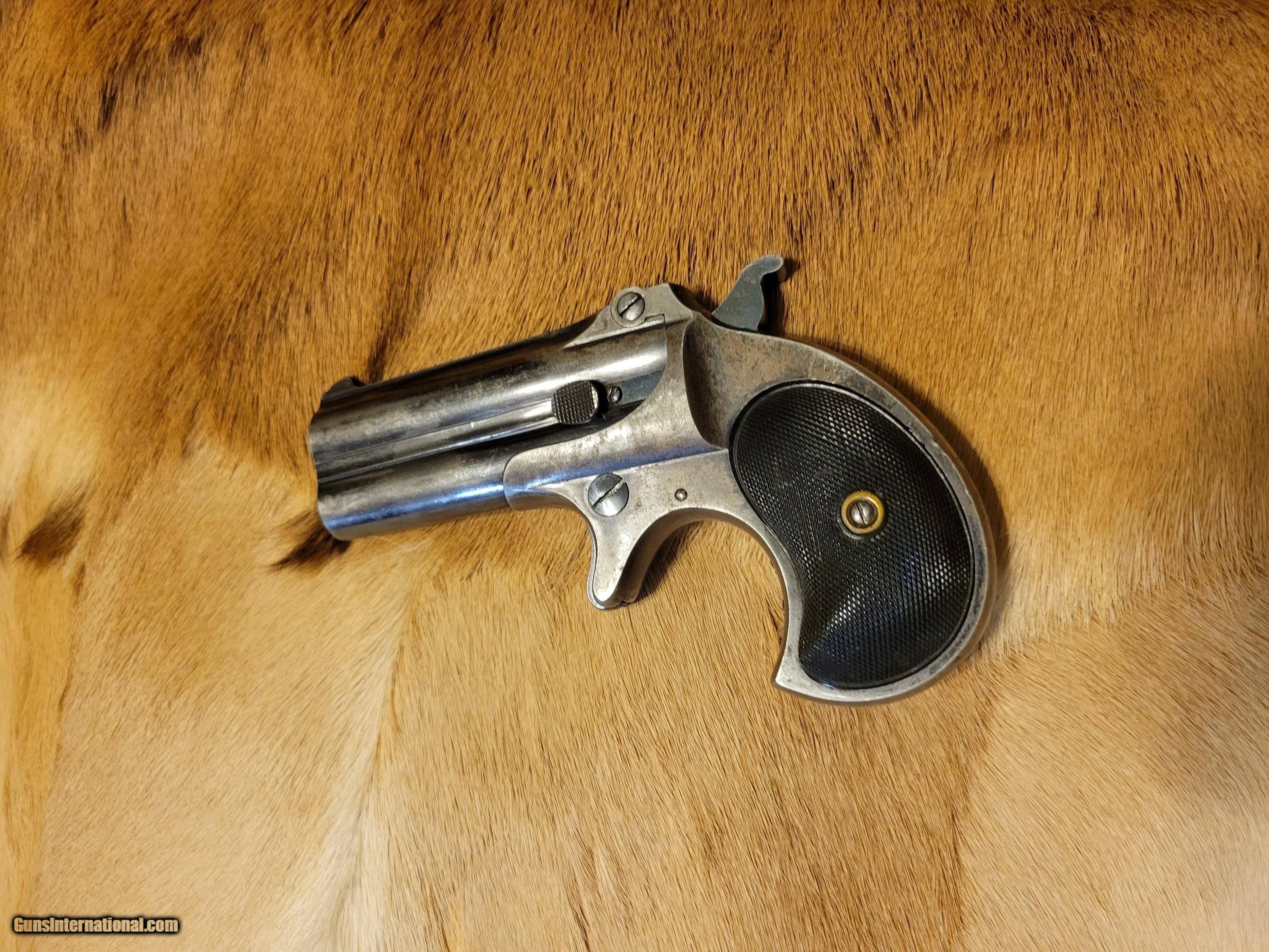 Description: This Type 2 Early Model 3, Batch # 842 Still holds populatity. The patented articulating firing pin enabled the shooter to simply engage the hammer for the 2nd shot. 20 rounds of 41 short included Barrels retain 75% or origonal Fire Bluing, hinge is still tight, slide extractor and thumb barrel latch are bright fire blue showing little use. Lands & grooves and bright and sharp with no pitting evident. Barrel rib "REMINGTON ARMS CO. ILLION, N.Y." , bright and clear. Frame retains 10% of it's bluing, Hammer is bright, sharp fire blu as is the trigger. Grips show no marks on the fine point checkering and no cracks or chips are evident. From 1866 to 1935 this derringer was a mainstay in America. SOLD Curio/Relic: Yes Handgun Caliber: .41 Rimfire Manufacturer: remington Model: 95 Serial Number: 842 Bore: rifled Chambers: 2 Ejectors: Extractor Condition: V. Good Metal Condition: V. Good Wood Condition: NA Bore Condition: V. Good Barrels: 2 Barrel Type: Fluid Steel Action: single Triggers: 1 Stock: Balelite Rib: full Finish: blu Weight: .85 Sights: iron Manufacture Date: 1889 Engraving: none Item Location: Connecticut Proof:Nitro: none marked Proof:Black: none marked |