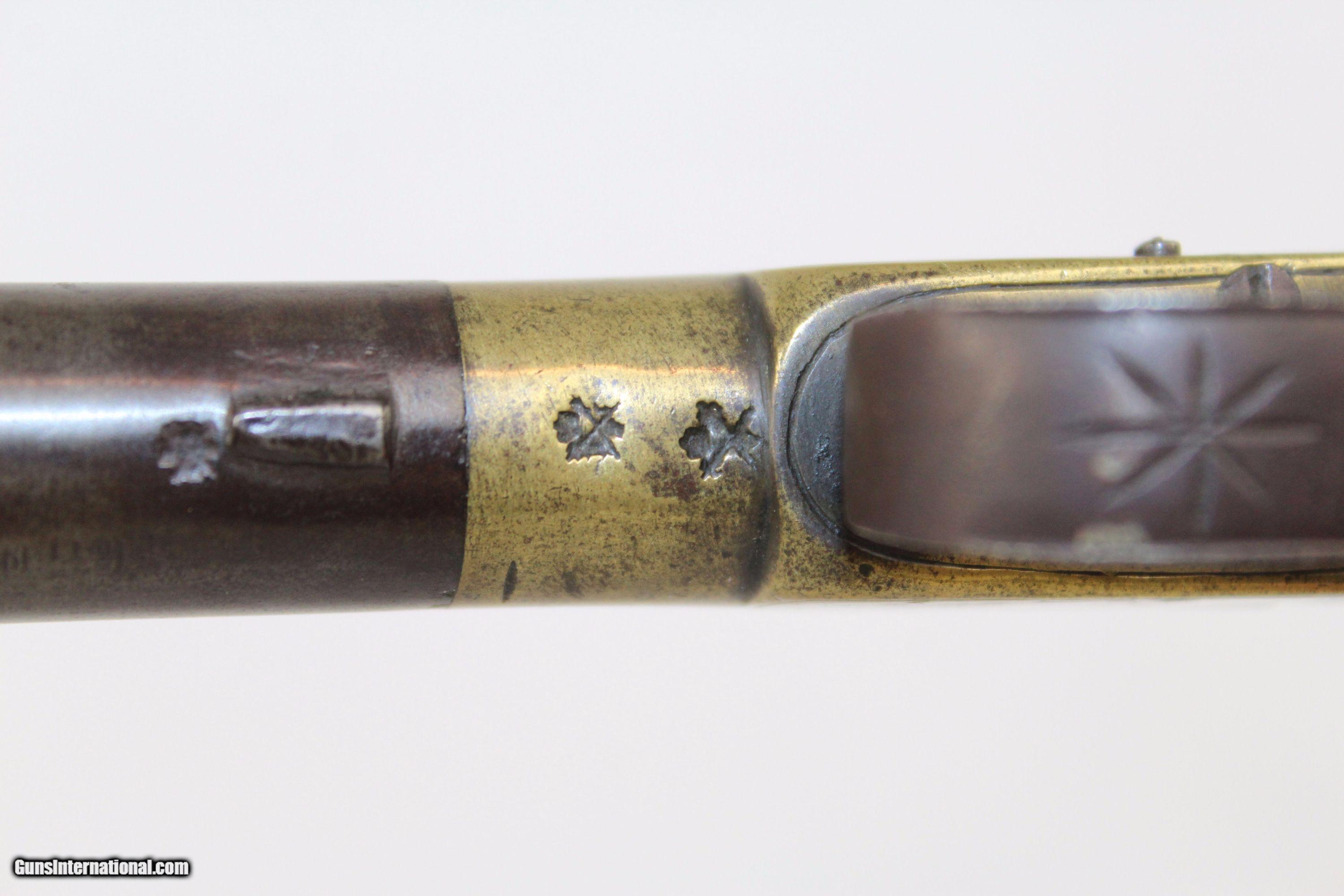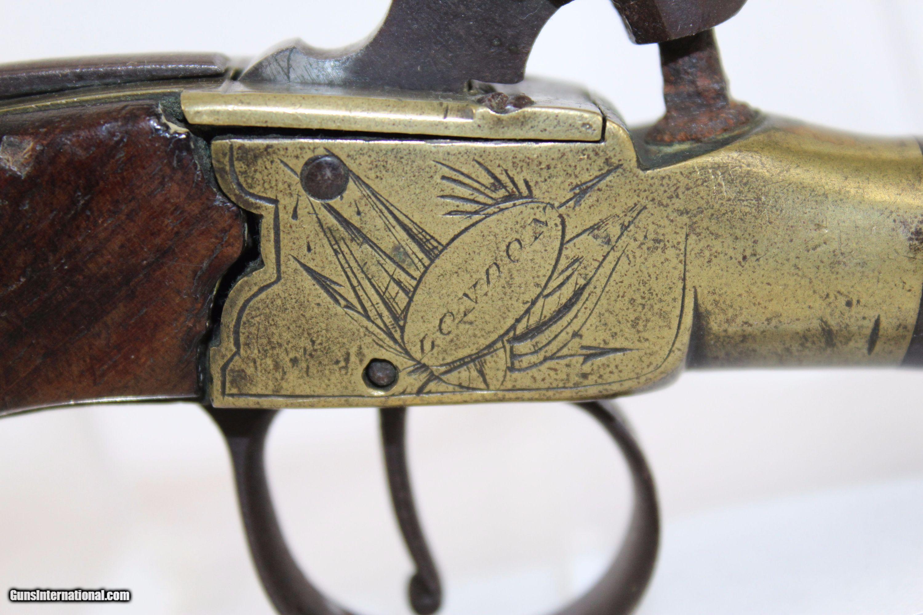 Description: ENGLISH Antique Deringer .48 Caliber Percussion Pistol Very Small British Proofed London Pocket Pistol Here we present an antique .48 Caliber Percussion Pistol, made circa 1840 in England. This little pistol would have been perfect for carrying in a pocket for self-defense. It was the English version of Henry Deringer’s pistol. The brass frame is engraved and marked “LONDON” on one side and the maker’s name on the other. Though not clear, the last four letters appear to be “OVER” or “OKER”. It may even read “JOKER”. British proof marks are located on the bottom of the frame. The overall condition is good. The metal surfaces are dark with age. The markings are mostly legible. The wood grip shows period wear, but is largely smooth. The bore is smooth and clean. The action is strong. Here is a neat little English pistol! Own the original! This is a legitimate antique and not a reproduction. Barrel is 1-1/2 inches. Caliber: .48 Percussion Overall condition as seen in photos. Very Fast. Very Safe. FREE SHIPPING WORLDWIDE. Delivered directly to your door by express mail! Guaranteed AUTHENTIC & Includes CERTIFICATE OF AUTHENTICITY. ancestryguns $800 #5213 SOLD Antique: Yes |
