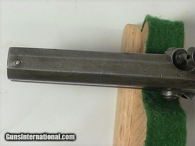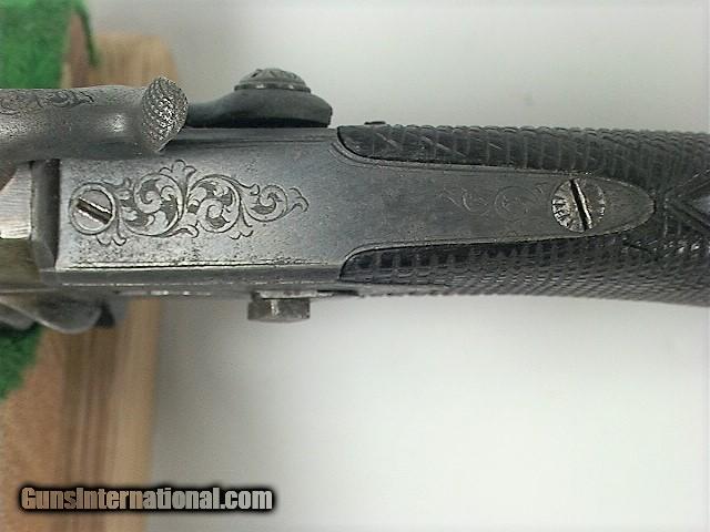 Description: ENGLISH TWO SHOT PERCUSSION DERRINGER WITH ROTATING BARRELS, 50 CALIBER SMOOTH BORE 4”, ENGLISH PROOF MARKS, GRAY METAL WITH SCROLL ENGRAVED FRAME, BORES HAVE SOME RUST, GRIPS HAVE BEEN CHECKERED, PATCH BOX ON BOTTOM OF THE GRIP, ANTIQUE SOLD Antique: Yes |