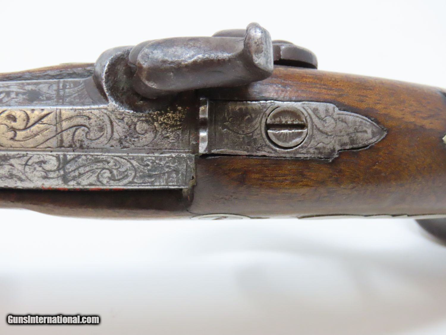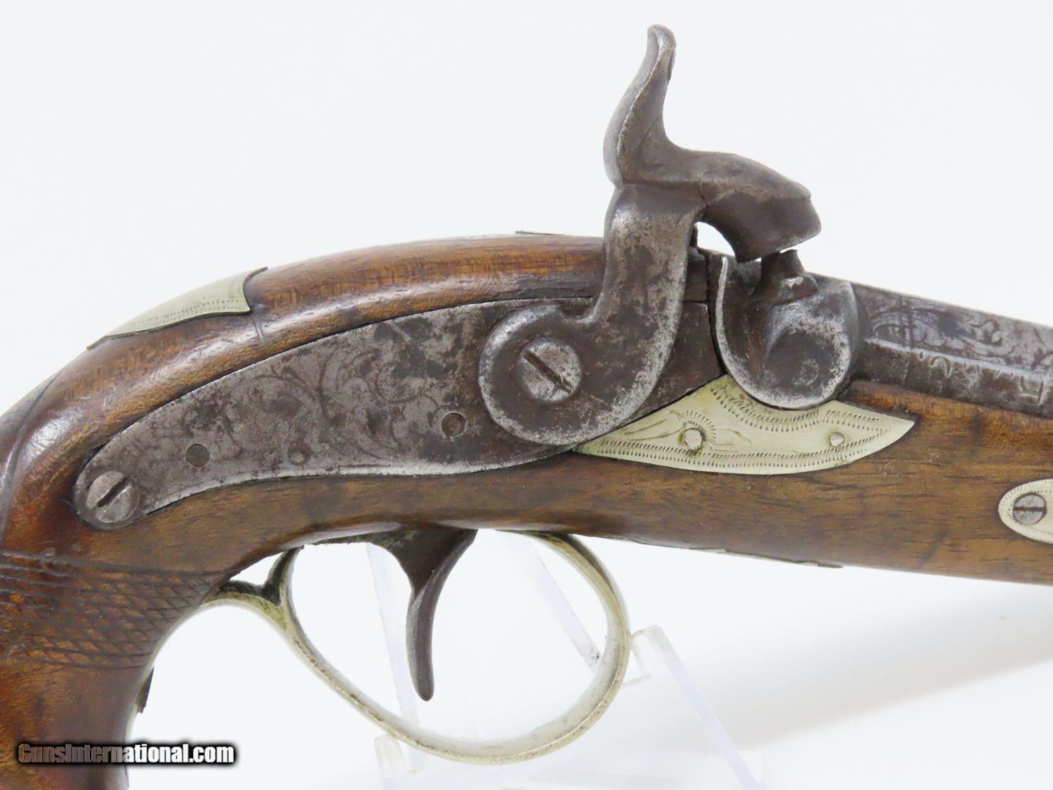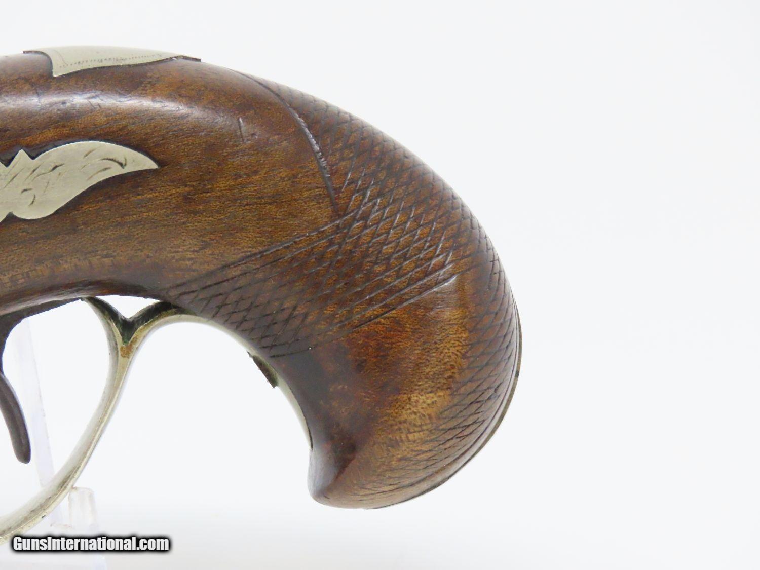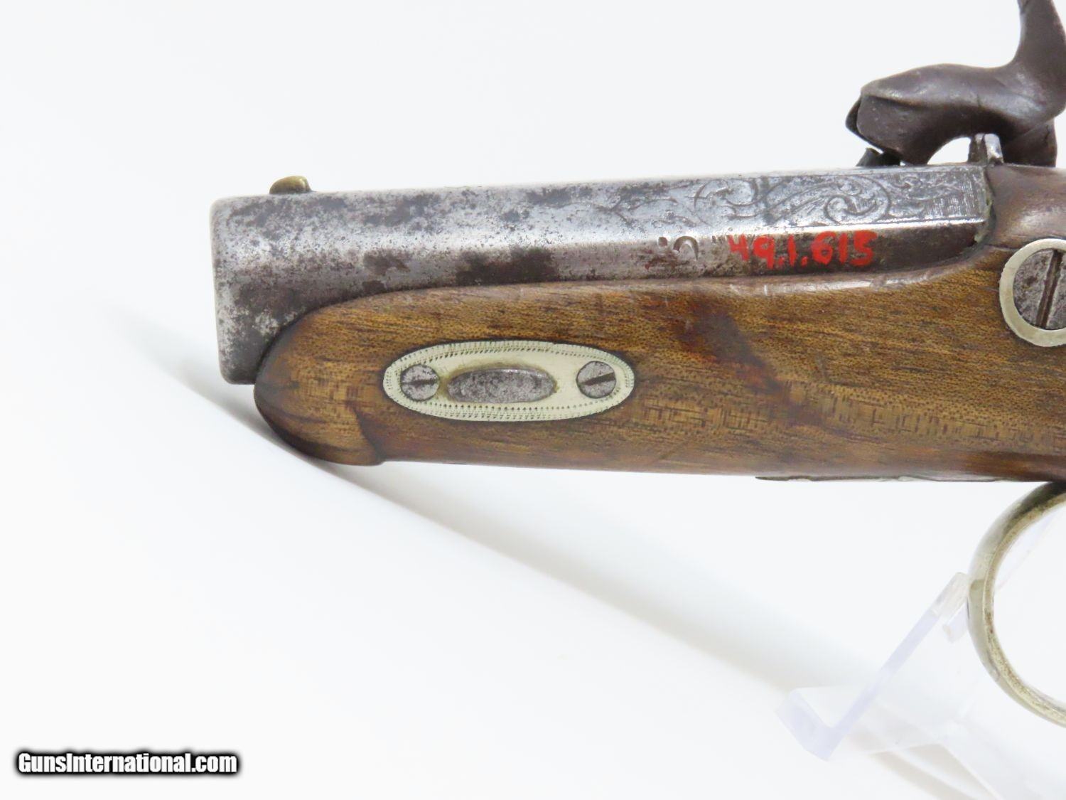 Description: ENGRAVED Antique DERINGER Percussion Pistol “R.A.C.” Marked Period & Quality Copy of Henry Deringer’s Famous Pistol Here we present an antique Engraved Deringer Percussion Pistol, made circa 1850. Henry Deringer was a very successful Pennsylvanian gunsmith who started his own company in his early twenties, circa 1809. It was not until the 1850s that his prototypical “Deringer” percussion pistol became extremely popular. Once it did become popular, the basic design was copied in dozens of different shops. Not only was it copied, but Deringer’s good name was stamped on guns made by others, some of them not up to the quality standards of Deringer himself. The inventor was apparently very worried about protecting his good name, so he pursued and sued any of the counterfeiters that he could find and warned the buying public to beware of his spurious imitators. The name “Deringer” often invokes certain historical event, characters or moments in film. Deringer’s name has become both a noun and a catch-all term. President Abraham Lincoln was shot and killed with one of Henry Deringer’s pocket sized percussion pistols, the night John Wilkes Booth revenged the South at the Ford Theater. They conjure images of the California Gold Rush, as well as riverboat gamblers. These pistols were very practical for the time, being small and concealable and of large bore size. Here is what Charles Edwin Chapel had to say about the Deringer pistol: “For a man in a tight spot, with an armed enemy only a few feet away, a pair of single-shot Deringer pistols was more effective than the multi-shot pepperbox. You either got your man at the first or second shot—if, indeed, you were given the chance to fire twice—or you got a fast funeral. That heavy-calibered little gun was a man-stopper at short range, an effective surprise weapon, an “equalizer” with which many a gold-camp David permanently tamed the muscle-bulging, belligerent Goliaths of the frontier. Included in a man’s personal arsenal, the pistol was carried either as a principal weapon or as a reserve to be used when revolver, pepperbox or Bowie knife failed.” This one does not appear to have been maker marked, however, it does have the unusual feature of having been engraved on the barrel as well as the lock and German silver hardware. “R.A.C.” is stamped thrice on the barrel. This example also has an inventory number from a private or museum collection in red paint on the left side of the barrel. The overall condition is good. The action is strong. A small crack is present under the head of the hammer and the crack is stable and immobile. The bore is dark. A great example of a Deringer pistol from a period that was about as exciting as it gets! Own the original! This is a legitimate antique and not a reproduction. Barrel is 2-1/2 inches. Caliber: .44 Overall condition as seen in photos. Very Fast. Very Safe. FREE SHIPPING WORLDWIDE. Delivered directly to your door by express mail! Guaranteed AUTHENTIC & Includes CERTIFICATE OF AUTHENTICITY. ancestryguns $1575 #20697 SOLD Antique: Yes |