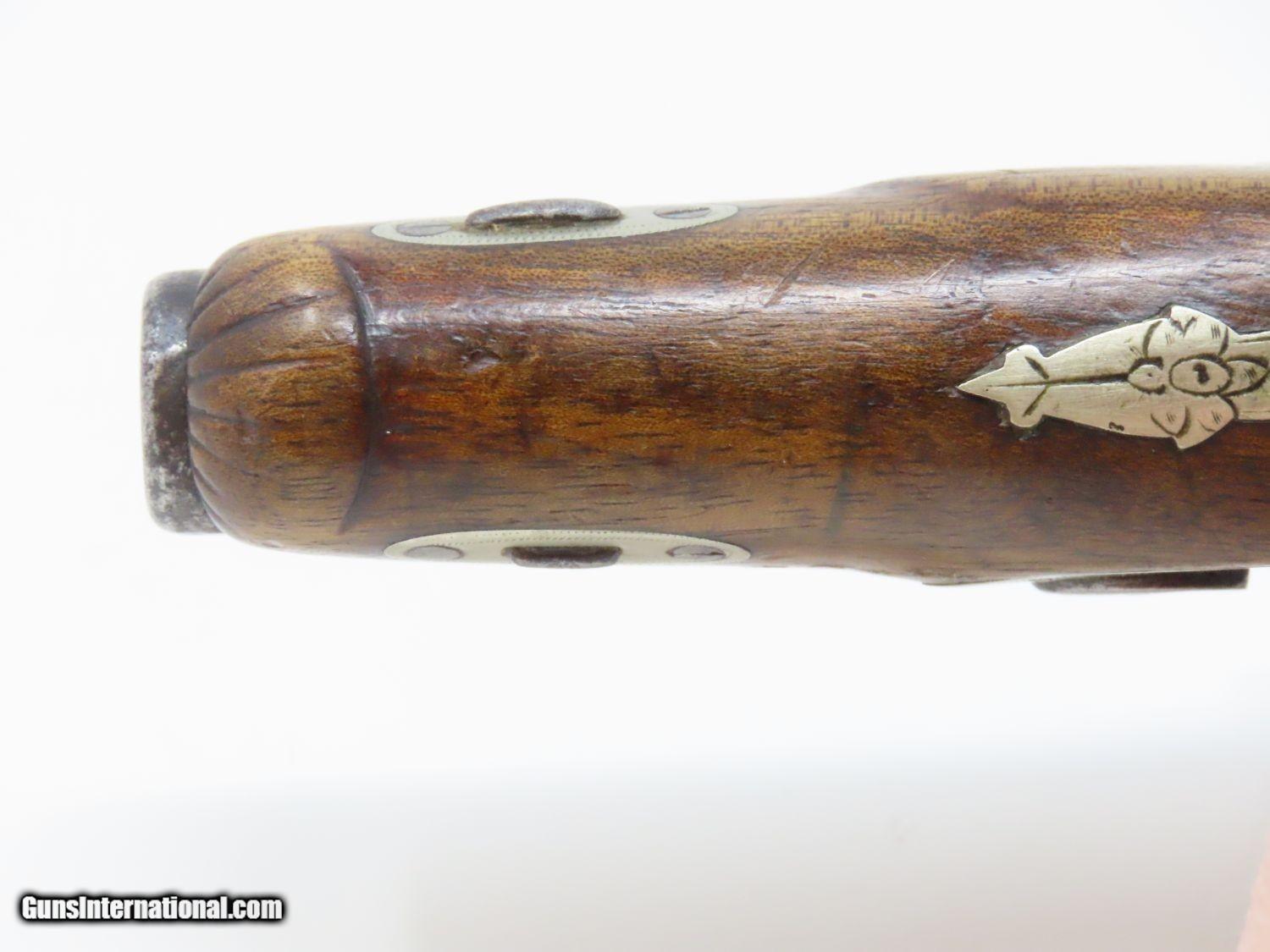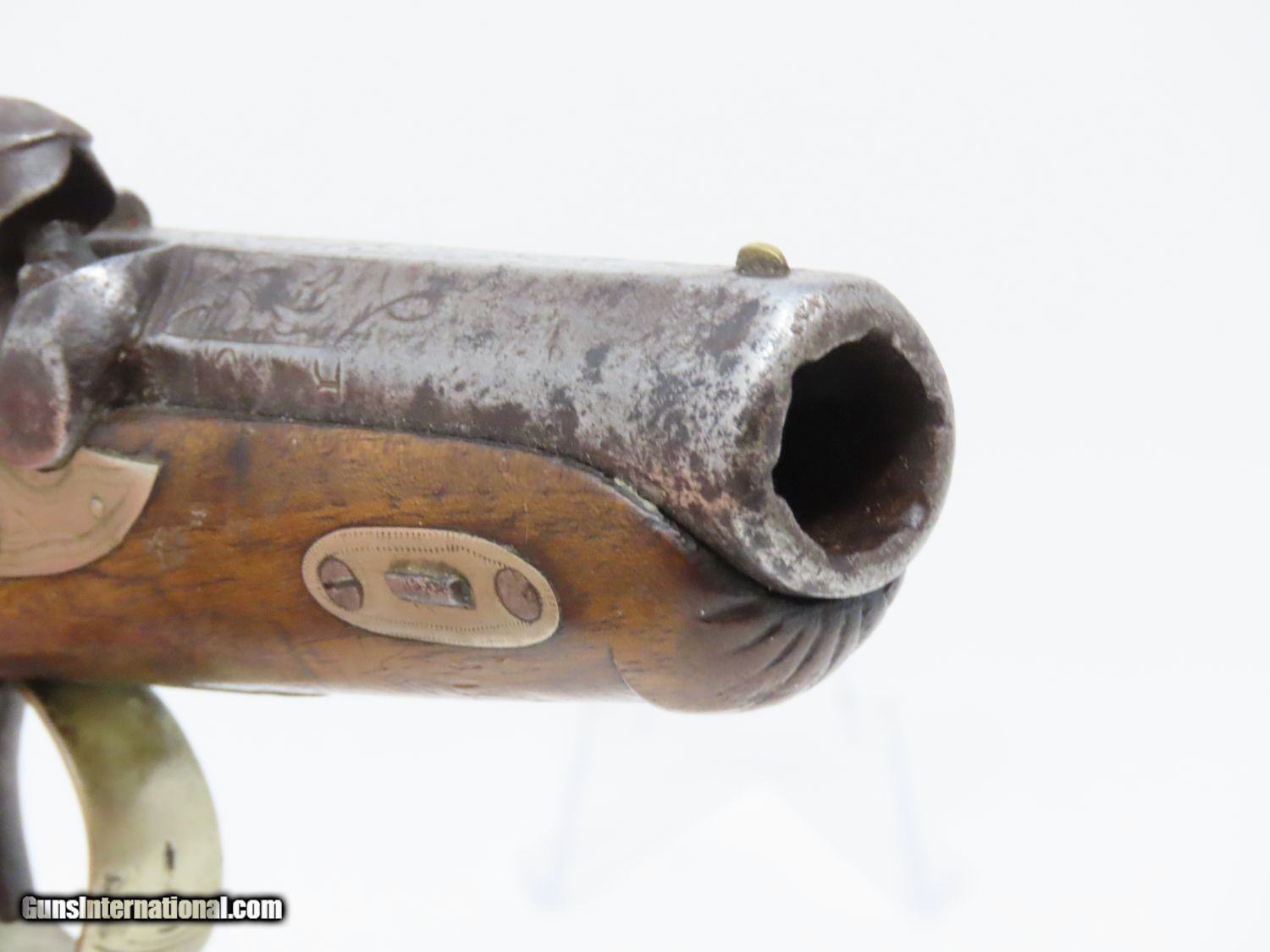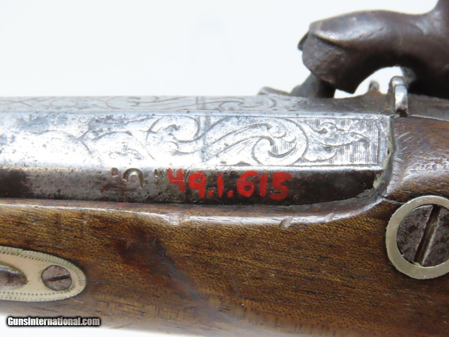 Description: ENGRAVED Antique DERINGER Percussion Pistol “R.A.C.” Marked Period & Quality Copy of Henry Deringer’s Famous Pistol Here we present an antique Engraved Deringer Percussion Pistol, made circa 1850. Henry Deringer was a very successful Pennsylvanian gunsmith who started his own company in his early twenties, circa 1809. It was not until the 1850s that his prototypical “Deringer” percussion pistol became extremely popular. Once it did become popular, the basic design was copied in dozens of different shops. Not only was it copied, but Deringer’s good name was stamped on guns made by others, some of them not up to the quality standards of Deringer himself. The inventor was apparently very worried about protecting his good name, so he pursued and sued any of the counterfeiters that he could find and warned the buying public to beware of his spurious imitators. The name “Deringer” often invokes certain historical event, characters or moments in film. Deringer’s name has become both a noun and a catch-all term. President Abraham Lincoln was shot and killed with one of Henry Deringer’s pocket sized percussion pistols, the night John Wilkes Booth revenged the South at the Ford Theater. They conjure images of the California Gold Rush, as well as riverboat gamblers. These pistols were very practical for the time, being small and concealable and of large bore size. Here is what Charles Edwin Chapel had to say about the Deringer pistol: “For a man in a tight spot, with an armed enemy only a few feet away, a pair of single-shot Deringer pistols was more effective than the multi-shot pepperbox. You either got your man at the first or second shot—if, indeed, you were given the chance to fire twice—or you got a fast funeral. That heavy-calibered little gun was a man-stopper at short range, an effective surprise weapon, an “equalizer” with which many a gold-camp David permanently tamed the muscle-bulging, belligerent Goliaths of the frontier. Included in a man’s personal arsenal, the pistol was carried either as a principal weapon or as a reserve to be used when revolver, pepperbox or Bowie knife failed.” This one does not appear to have been maker marked, however, it does have the unusual feature of having been engraved on the barrel as well as the lock and German silver hardware. “R.A.C.” is stamped thrice on the barrel. This example also has an inventory number from a private or museum collection in red paint on the left side of the barrel. The overall condition is good. The action is strong. A small crack is present under the head of the hammer and the crack is stable and immobile. The bore is dark. A great example of a Deringer pistol from a period that was about as exciting as it gets! Own the original! This is a legitimate antique and not a reproduction. Barrel is 2-1/2 inches. Caliber: .44 Overall condition as seen in photos. Very Fast. Very Safe. FREE SHIPPING WORLDWIDE. Delivered directly to your door by express mail! Guaranteed AUTHENTIC & Includes CERTIFICATE OF AUTHENTICITY. ancestryguns $1575 #20697 SOLD Antique: Yes |