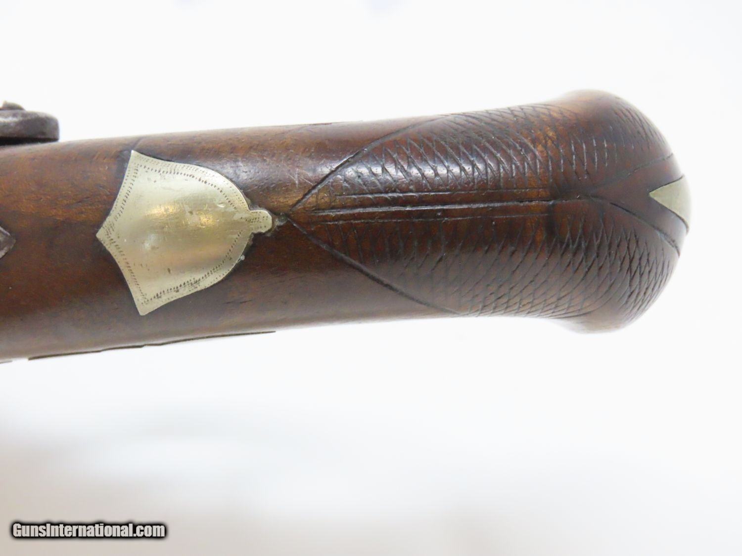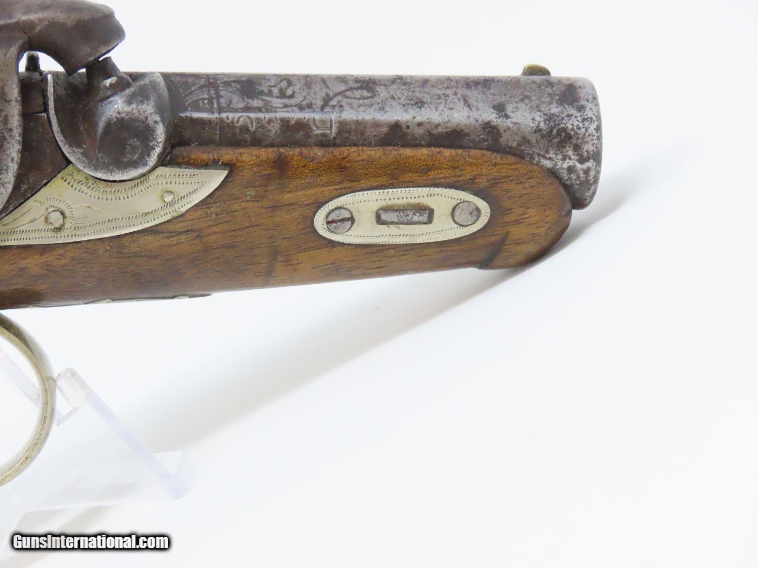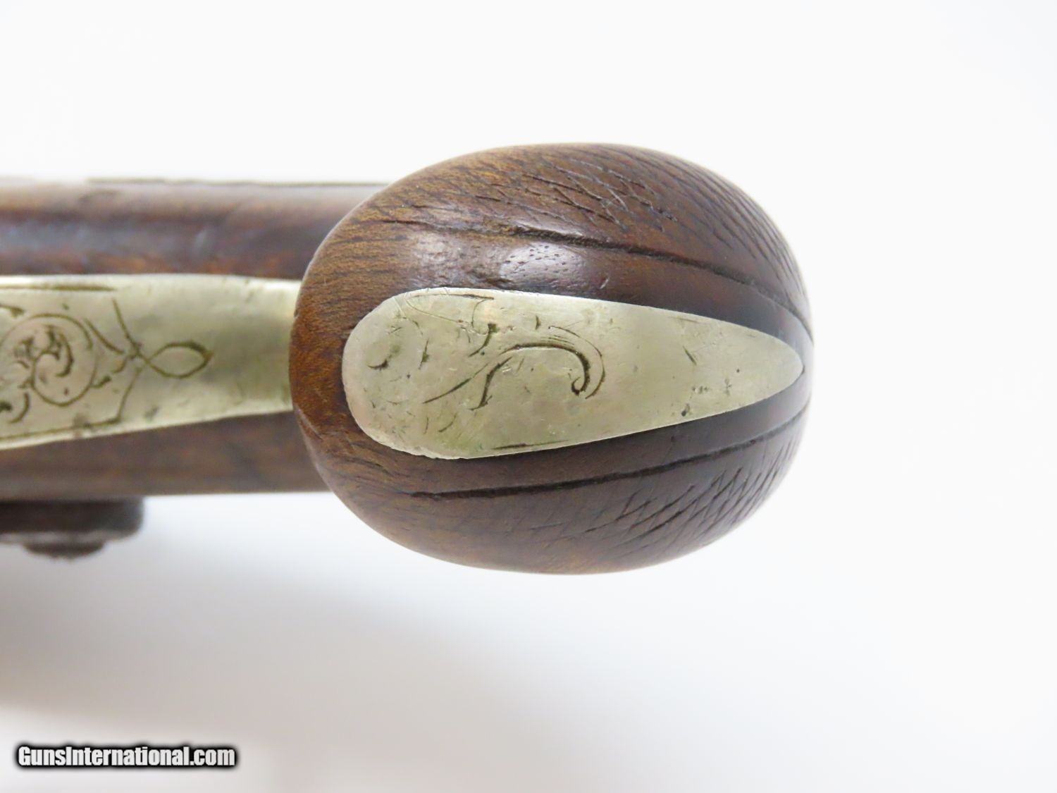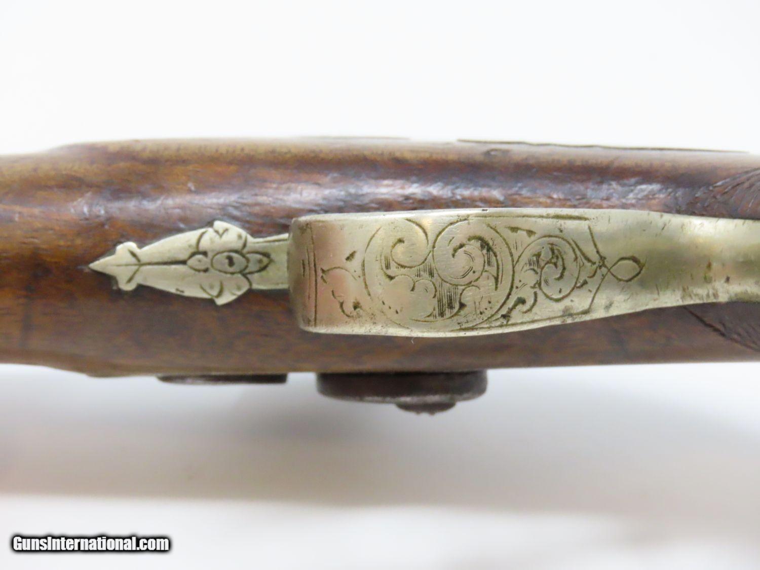 Description: ENGRAVED Antique DERINGER Percussion Pistol “R.A.C.” Marked Period & Quality Copy of Henry Deringer’s Famous Pistol Here we present an antique Engraved Deringer Percussion Pistol, made circa 1850. Henry Deringer was a very successful Pennsylvanian gunsmith who started his own company in his early twenties, circa 1809. It was not until the 1850s that his prototypical “Deringer” percussion pistol became extremely popular. Once it did become popular, the basic design was copied in dozens of different shops. Not only was it copied, but Deringer’s good name was stamped on guns made by others, some of them not up to the quality standards of Deringer himself. The inventor was apparently very worried about protecting his good name, so he pursued and sued any of the counterfeiters that he could find and warned the buying public to beware of his spurious imitators. The name “Deringer” often invokes certain historical event, characters or moments in film. Deringer’s name has become both a noun and a catch-all term. President Abraham Lincoln was shot and killed with one of Henry Deringer’s pocket sized percussion pistols, the night John Wilkes Booth revenged the South at the Ford Theater. They conjure images of the California Gold Rush, as well as riverboat gamblers. These pistols were very practical for the time, being small and concealable and of large bore size. Here is what Charles Edwin Chapel had to say about the Deringer pistol: “For a man in a tight spot, with an armed enemy only a few feet away, a pair of single-shot Deringer pistols was more effective than the multi-shot pepperbox. You either got your man at the first or second shot—if, indeed, you were given the chance to fire twice—or you got a fast funeral. That heavy-calibered little gun was a man-stopper at short range, an effective surprise weapon, an “equalizer” with which many a gold-camp David permanently tamed the muscle-bulging, belligerent Goliaths of the frontier. Included in a man’s personal arsenal, the pistol was carried either as a principal weapon or as a reserve to be used when revolver, pepperbox or Bowie knife failed.” This one does not appear to have been maker marked, however, it does have the unusual feature of having been engraved on the barrel as well as the lock and German silver hardware. “R.A.C.” is stamped thrice on the barrel. This example also has an inventory number from a private or museum collection in red paint on the left side of the barrel. The overall condition is good. The action is strong. A small crack is present under the head of the hammer and the crack is stable and immobile. The bore is dark. A great example of a Deringer pistol from a period that was about as exciting as it gets! Own the original! This is a legitimate antique and not a reproduction. Barrel is 2-1/2 inches. Caliber: .44 Overall condition as seen in photos. Very Fast. Very Safe. FREE SHIPPING WORLDWIDE. Delivered directly to your door by express mail! Guaranteed AUTHENTIC & Includes CERTIFICATE OF AUTHENTICITY. ancestryguns $1575 #20697 SOLD Antique: Yes |