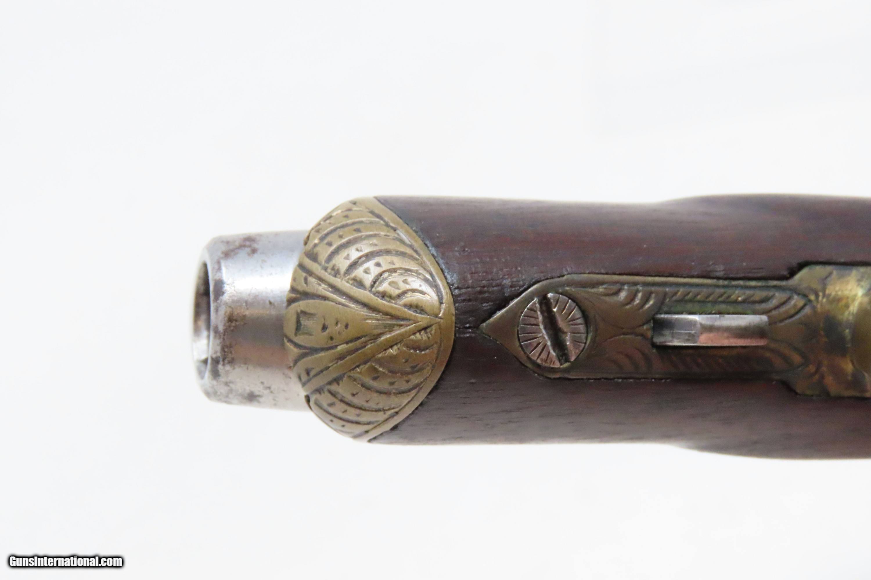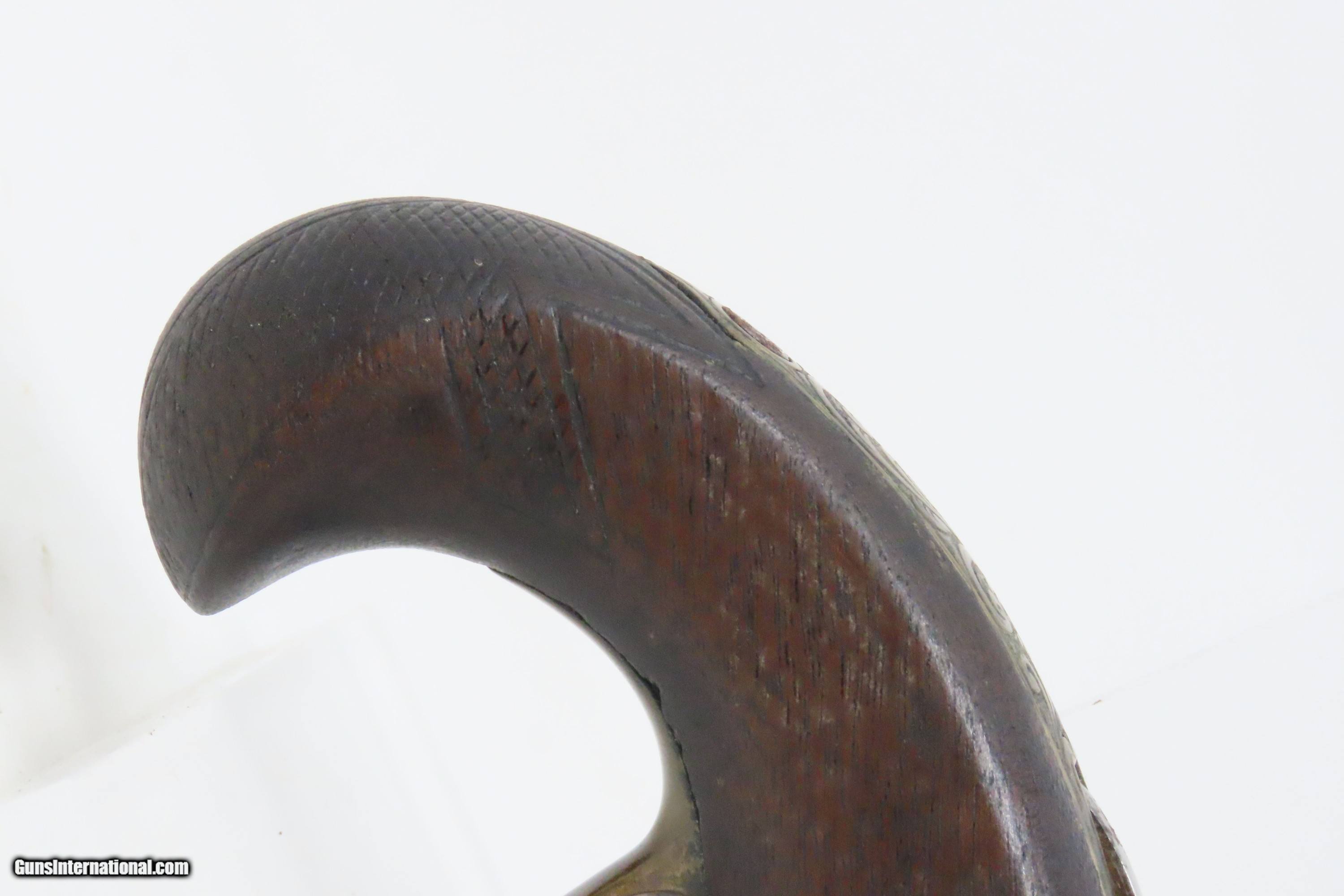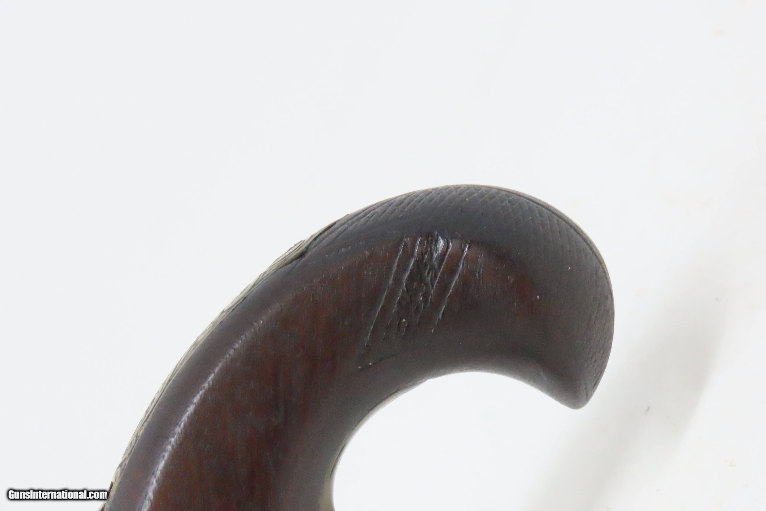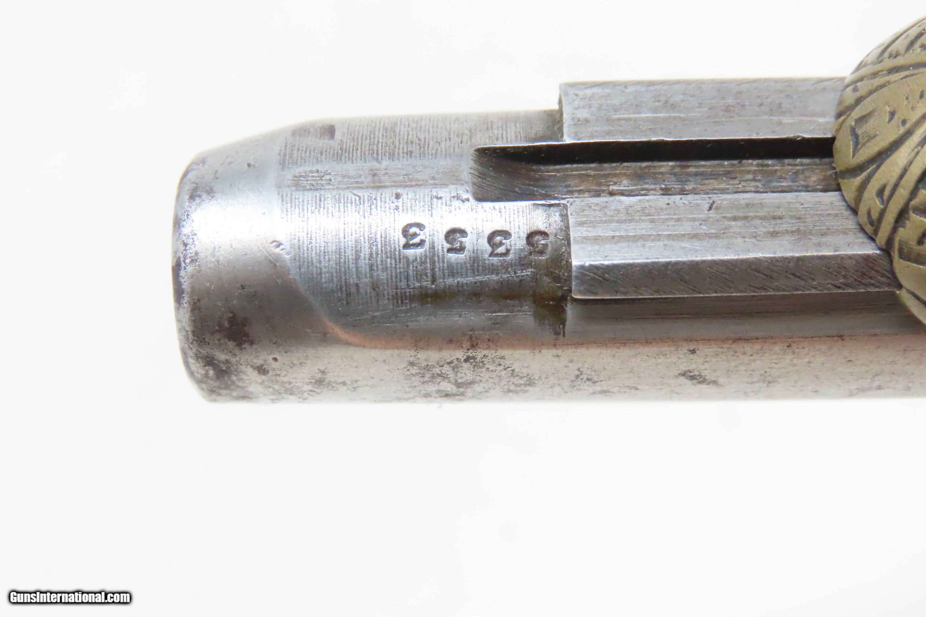 Description: ENGRAVED Antique WILLIAMSON Single Shot CONVERTIBLE .41 Deringer w/ADAPTER RF/Percussion Combination Pistol w/ PERCUSSION ADAPTER Here we present an antique Williamson Deringer, made circa 1867 in Brooklyn, New York with a production run between 1866 and 1870. According to “Flayderman's Guide to Antique American Firearms”, this was invented by David Williamson and this unique design that was meant to be the stopgap between a time when the benefits of cartridge pistols were obvious and desirable, but ammunition supply in certain places was questionable. He chambered his deringer for the .41 rimfire cartridge, but included a small adapter that allowed the user to use it as a percussion pistol as well. The hammer was such that it would strike the percussion cap if the adapter was being used (see the hole in the center of the breech face), but also had a rimfire striker when that ammunition was used. Fewer than 10,000 of these were made between the Moore’s Patent Fire Arms Company and National Fire Arms Company. The design shows a clear likeness to Henry Deringer's original percussion single shot pistol from the 1840s, especially in size and profile. It even uses Deringer’s distinctive wrap-around checkering on the grip handle. This is a hard to find pistol and even harder to find one in this condition that includes the Percussion Adapter! The overall condition is very good. Strong action. The bore is semi-bright with nice rifling. Legible markings. Good wood with light handling wear. 85% of the brass is engraved with traditional floral designs. Own the original! This is a legitimate antique and not a reproduction. Barrel is 2-1/2 inches. Caliber: .41 Rimfire or .41 Percussion Overall condition as seen in photos. Very Fast. Very Safe. FREE SHIPPING WORLDWIDE. Delivered directly to your door by express mail! Guaranteed AUTHENTIC & Includes CERTIFICATE OF AUTHENTICITY. ancestryguns $1200 #233250 SOLD Antique: Yes |