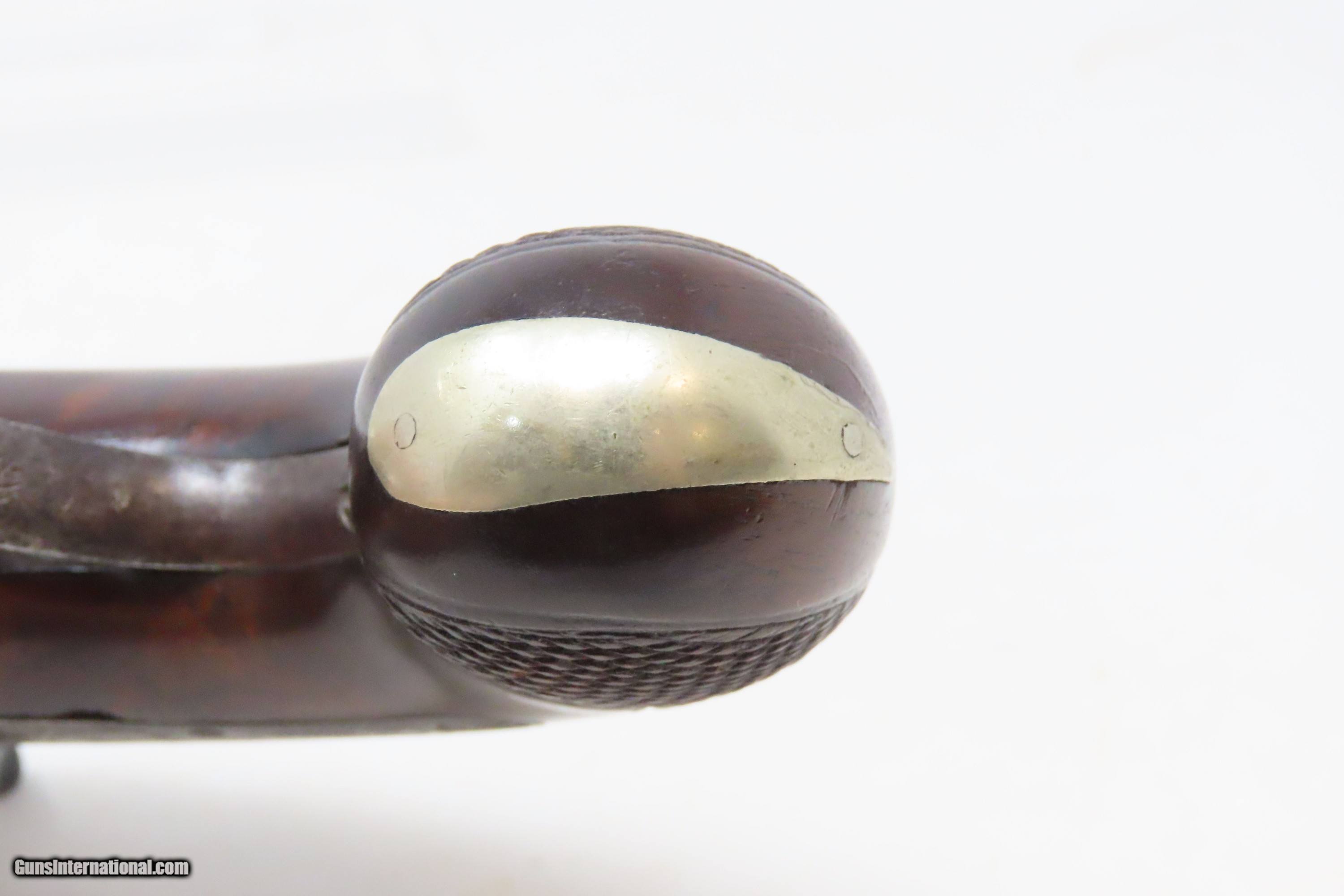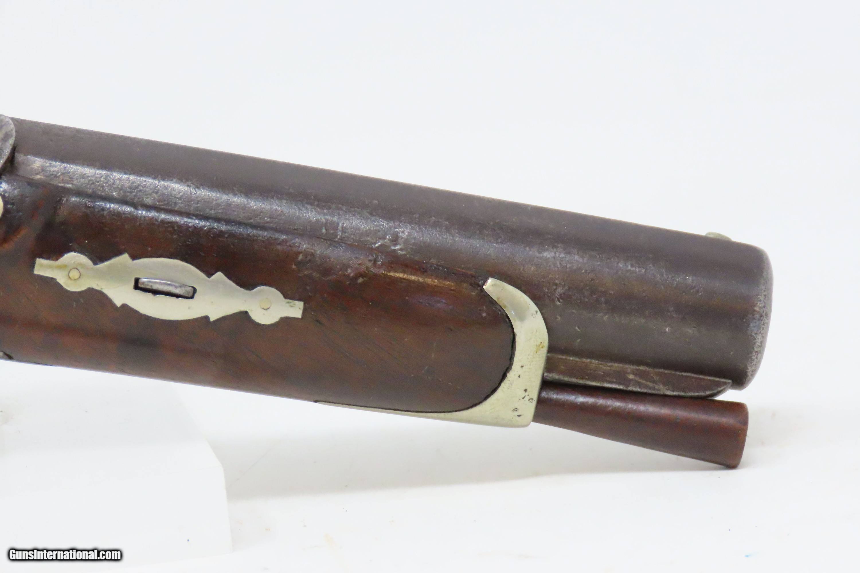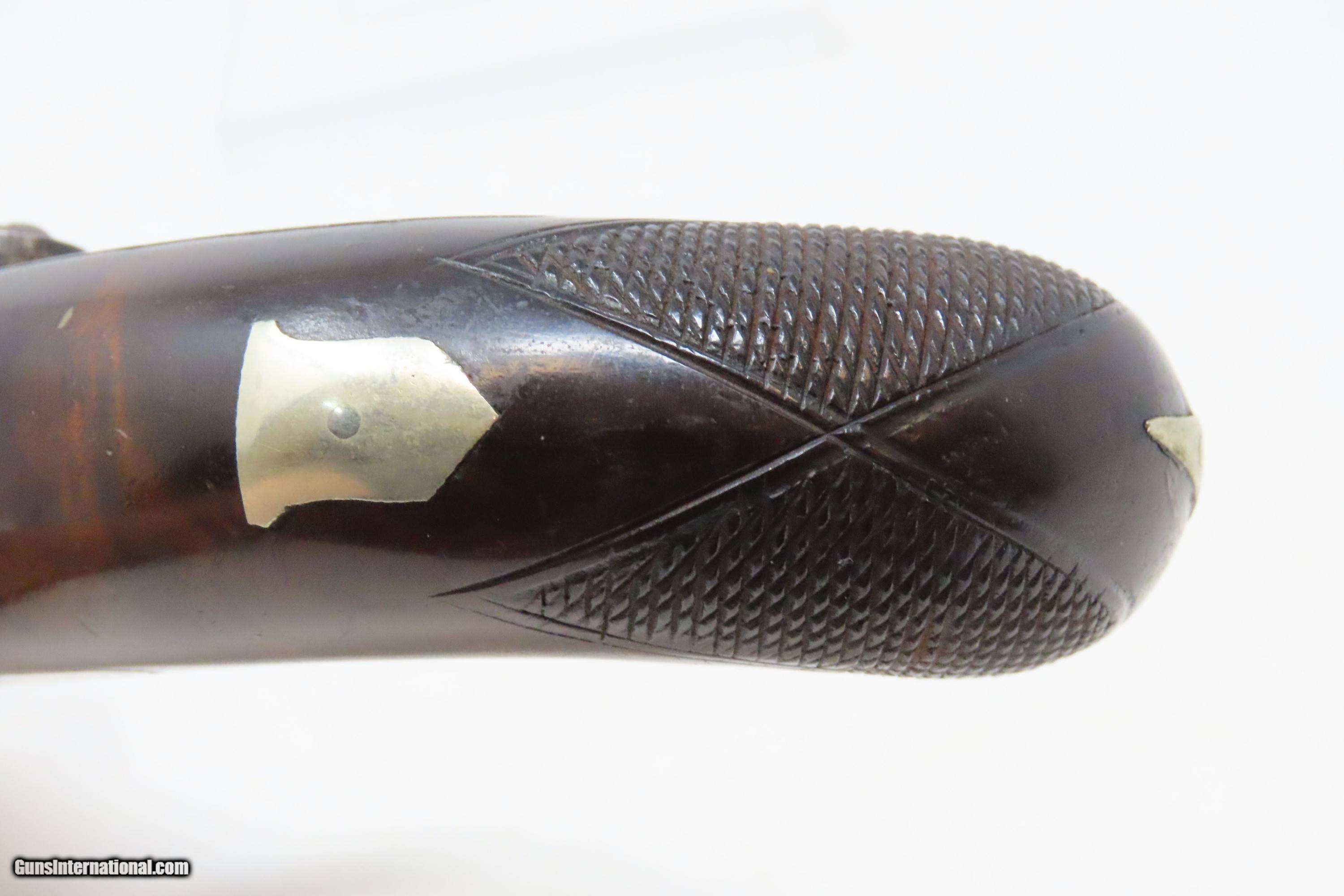 Description: ENGRAVED & SILVER Mounted Antique DERINGER Percussion Pistol KILLED LINCOLN Henry Deringer’s Famous 1850s Pocket Pistol Here we present an antique Henry Deringer Percussion Pistol, made circa 1850s in Philadelphia, Pennsylvania. President Abraham Lincoln was shot and killed with one of Henry Deringer’s pocket sized percussion pistols, the night John Wilkes Booth revenged the South at the Ford Theater. Henry Deringer was a very successful Pennsylvanian gunsmith who started his own company in his early twenties, circa 1809. It was not until the 1850s that his prototypical “Deringer” percussion pistol became extremely popular. Once it did become popular, the basic design was copied in dozens of different shops. Not only was it copied, but Deringer’s good name was stamped on guns made by others, some of them not up to the quality standards of Deringer himself. The inventor was apparently very worried about protecting his good name, so he pursued and sued any of the counterfeiters that he could find and warned the buying public to beware of his spurious imitators. The name “Deringer” often invokes certain historical event, characters or moments in film. Deringer’s name has become both a noun and a catch-all term. They conjure images of the California Gold Rush, as well as riverboat gamblers. These pistols were very practical for the time, being small and concealable and of large bore size. Here is what Charles Edwin Chapel had to say about the Deringer pistol: “For a man in a tight spot, with an armed enemy only a few feet away, a pair of single-shot Deringer pistols was more effective than the multi-shot pepperbox. You either got your man at the first or second shot—if, indeed, you were given the chance to fire twice—or you got a fast funeral. That heavy-calibered little gun was a man-stopper at short range, an effective surprise weapon, an “equalizer” with which many a gold-camp David permanently tamed the muscle-bulging, belligerent Goliaths of the frontier. Included in a man’s personal arsenal, the pistol was carried either as a principal weapon or as a reserve to be used when revolver, pepperbox or Bowie knife failed.” The overall condition is very good. Patina throughout. The action is excellent and strong. The bore is patinated with good rifling. The stock has been very nicely repaired during the period of use and has German silver crescent moons as part of the repair. Otherwise, very solid and the wood has nice figure. Own the original! This is a legitimate antique and not a reproduction. Barrel is 5 inches. Caliber: .44 Percussion Overall condition as seen in photos. Very Fast. Very Safe. FREE SHIPPING WORLDWIDE. Delivered directly to your door by express mail! Guaranteed AUTHENTIC & Includes CERTIFICATE OF AUTHENTICITY. ancestryguns $2400 #240200 SOLD Antique: Yes |