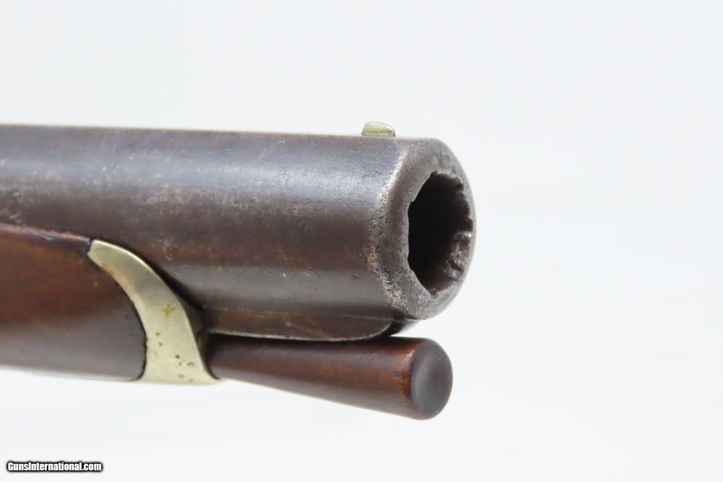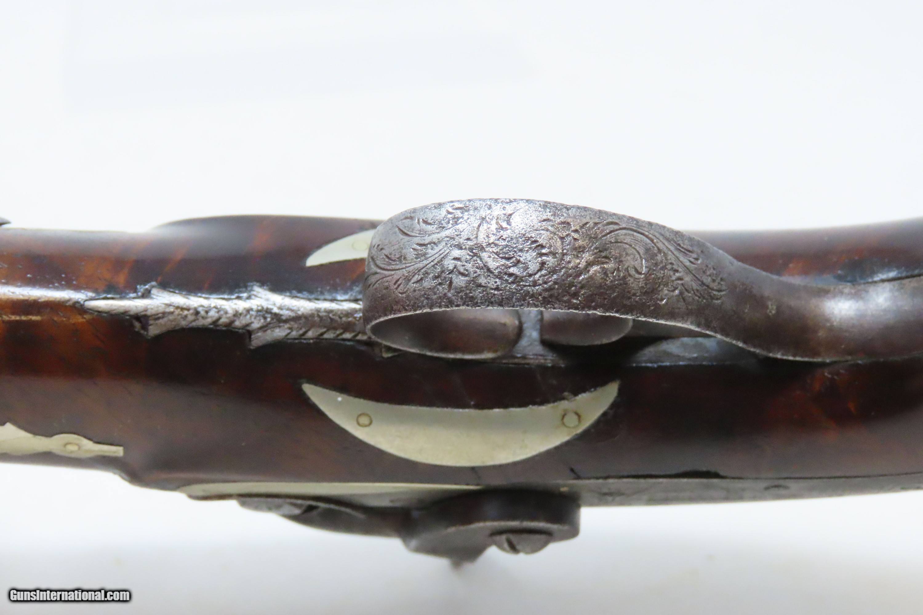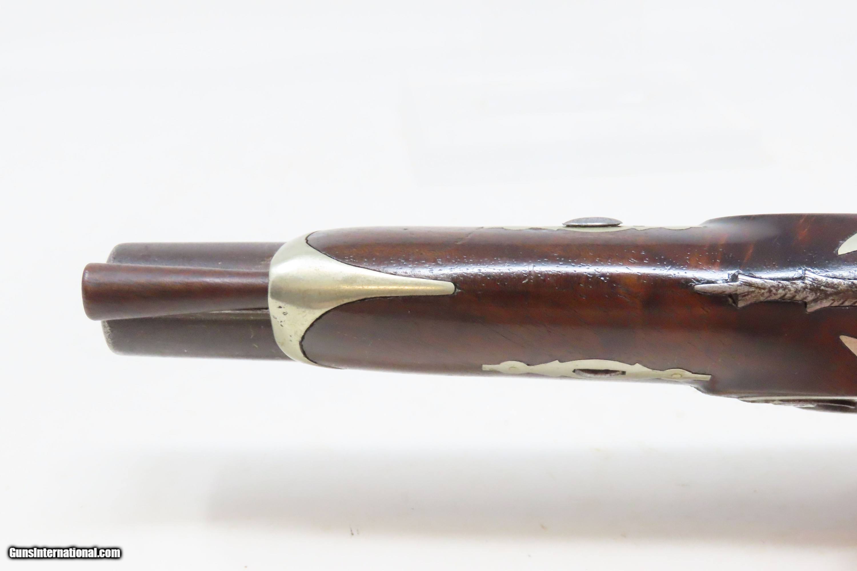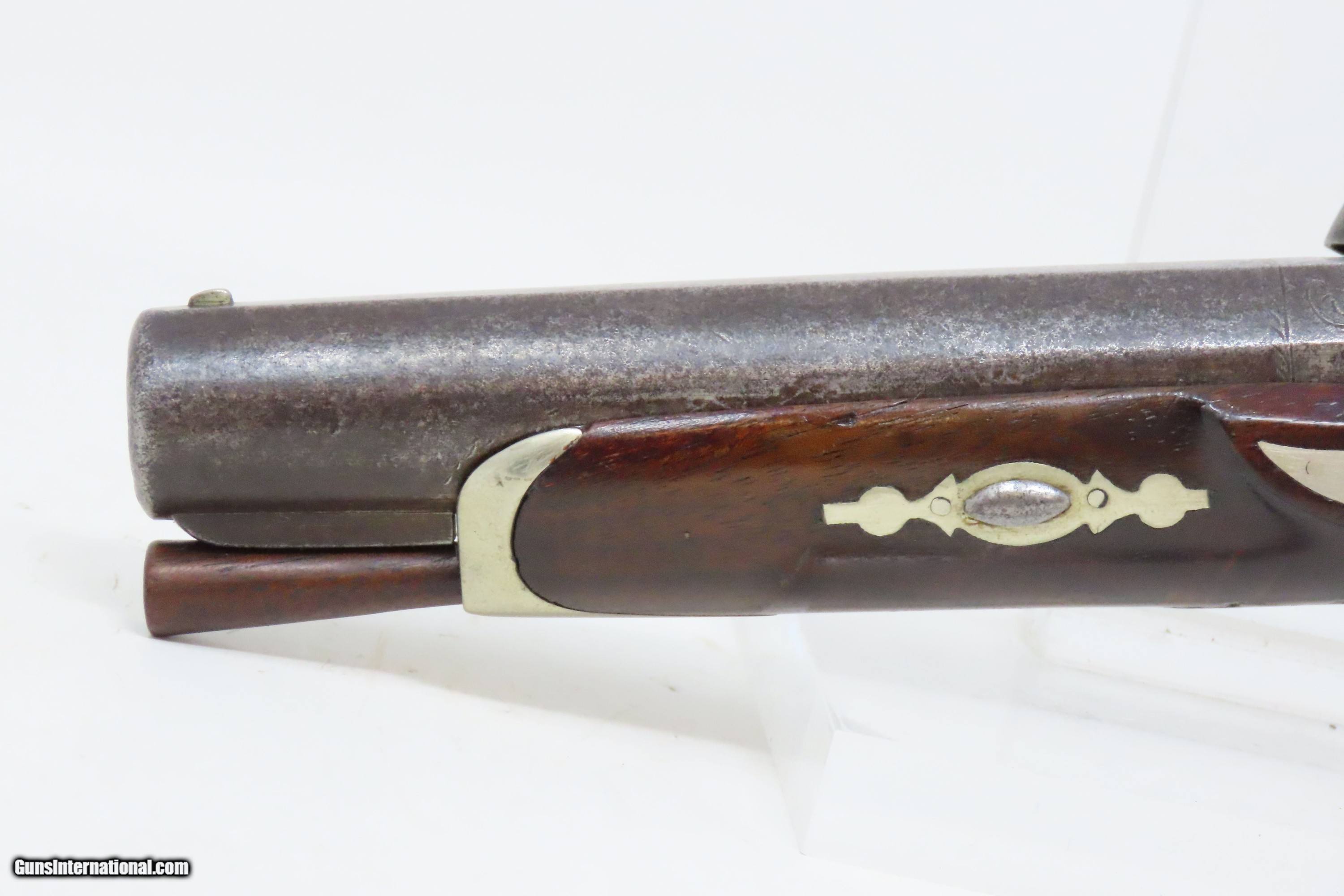Description: ENGRAVED & SILVER Mounted Antique DERINGER Percussion Pistol KILLED LINCOLN Henry Deringer’s Famous 1850s Pocket Pistol Here we present an antique Henry Deringer Percussion Pistol, made circa 1850s in Philadelphia, Pennsylvania. President Abraham Lincoln was shot and killed with one of Henry Deringer’s pocket sized percussion pistols, the night John Wilkes Booth revenged the South at the Ford Theater. Henry Deringer was a very successful Pennsylvanian gunsmith who started his own company in his early twenties, circa 1809. It was not until the 1850s that his prototypical “Deringer” percussion pistol became extremely popular. Once it did become popular, the basic design was copied in dozens of different shops. Not only was it copied, but Deringer’s good name was stamped on guns made by others, some of them not up to the quality standards of Deringer himself. The inventor was apparently very worried about protecting his good name, so he pursued and sued any of the counterfeiters that he could find and warned the buying public to beware of his spurious imitators. The name “Deringer” often invokes certain historical event, characters or moments in film. Deringer’s name has become both a noun and a catch-all term. They conjure images of the California Gold Rush, as well as riverboat gamblers. These pistols were very practical for the time, being small and concealable and of large bore size. Here is what Charles Edwin Chapel had to say about the Deringer pistol: “For a man in a tight spot, with an armed enemy only a few feet away, a pair of single-shot Deringer pistols was more effective than the multi-shot pepperbox. You either got your man at the first or second shot—if, indeed, you were given the chance to fire twice—or you got a fast funeral. That heavy-calibered little gun was a man-stopper at short range, an effective surprise weapon, an “equalizer” with which many a gold-camp David permanently tamed the muscle-bulging, belligerent Goliaths of the frontier. Included in a man’s personal arsenal, the pistol was carried either as a principal weapon or as a reserve to be used when revolver, pepperbox or Bowie knife failed.” The overall condition is very good. Patina throughout. The action is excellent and strong. The bore is patinated with good rifling. The stock has been very nicely repaired during the period of use and has German silver crescent moons as part of the repair. Otherwise, very solid and the wood has nice figure. Own the original! This is a legitimate antique and not a reproduction. Barrel is 5 inches. Caliber: .44 Percussion Overall condition as seen in photos. Very Fast. Very Safe. FREE SHIPPING WORLDWIDE. Delivered directly to your door by express mail! Guaranteed AUTHENTIC & Includes CERTIFICATE OF AUTHENTICITY. ancestryguns $2400 #240200 SOLD Antique: Yes |