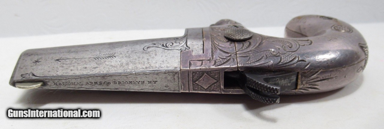 FINE NATIONAL ARMS CO. DERINGER No.1 MADE by MOORE from COLLECTING TEXAS – 41 RF CALIBER – SILVER PLATED BRASS FRAME