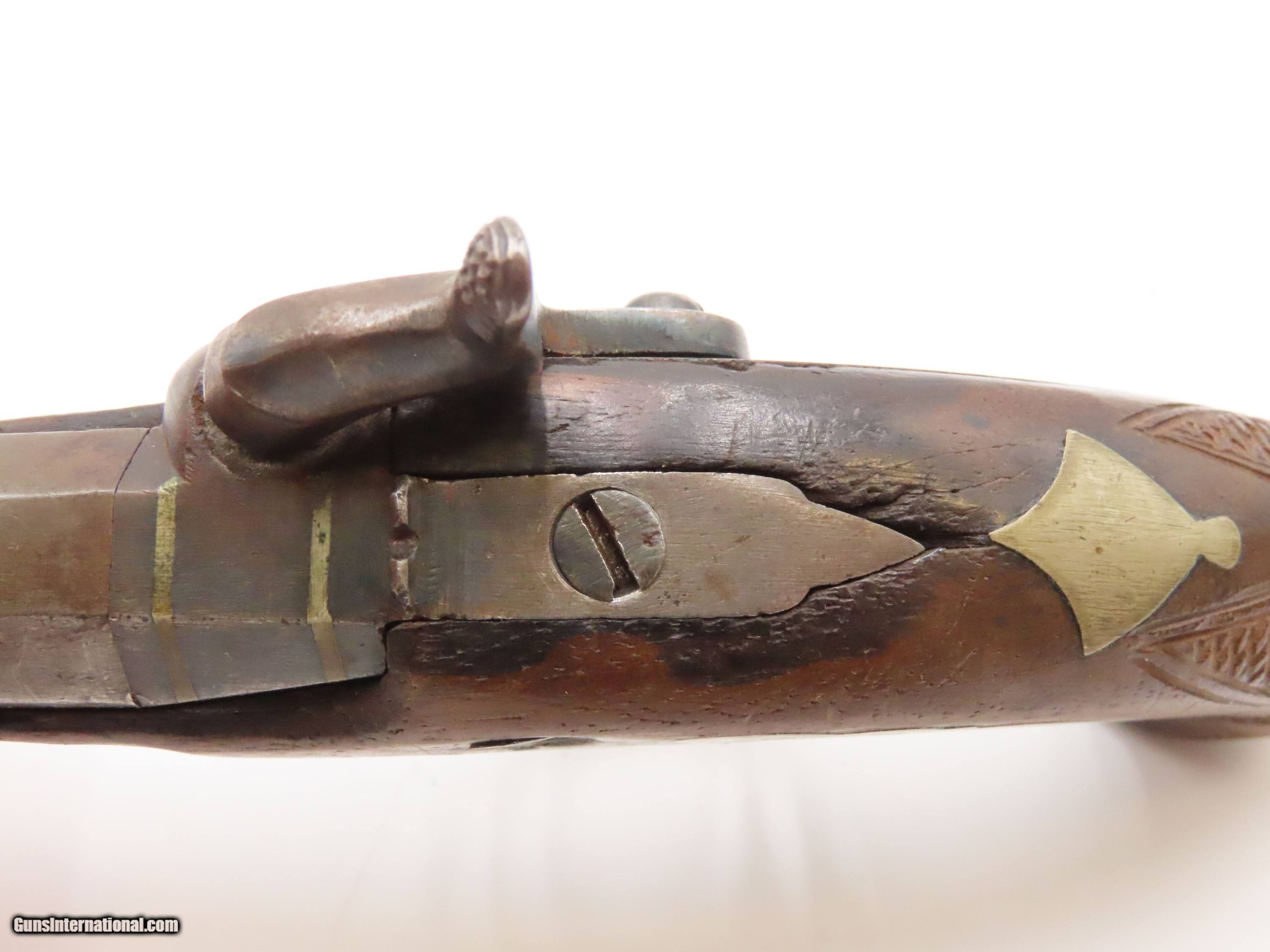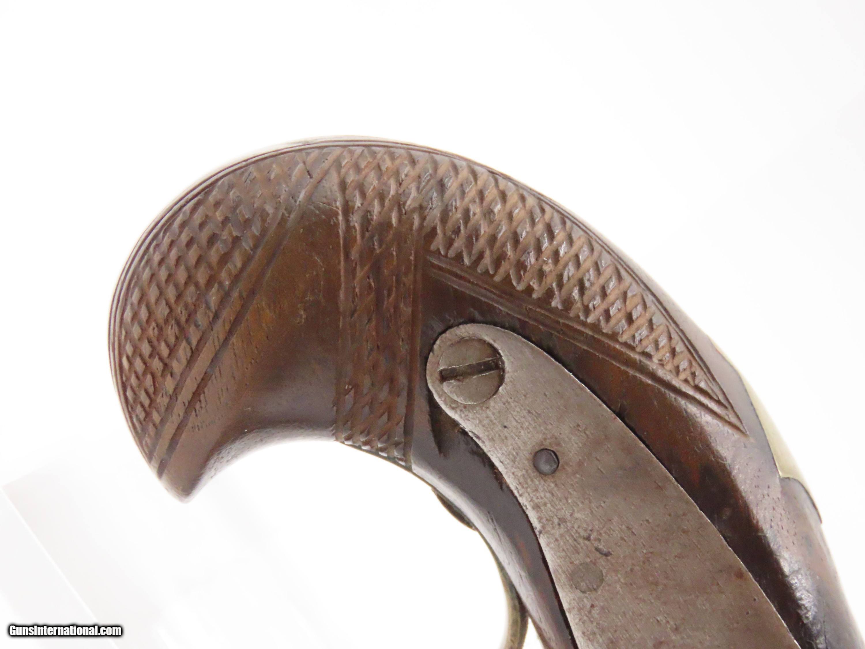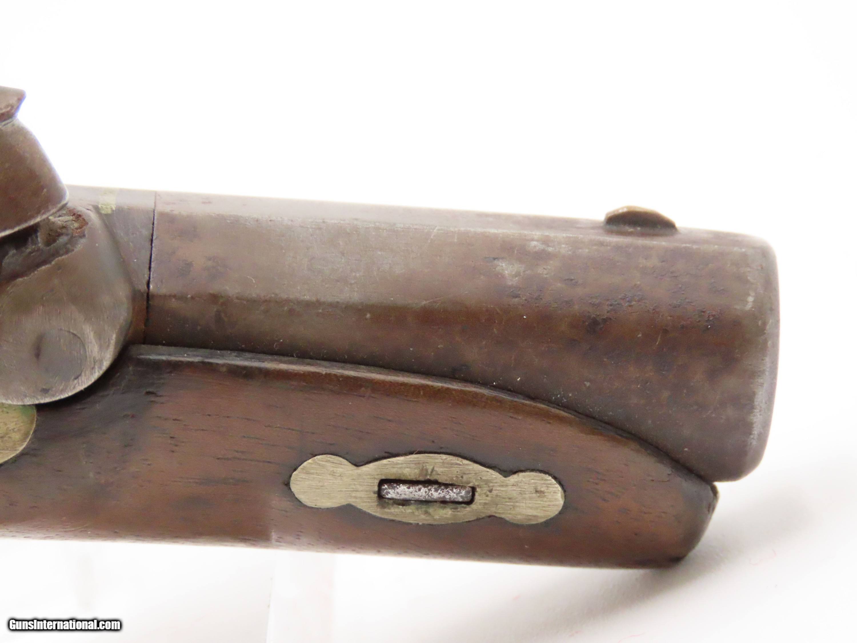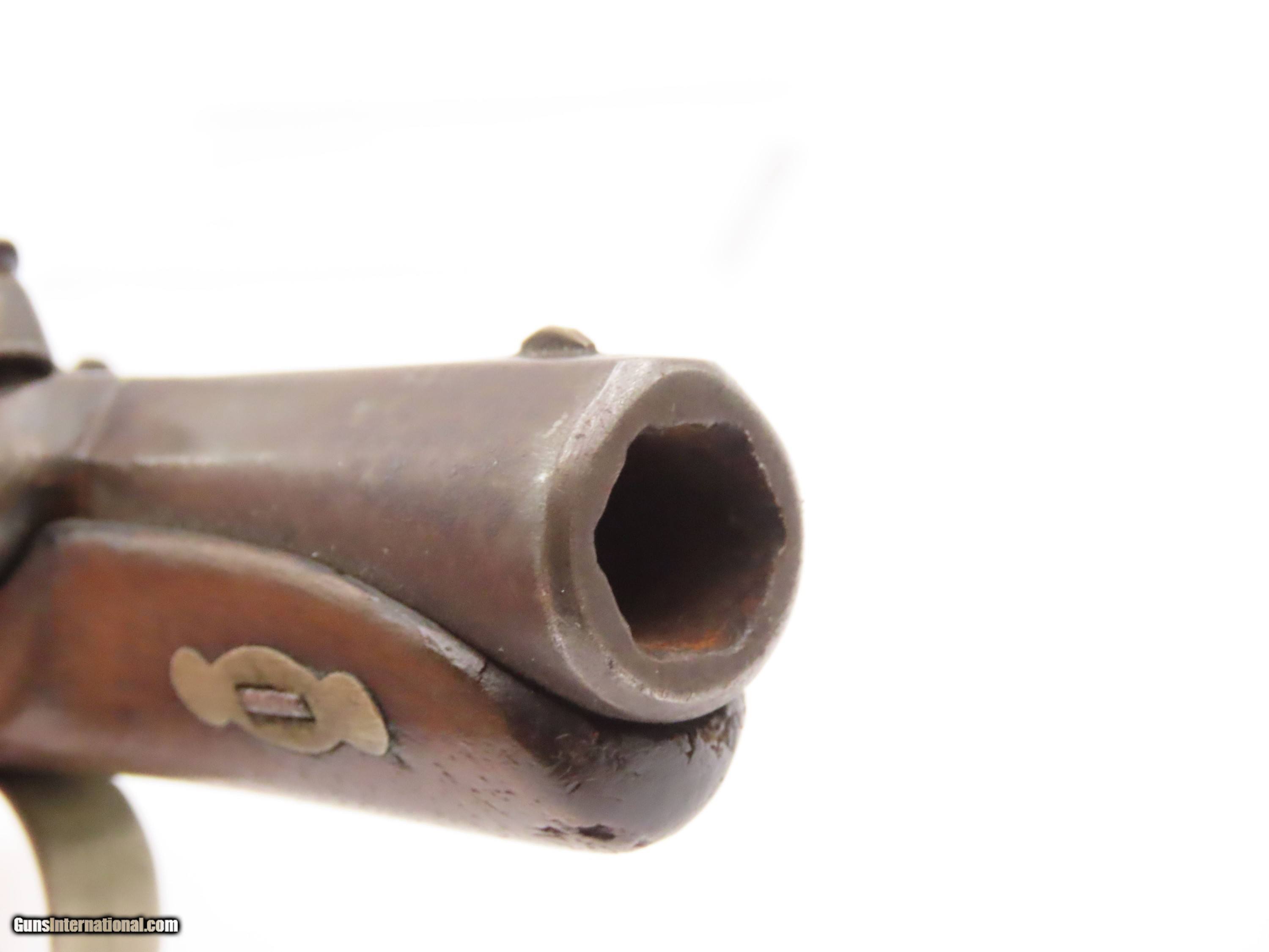 Description: German SILVER Mounted Antique Copy DERRINGER Percussion Pocket Pistol Period Copy of Henry Deringer’s Famous Pistol Here we present an antique Period Copy of Henry Deringer’s Percussion Pocket Pistol, made circa the 1850s. Henry Deringer was a very successful Pennsylvanian gunsmith who started his own company in his early twenties, circa 1809. It was not until the 1850s that his prototypical “Deringer” percussion pistol became extremely popular. Once it did become popular, the basic design was copied in dozens of different shops. Not only was it copied, but Deringer’s good name was stamped on guns made by others, some of them not up to the quality standards of Deringer himself. The inventor was apparently very worried about protecting his good name, so he pursued and sued any of the counterfeiters that he could find and warned the buying public to beware of his spurious imitators. The name “Deringer” often invokes certain historical event, characters or moments in film. Deringer’s name has become both a noun and a catch-all term. President Abraham Lincoln was shot and killed with one of Henry Deringer’s pocket sized percussion pistols, the night John Wilkes Booth revenged the South at the Ford Theater. They conjure images of the California Gold Rush, as well as riverboat gamblers. These pistols were very practical for the time, being small and concealable and of large bore size. The overall condition is good. Strong action. Good bore for its age. Solid wood throughout, with a few this cracks on the left side. Any markings that were once present on the lock have worn. Own the original! This is a legitimate antique and not a reproduction. Barrel is 1-3/4 inches. Caliber: .44 Percussion Overall condition as seen in photos. Very Fast. Very Safe. FREE SHIPPING WORLDWIDE. Delivered directly to your door by express mail! Guaranteed AUTHENTIC & Includes CERTIFICATE OF AUTHENTICITY. ancestryguns $1150 #250159 SOLD Antique: Yes |