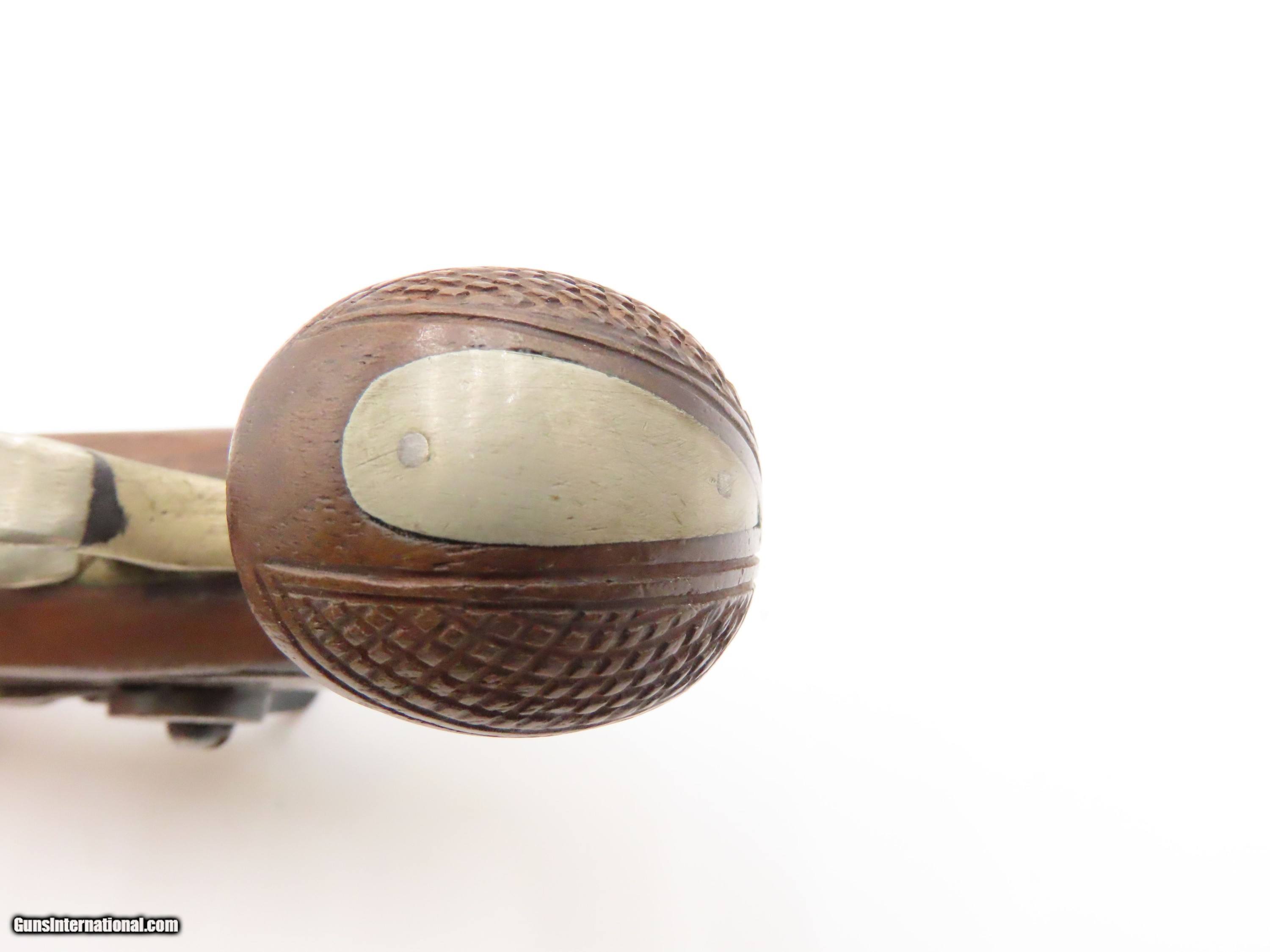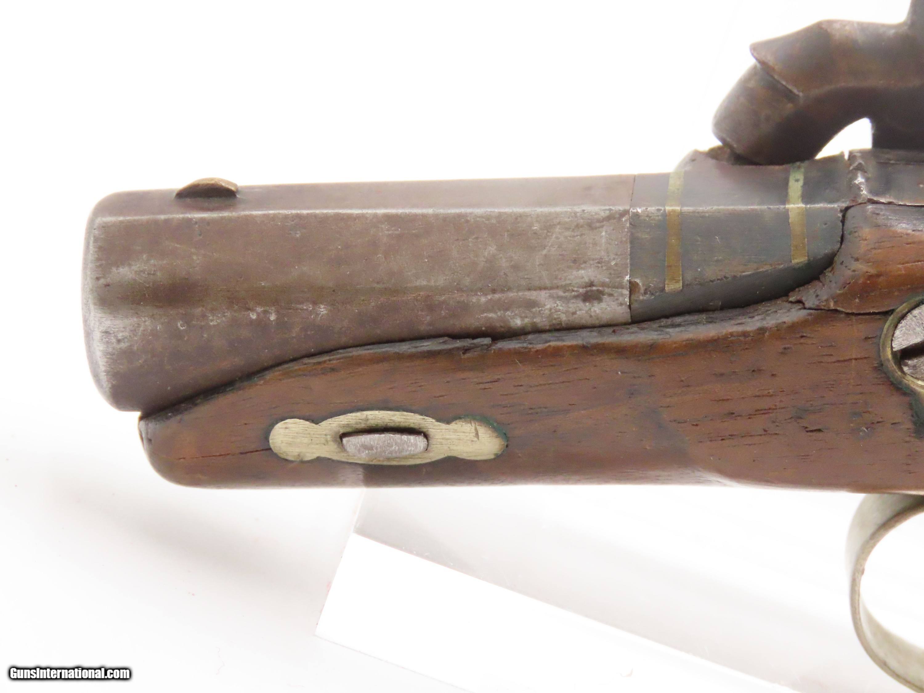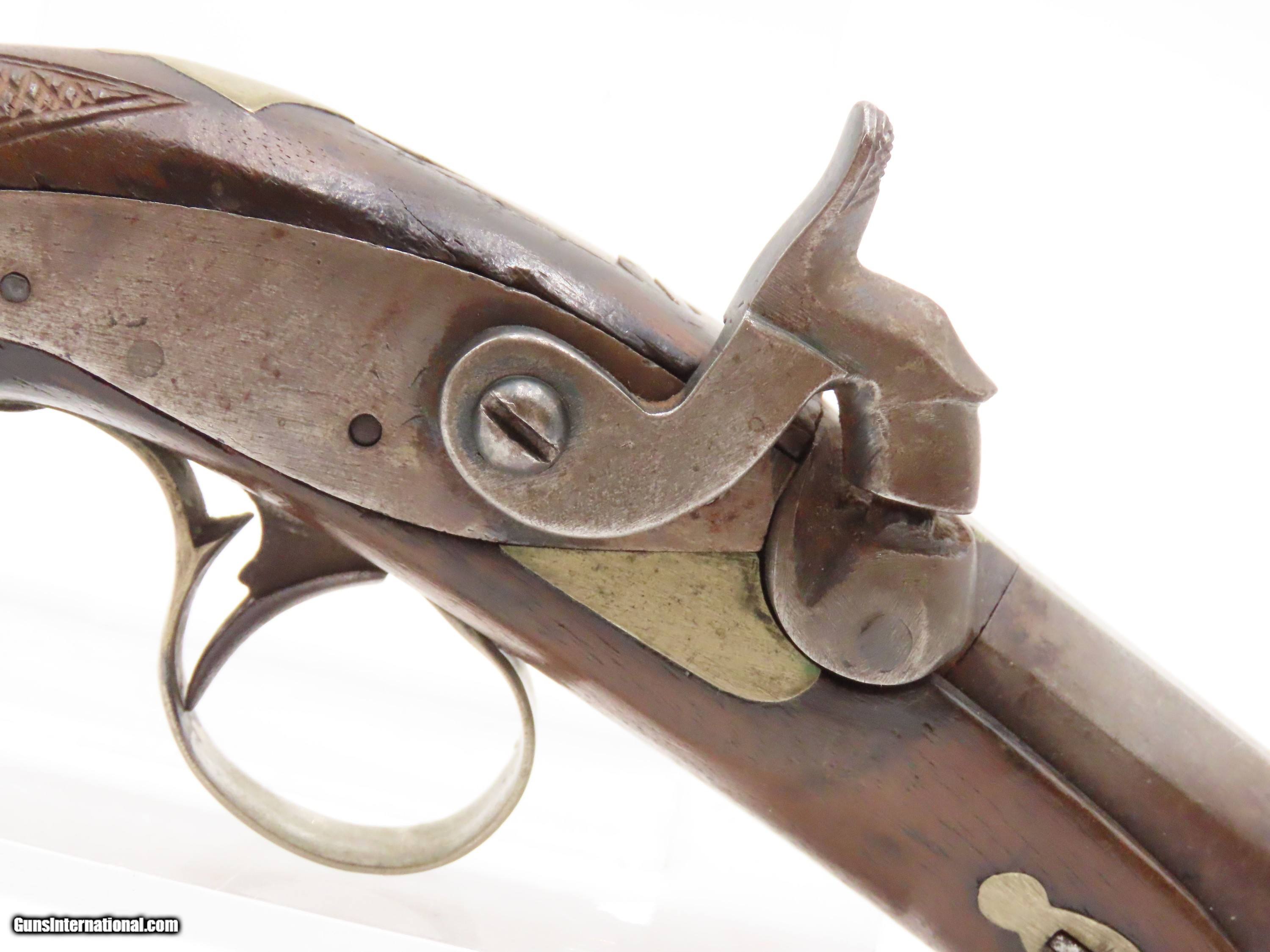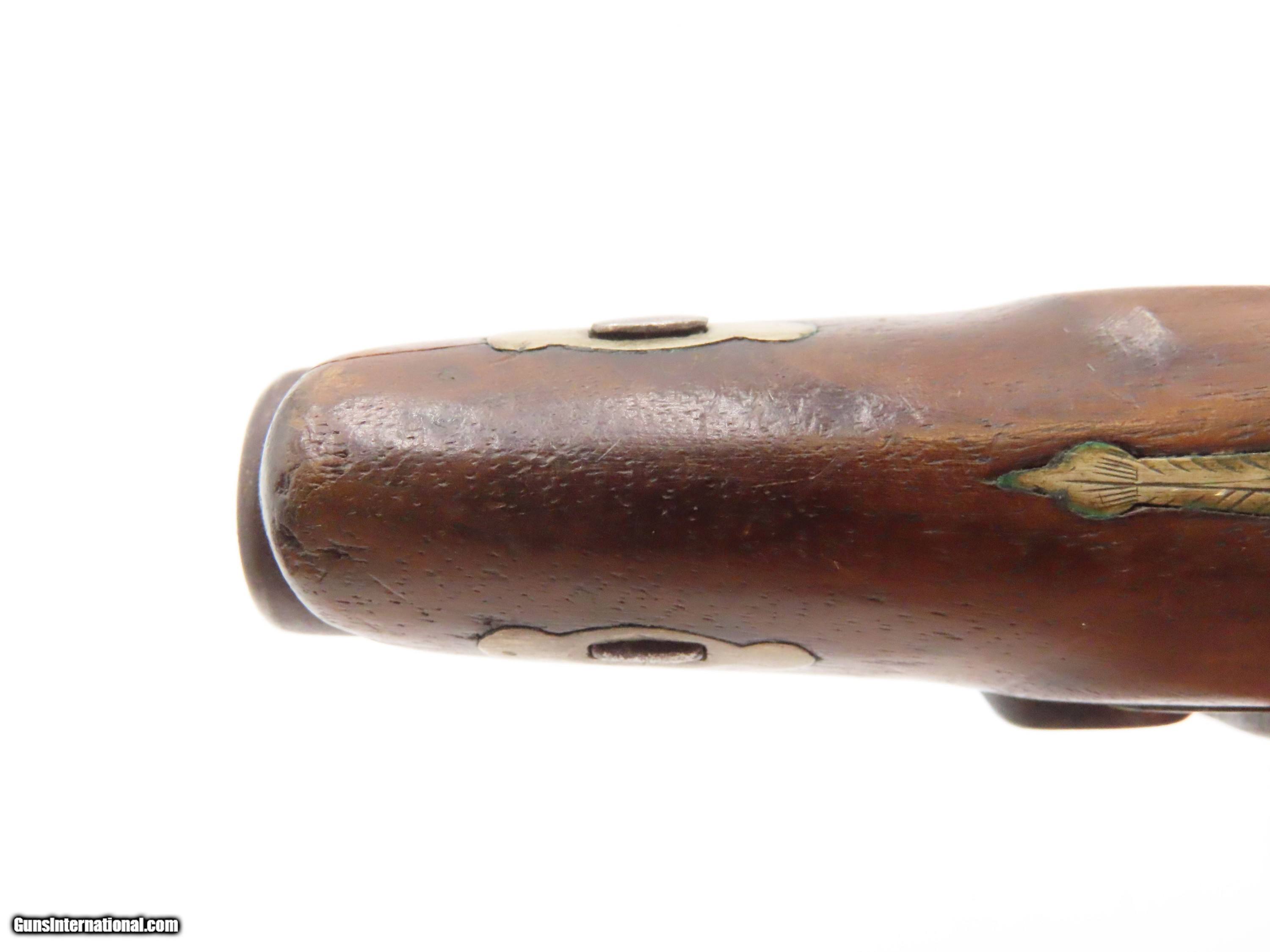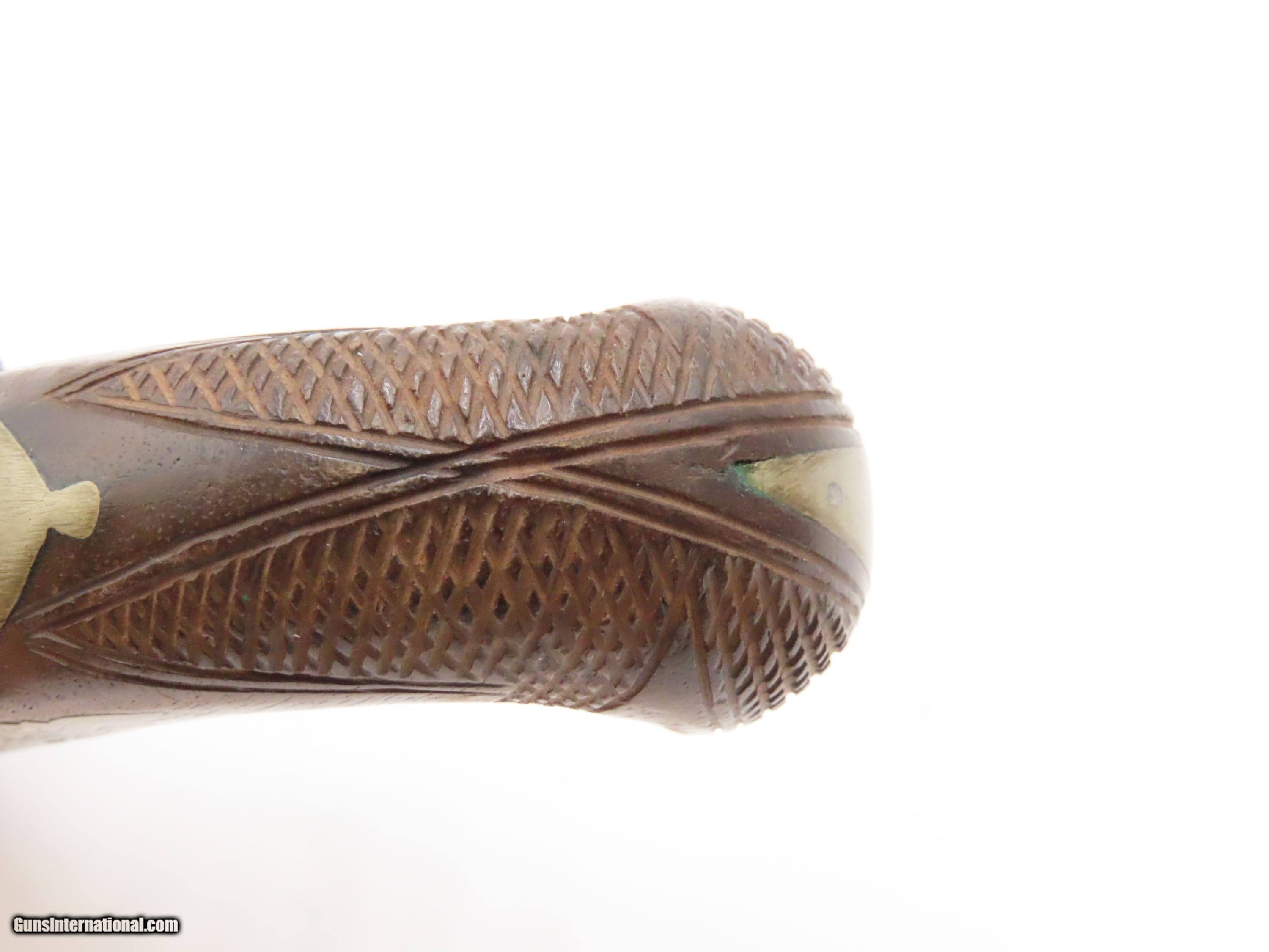 Description: German SILVER Mounted Antique Copy DERRINGER Percussion Pocket Pistol Period Copy of Henry Deringer’s Famous Pistol Here we present an antique Period Copy of Henry Deringer’s Percussion Pocket Pistol, made circa the 1850s. Henry Deringer was a very successful Pennsylvanian gunsmith who started his own company in his early twenties, circa 1809. It was not until the 1850s that his prototypical “Deringer” percussion pistol became extremely popular. Once it did become popular, the basic design was copied in dozens of different shops. Not only was it copied, but Deringer’s good name was stamped on guns made by others, some of them not up to the quality standards of Deringer himself. The inventor was apparently very worried about protecting his good name, so he pursued and sued any of the counterfeiters that he could find and warned the buying public to beware of his spurious imitators. The name “Deringer” often invokes certain historical event, characters or moments in film. Deringer’s name has become both a noun and a catch-all term. President Abraham Lincoln was shot and killed with one of Henry Deringer’s pocket sized percussion pistols, the night John Wilkes Booth revenged the South at the Ford Theater. They conjure images of the California Gold Rush, as well as riverboat gamblers. These pistols were very practical for the time, being small and concealable and of large bore size. The overall condition is good. Strong action. Good bore for its age. Solid wood throughout, with a few this cracks on the left side. Any markings that were once present on the lock have worn. Own the original! This is a legitimate antique and not a reproduction. Barrel is 1-3/4 inches. Caliber: .44 Percussion Overall condition as seen in photos. Very Fast. Very Safe. FREE SHIPPING WORLDWIDE. Delivered directly to your door by express mail! Guaranteed AUTHENTIC & Includes CERTIFICATE OF AUTHENTICITY. ancestryguns $1150 #250159 SOLD Antique: Yes |