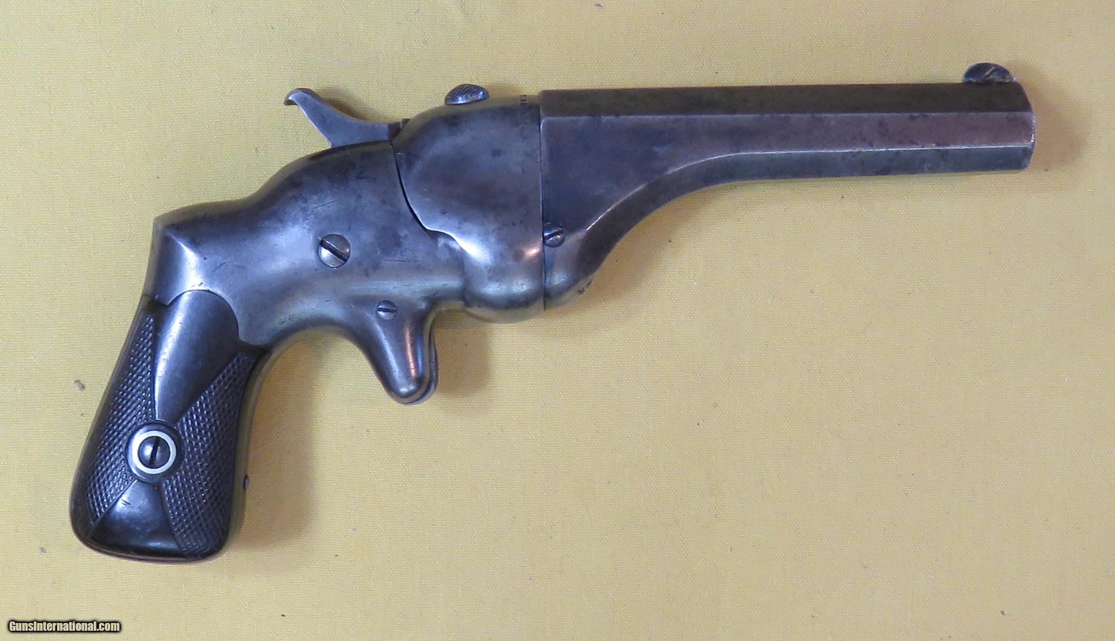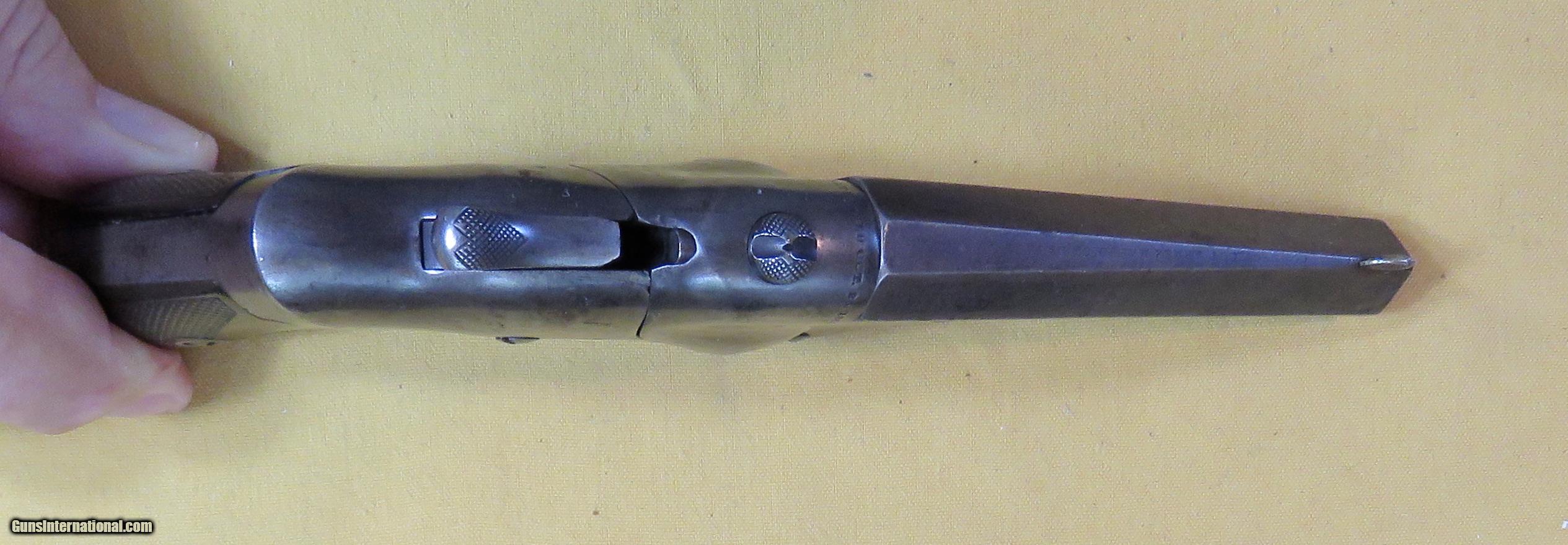 Description: Connecticut Arms Manufacturing Co Naubuc Conn "Hammond Bull Dog" 44 cal derringer. Ca 1866-1880. Chambered for the rare "44rf for pistol" caliber, a short-case rimfire 44. This gun is complete and original, with traces of original blue on the barrel. The case colored frame and breechblock have faded to a silver/gray. The markings are excellent. The action is fine. The 'gutta percha' grips are excellent with no cracks or chips and have the original grip screw. The serial is 17xx. The front sight looks original but has two pieces of old solder stuck to it, one on each side, so it is possibly an old replacement. The metal surfaces of the gun are very good, with a little wear and staining commensurate with handling and use. The bore is only fair. This is the biggest caliber American derringer of the period. SOLD Antique: Yes Manufacturer: Connecticut Arms Co. Model: Hammond Bull Dog Serial Number: 17xx Caliber Info: 44 |