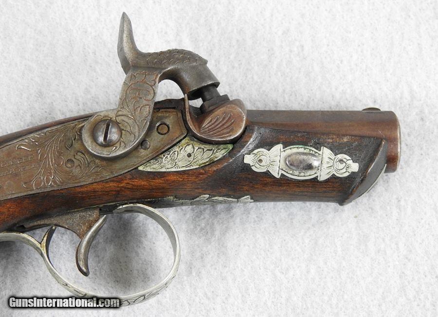 Description: This is a nice copy but does not have wart steel on the barrel side It does have the Sun Burst P. The mechanical function is very good crips and tight and the bore is very good and bright. The wood is very nice condition and the checkering is sharp. I would consider trades for pre 1899 ANTIQUE PISTOLS and rifles on any of my items.. WHAT DO YOU HAVE TO TRADE? Ask about our 30-90 day lay-away program. We accept Bank Check, Money order, Personal checks or wire transfer. SOLD Antique: Yes Manufacturer: Henry Deringer - Copy |