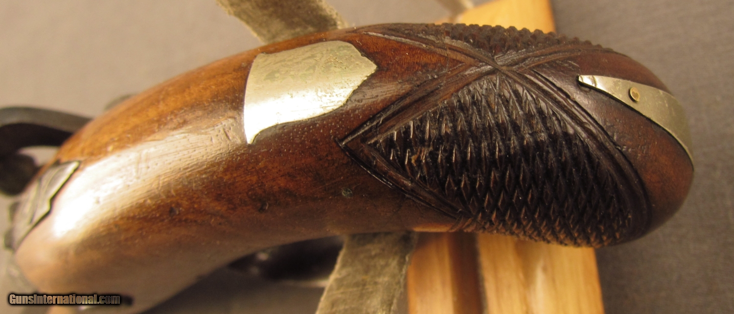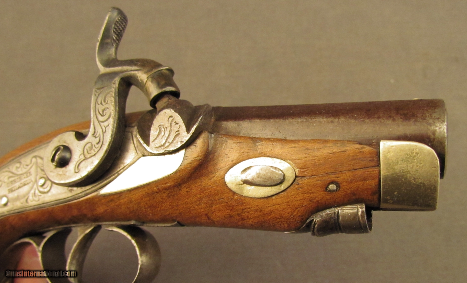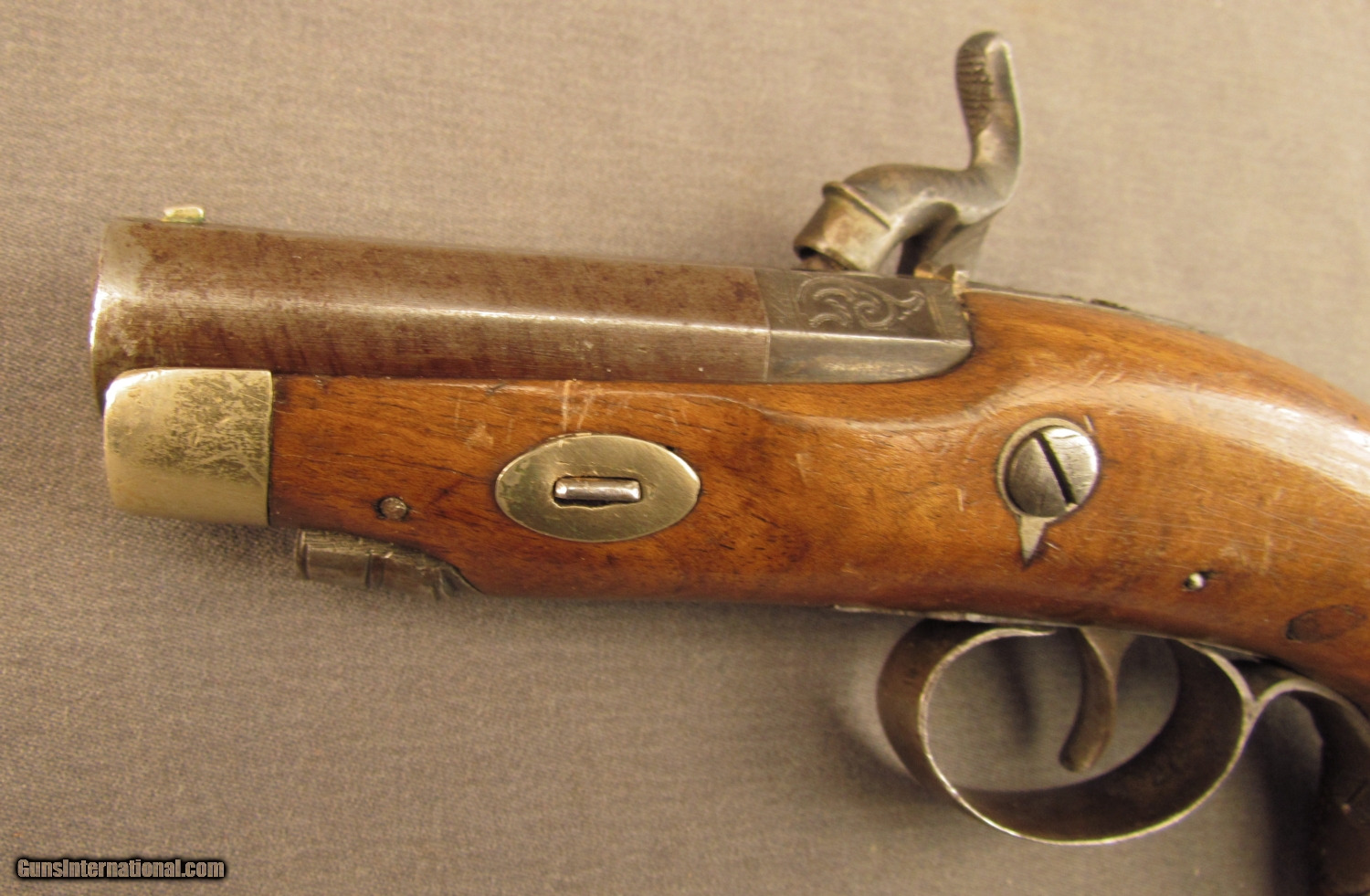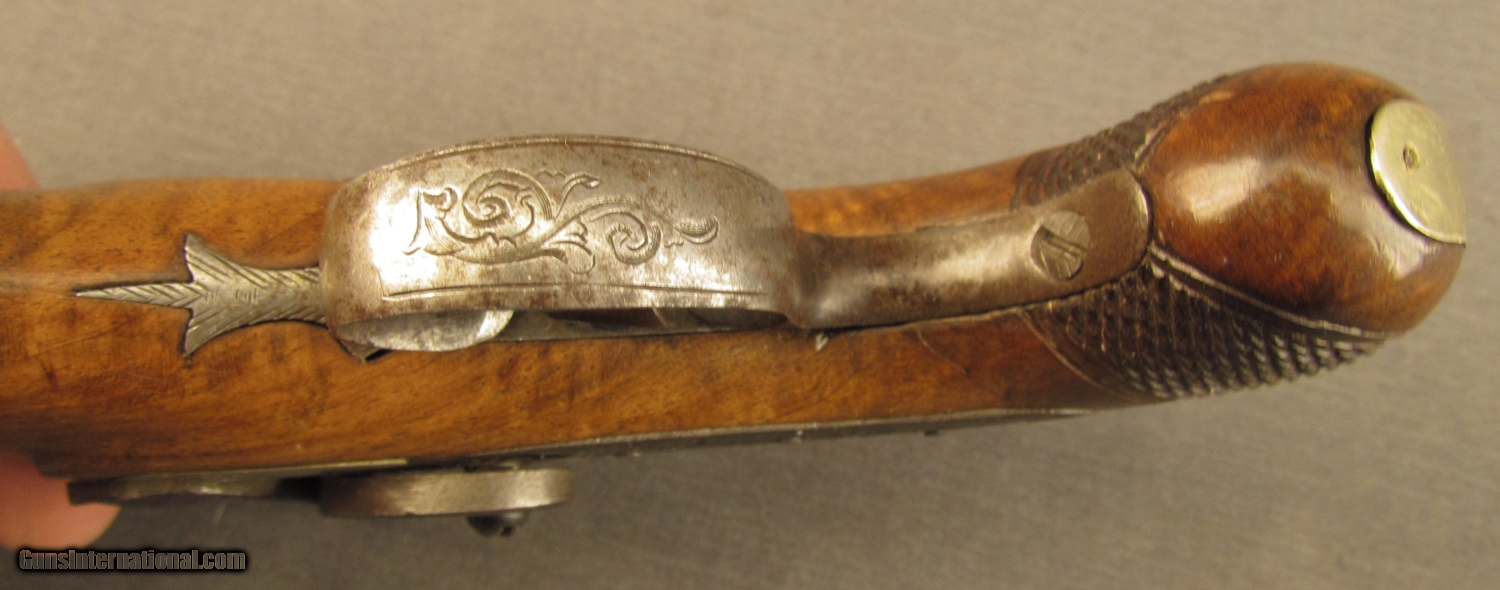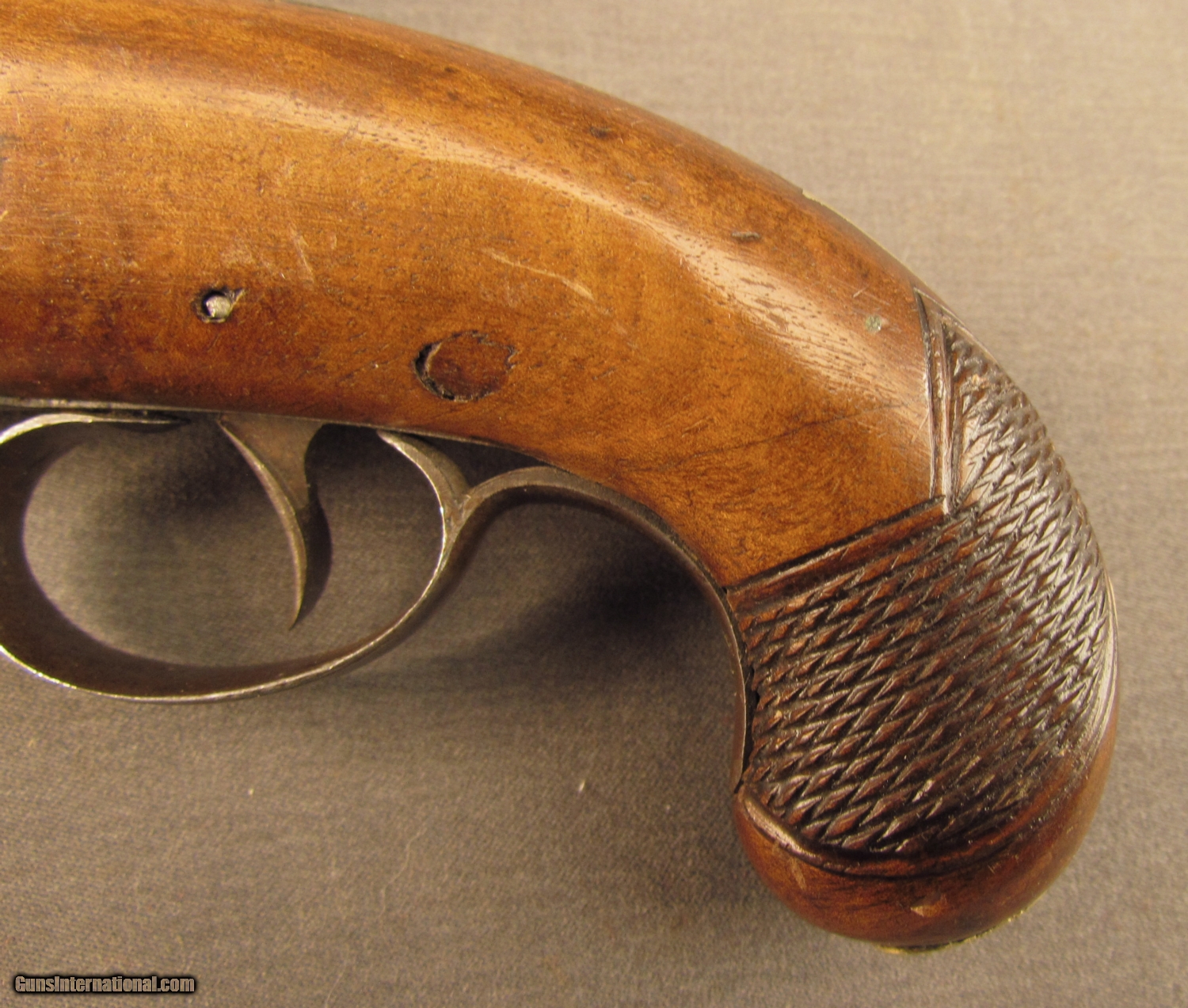 Description: NSN, .44 Caliber, 2 7/8” barrel with a good, lightly pitted bore. This is an original “DERINGER/PHILAD'A” marked pistol that has an overall dark plum-brown patina with some of the original browning still present on the barrel. There is simple scrollwork engraving along the back-action lockplate, on the hammer, and on the barrel breech and nipple bolster. The underside of the barrel has extensive Birmingham proofs with two deeply struck “XVI” fore and aft of the wedge bracket. The lightly sanded walnut stock has numerous small handlking marks and minor blemishes throughout with a single with-the-grain crack running from the German silver nosecap to the wedge bolster. The checkering at the bag-shaped grip is still sharp, and the teardrop shaped inset along the back is still in place. The grip does show a nicely repaired crack running from one side to the other. The ramrod is no longer present, but the action is still rather tight and fully functional. This is an in SOLD Antique: Yes Manufacturer: Deringer Model: Pistol Caliber Info: .44 Cal Gauge Info: .44 Cal |