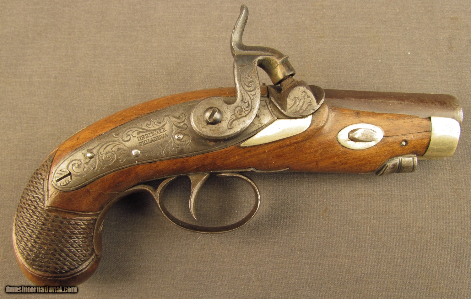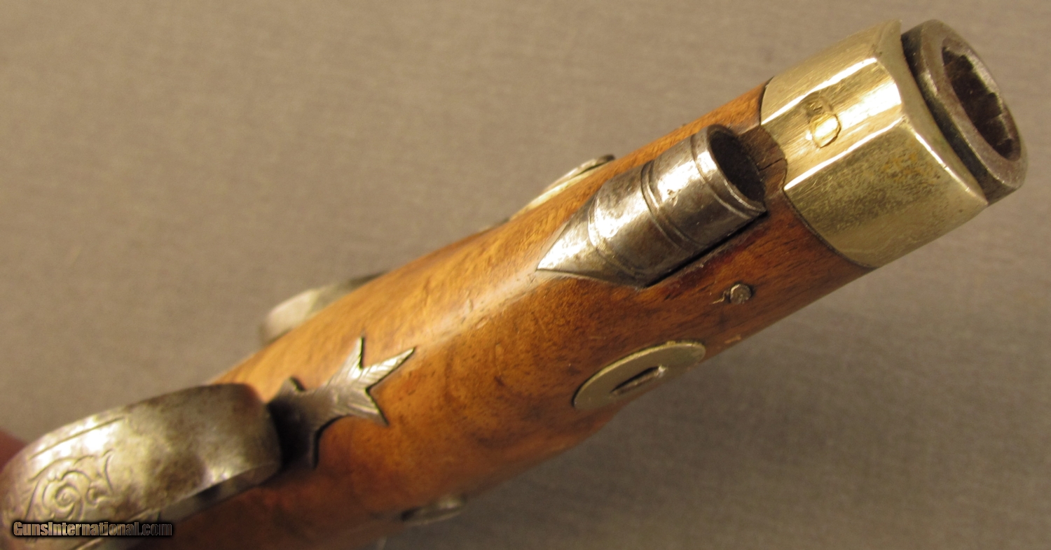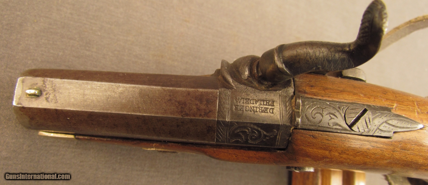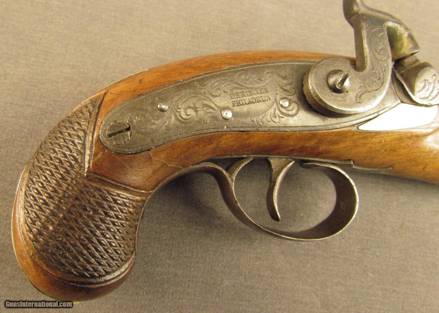 Description: NSN, .44 Caliber, 2 7/8” barrel with a good, lightly pitted bore. This is an original “DERINGER/PHILAD'A” marked pistol that has an overall dark plum-brown patina with some of the original browning still present on the barrel. There is simple scrollwork engraving along the back-action lockplate, on the hammer, and on the barrel breech and nipple bolster. The underside of the barrel has extensive Birmingham proofs with two deeply struck “XVI” fore and aft of the wedge bracket. The lightly sanded walnut stock has numerous small handlking marks and minor blemishes throughout with a single with-the-grain crack running from the German silver nosecap to the wedge bolster. The checkering at the bag-shaped grip is still sharp, and the teardrop shaped inset along the back is still in place. The grip does show a nicely repaired crack running from one side to the other. The ramrod is no longer present, but the action is still rather tight and fully functional. This is an in SOLD Antique: Yes Manufacturer: Deringer Model: Pistol Caliber Info: .44 Cal Gauge Info: .44 Cal |