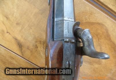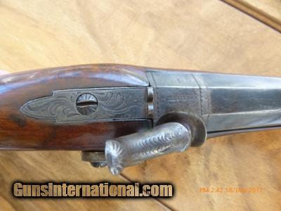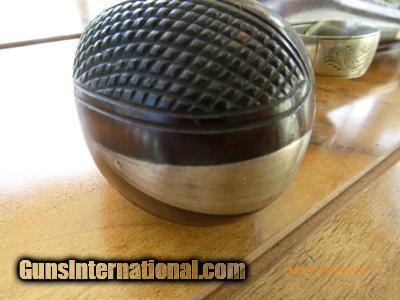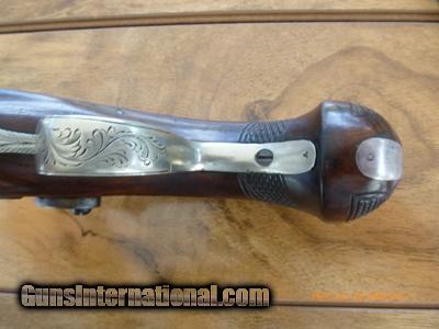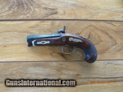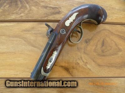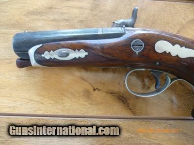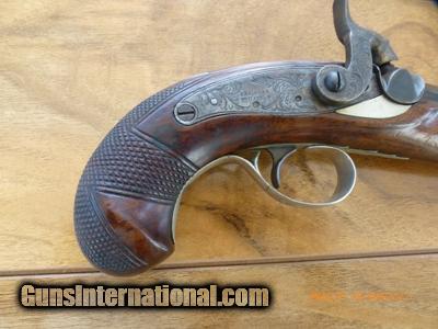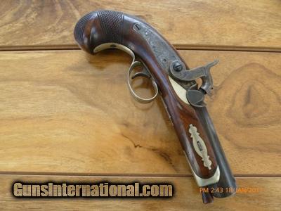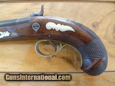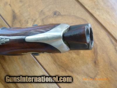 Description: Henry Derringer Single Shot Percussion 16-40 Henry Derringer Single Shot Percussion Pistol. Marked “Derringer Phila.” On lock and breech and large “P” in sunburst on left side bbl. 8” inches overall, 3” inch barrel, pistol in Fine/Excellent condition with patina on lock and most of the bluing on the barrel, Fine/Excellent condition. Engraving on the barrel tang and the hammer and lock plate with German silver escutcheon on stock. Wood is very fine with no cracks, chips, etc., and a nice finish, and a lot of checkering. It also has a ramrod which is unusual in the small size. German silver trim, escutcheon and furniture. This gun was probably made about 1855 to 1860. Rare and desirable in this size and condition ramrod see Flayderman’s guide to Antique Firearms pg. 409.(16-40) $1,750.00 I take Visa/MasterCard, add 3%. Allow two weeks for all checks, whether bank, personal or certified to clear. It is also possible to wire funds to my account for instant credit for a $20.00 wire charge. 3 day- no questions asked return period for refund of price paid for gun. (Not including shipping or credit card charges.)Call or email with any questions or for more pictures. Guns are antique and should not be fired without examination by gunsmith. $50 shipping for long guns, $30 for hand guns to lower 48 states, about $50-$75 to most European countries and $70-$80 to Australia for antique handguns, carbines $75-$125. We can generally get insurance if you want through shipper but coverage is limited. Notify me if you want it. You can send 20% down- balance in 90 days for installment payment plan. No refunds on installment plans. I have shipped to Norway (long gun w/fragile stock) see feedback, England (Winchester1876, Rem. Dbl. Derr.), Northern Ireland, France, Australia and Sweden. Email if you are not U.S. for estimated shipping costs, payment methods, etc. I am always buying and trading for antique and collectible guns, Indian items, rare ammo, etc. Email what you have got for sale or trade. SOLD |