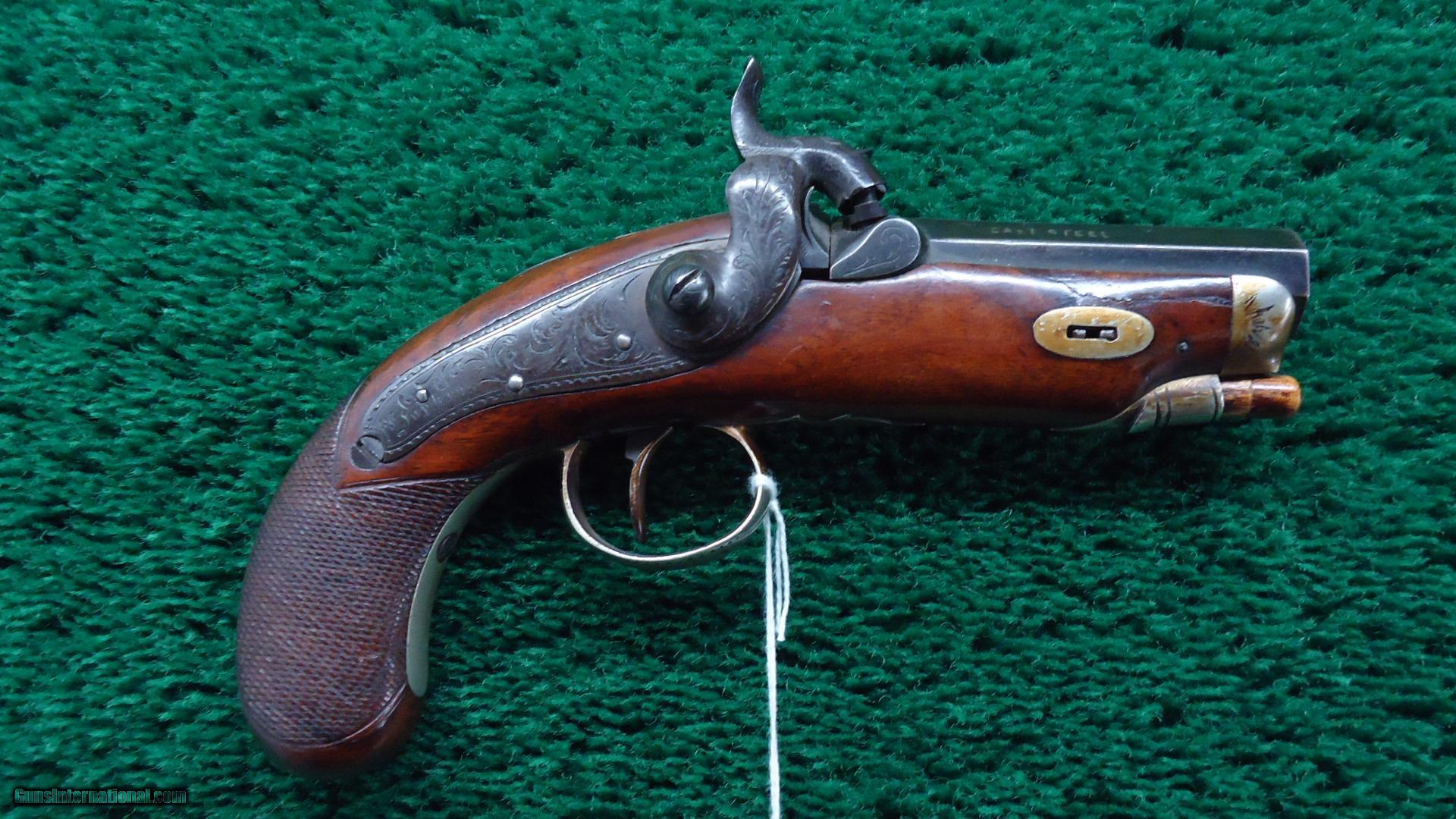 Description: Big bore, small gun! This is a 45 cal meant to be worn on the belt. Quite ornate gun with scroll engraving on the lock and the hammer. Also on the upper tang. Nice clean smooth metal. Action works good. Wood is exceptional. VG overall condition. One light age crack on the left hand side by the belt clip. Everything is solid with no wood missing. Also a light crack that has been repaired many years ago on the right hand side with original wood. Just a hairline crack that does not detract from the gun. Very nice little gun! Leroy Merz Antique Firearms specializes in antique and vintage Winchesters and other fine American firearms. Since 1965 Mr. Merz has taken part in the world of firearms and has been a contributor to many well known reference books. Just recently we mailed the 128th edition of our privately-published catalog. We have hundreds of additional guns in every price range at our home online. Search for Merz Antiques in google. SOLD Antique: Yes |