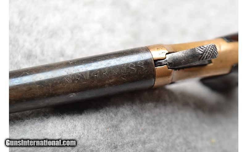 Description: SOLD Antique: Yes Manufacturer: SN: 720 ; per Brophy, years of mfg. were 1870-1881 in serial #'s 68-11,193, page 104 Caliber Info: .32 Rimfire Chambers: Single shot with barrel latch Metal Condition: Brass frame with expected scratches and some pitting; barrel is nicely patinated Wood Condition: Good Bore Condition: Some pitting, no loose rust Barrels: 2 1/2 inch, round with ejector; stamped "Never Miss" on top and "J M Marlin" on right barrel flat with partial address Triggers: Single Stock: Rosewood grips Stock Dimensions: OAL 5 inches Weight: 7 oz Sights: Brass front blade sight Item Location: Greenville, SC |