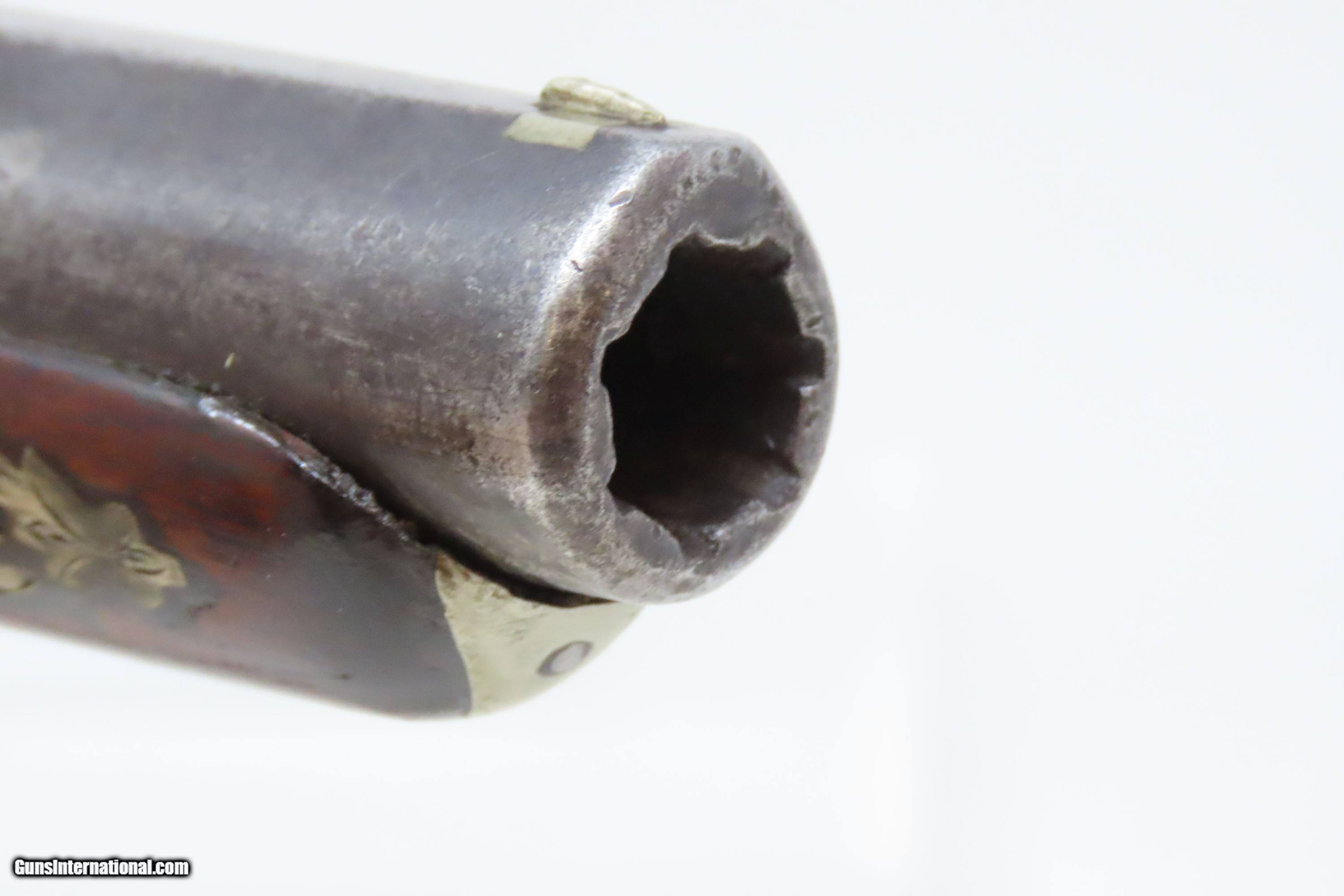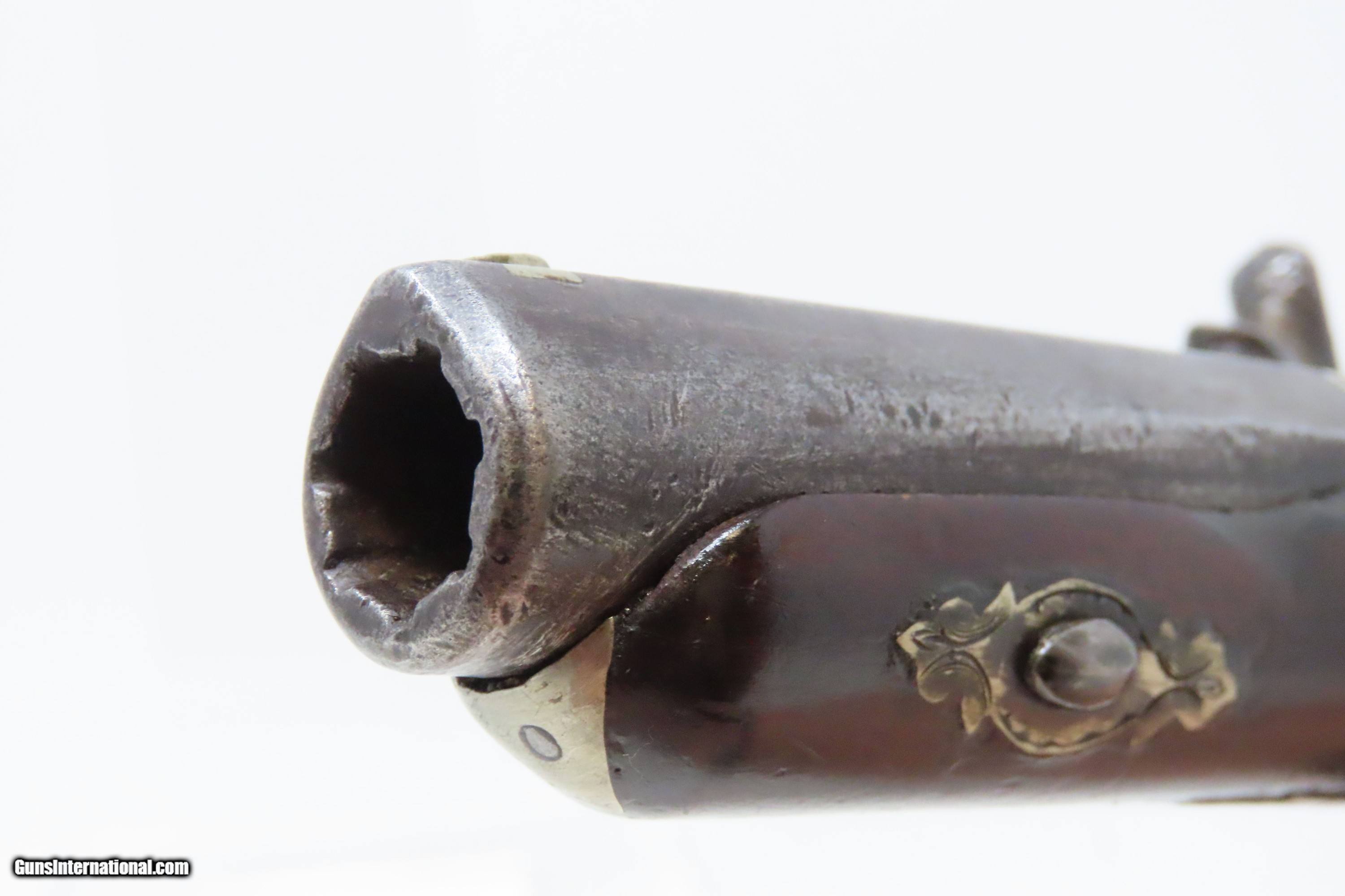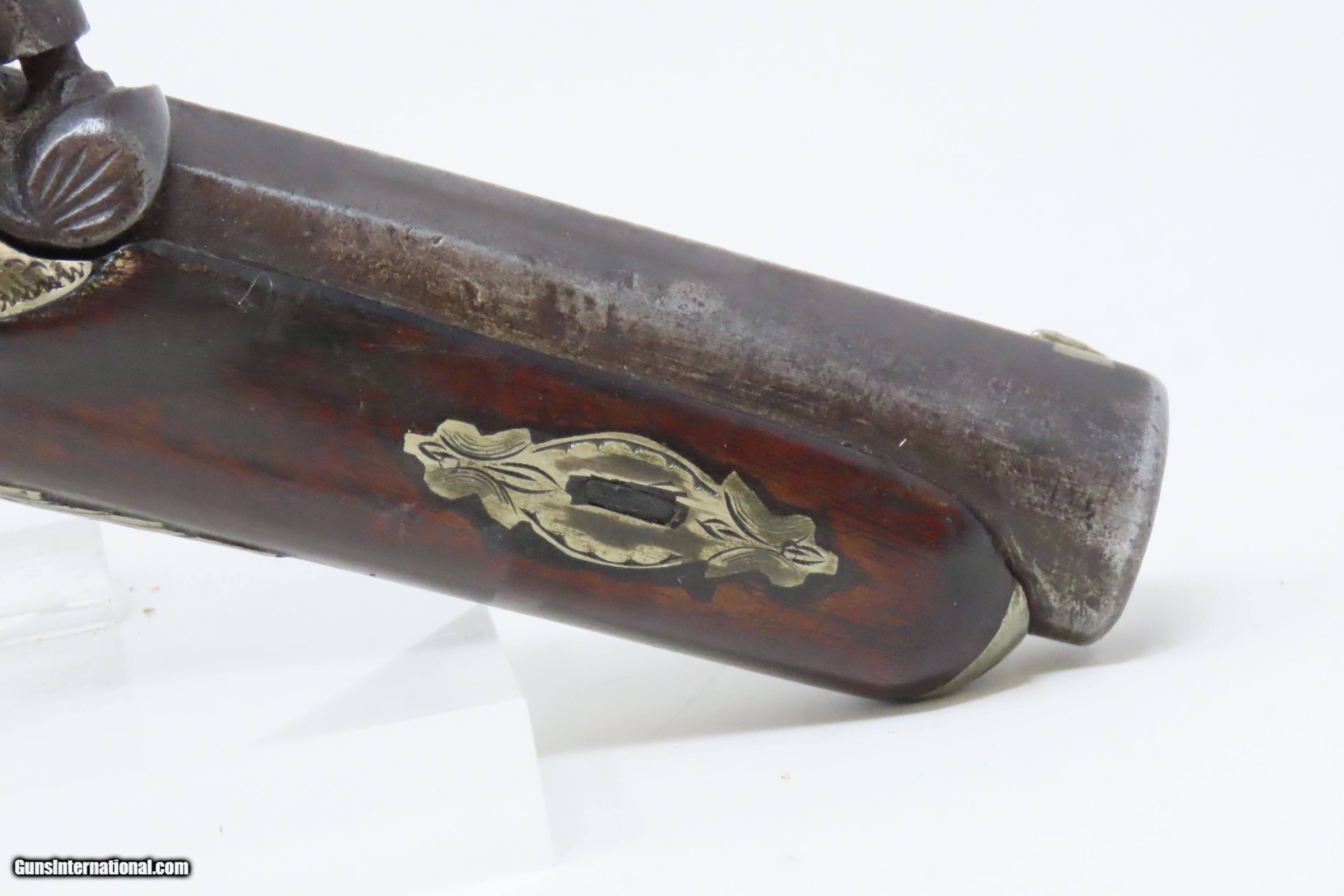 Description: Memphis TN Pre-Civil War Dealer LULLMAN & VIENNA Antique HENRY DERINGER .45 Famous Riverboat Gambler & Sneak Pistol Here we present an antique Henry Deringer Percussion Pocket Pistol, made circa the 1850s in Philadelphia, Pennsylvania. This example is marked “LULLMAN & VIENNA MEMPHIS TENN” which was one of just fifteen authorized agents for Henry Deringer selling his famous pocket pistols. In operation from the early 1860s to 1876, Lullman & Vienna sold general merchandise, in addition to arms from Henry Deringer and Deringer’s copyists. Henry Deringer was a very successful Pennsylvanian gunsmith who started his own company in his early twenties, circa 1809. It was not until the 1850s that his prototypical “Deringer” percussion pistol became extremely popular. Once it did become popular, the basic design was copied in dozens of different shops. Not only was it copied, but Deringer’s good name was stamped on guns made by others, some of them not up to the quality standards of Deringer himself. The inventor was apparently very worried about protecting his good name, so he pursued and sued any of the counterfeiters that he could find and warned the buying public to beware of his spurious imitators. The overall condition is very good. Strong action. This example has maintained a solid stock/grip with average wear. Legible markings. The bore is in good shape for its age with strong rifling. Lightly engraved. The “P” on the left barrel flat has been remarked. German silver hardware with engraving. Own the original! This is a legitimate antique and not a reproduction. Barrel is 3 inches. Caliber: .45 Percussion Overall condition as seen in photos. Very Fast. Very Safe. FREE SHIPPING WORLDWIDE. Delivered directly to your door by express mail! Guaranteed AUTHENTIC & Includes CERTIFICATE OF AUTHENTICITY. ancestryguns $2700 #227969 SOLD Antique: Yes |
