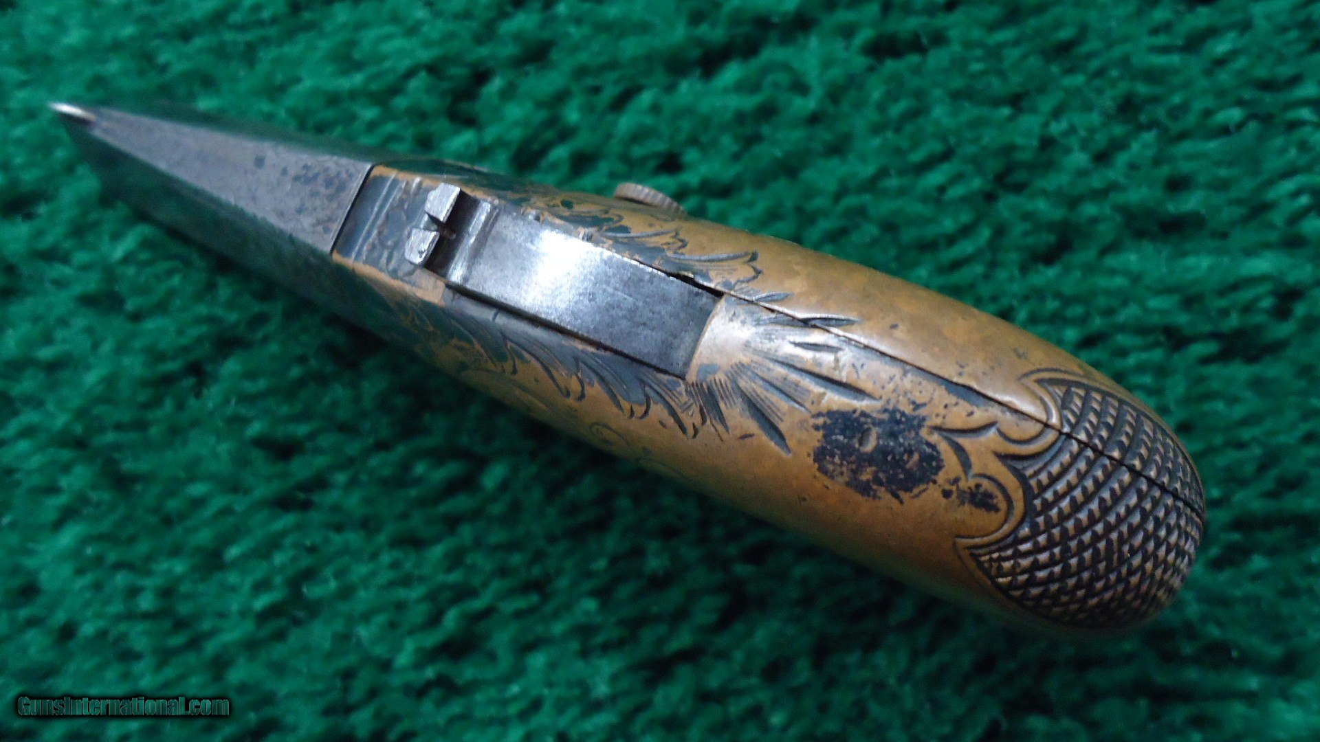 Description: No. 1 derringer from Moore .41 caliber single shot with the turndown breech for loading. Some wear but still good overall condition with some blue even remaining on the barrel. The balance is aged. Light engraving on the barrel and some on the brass handle. Derringers are a good collectable and not all that expensive. Unique piece. Leroy Merz Antique Firearms specializes in antique and vintage Winchesters and other fine American firearms. Since 1965 Mr. Merz has taken part in the world of firearms and has been a contributor to many well known reference books. We have hundreds of additional guns in every price range at our home online. Search for Merz Antiques in google. SOLD Antique: Yes Handgun Caliber: .41 Rimfire |