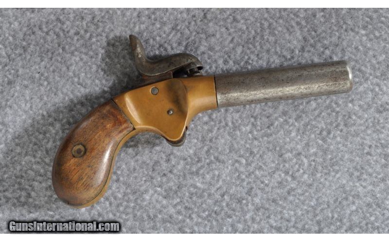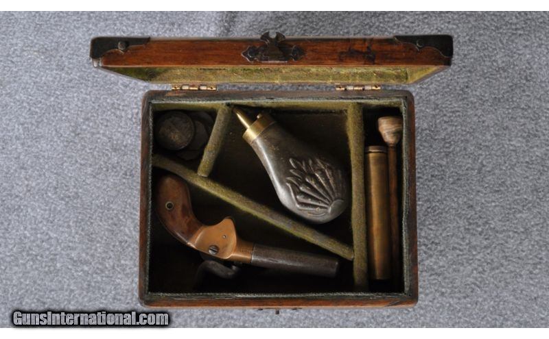 Description: This boxed percussion pistol is of unknown origin but is well presented with powder flask, and other accessories. SOLD Manufacturer: Unknown Caliber Info: .41 Caliber Metal Condition: Barrel shows in the white with external pitting. Brass frame is dull, Hammer shows some small areas of rust Wood Condition: Grips are worn smooth, Display box is well aged Bore Condition: Dark Barrels: 3 Triggers: Spur Stock: Smooth walnut Weight: 15 oz Sights: None Extras: Wooden box with ram rod, powder flask, percussion cap tin with a few caps, brass container with lead balls. Item Location: Grand Junction, CO |