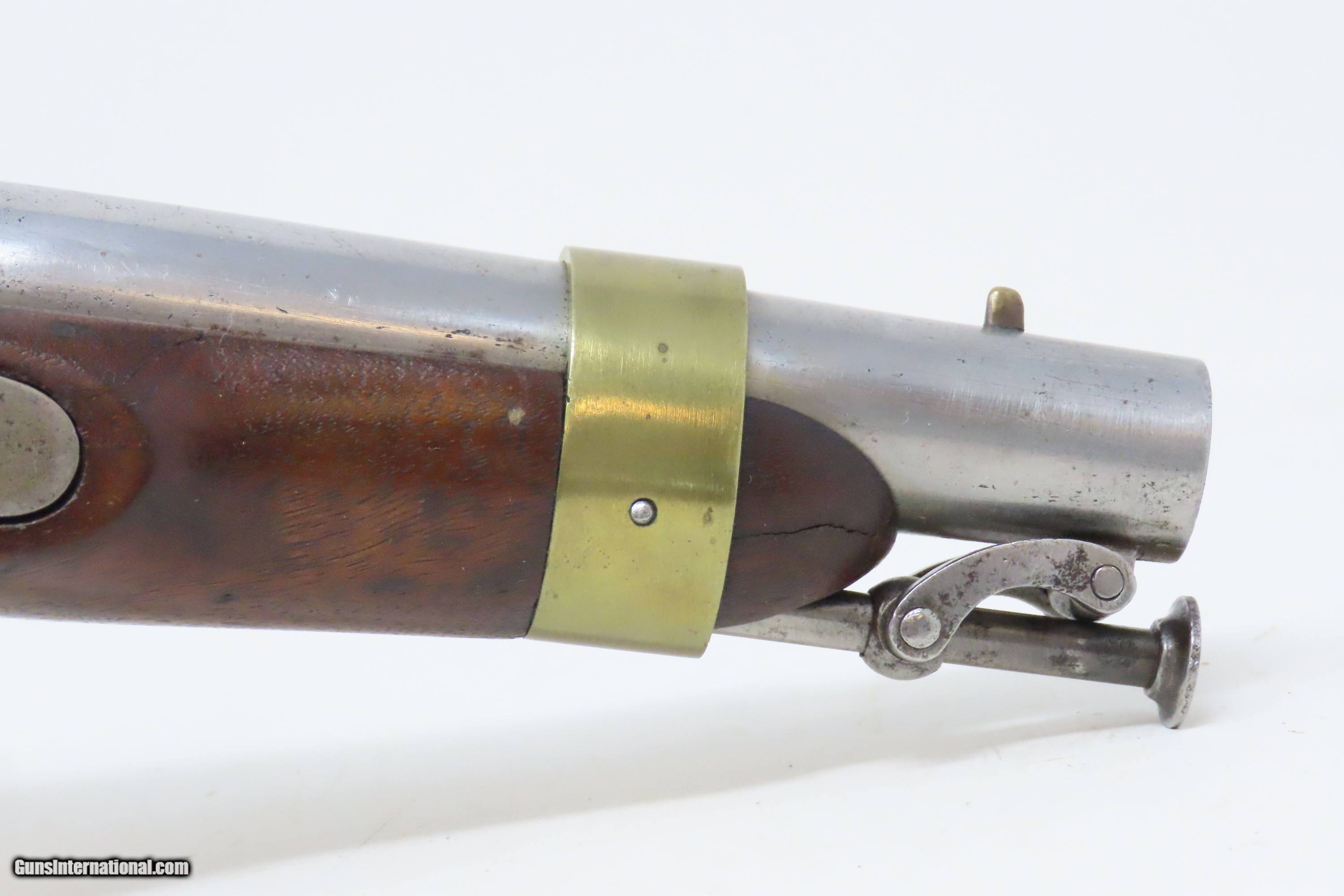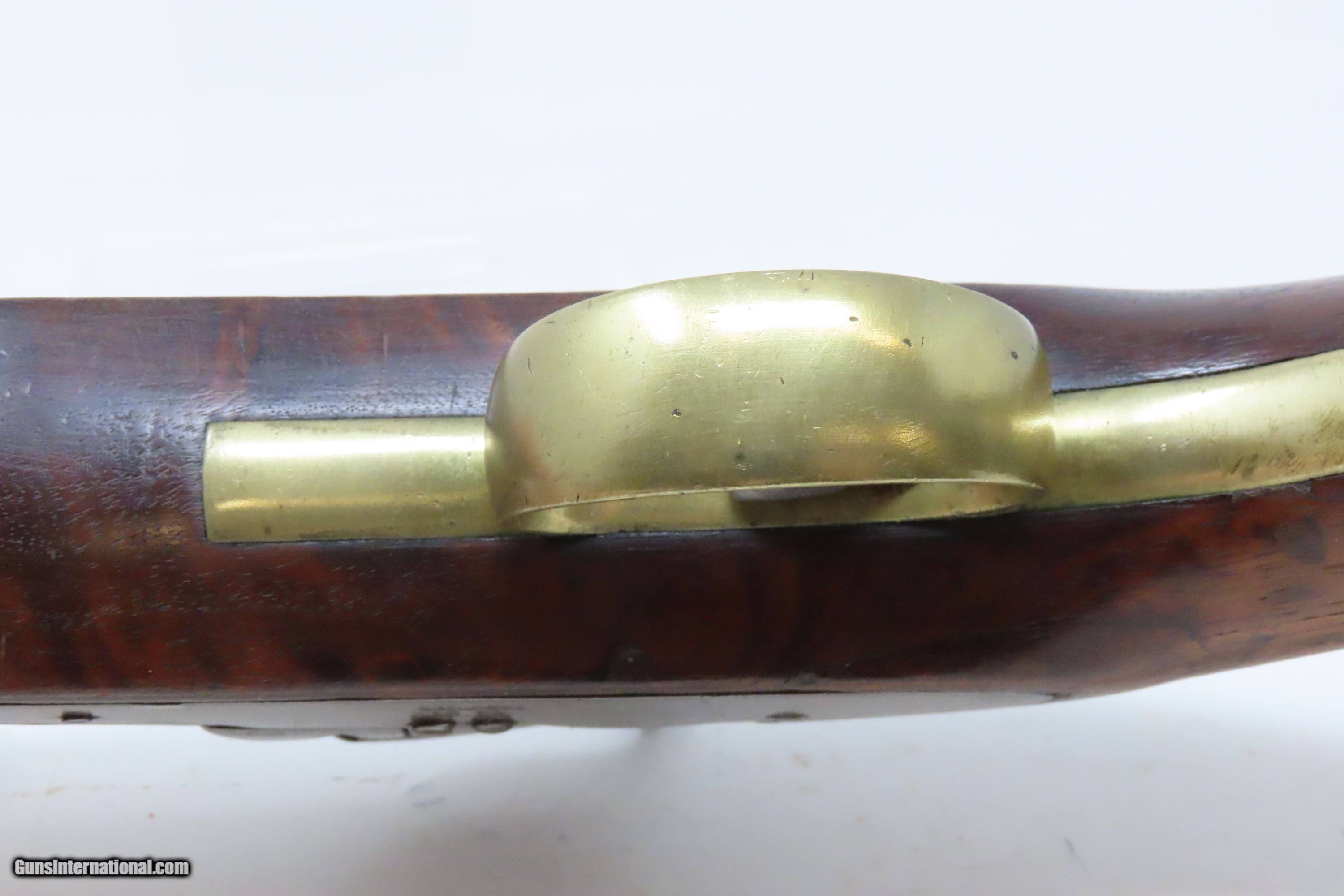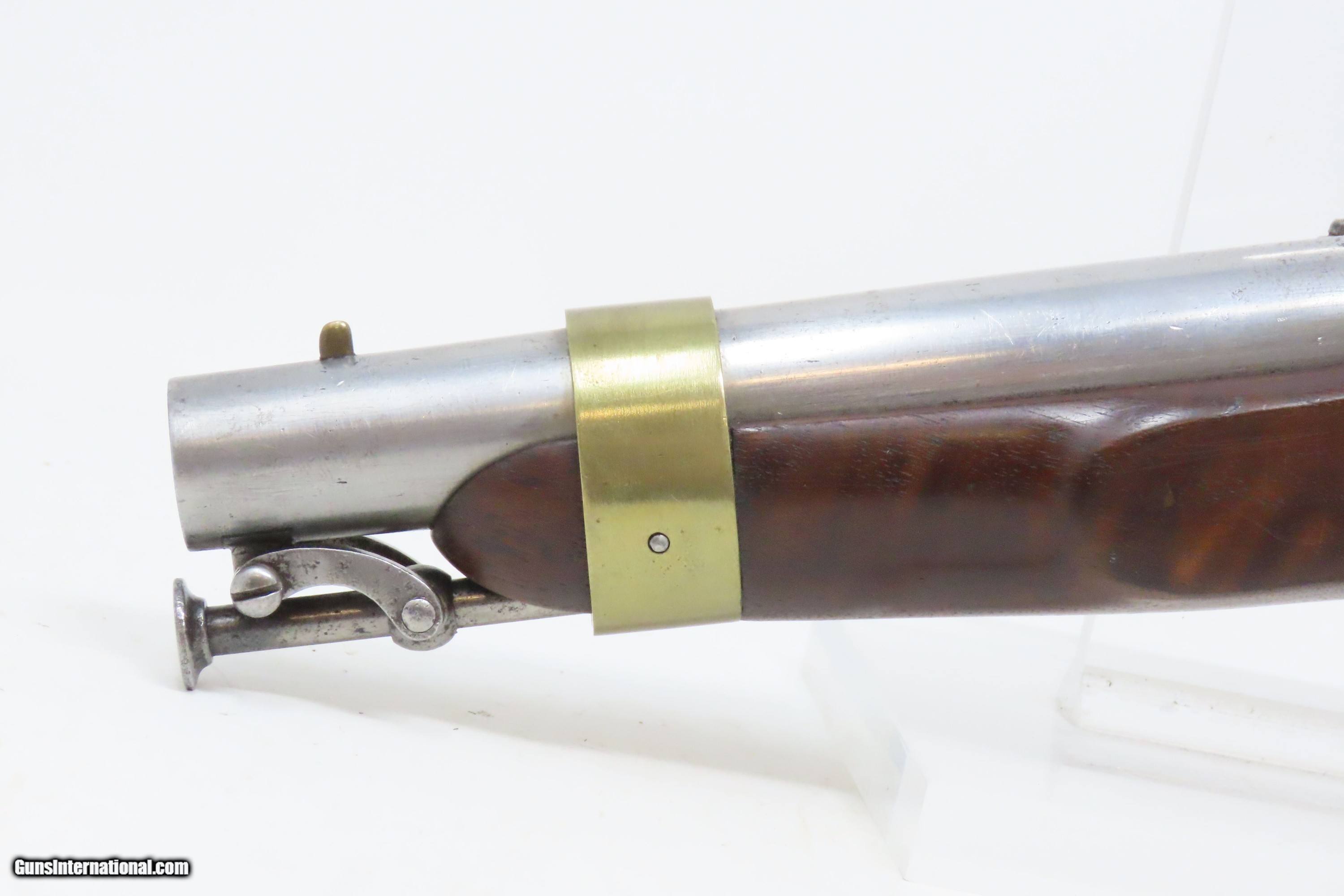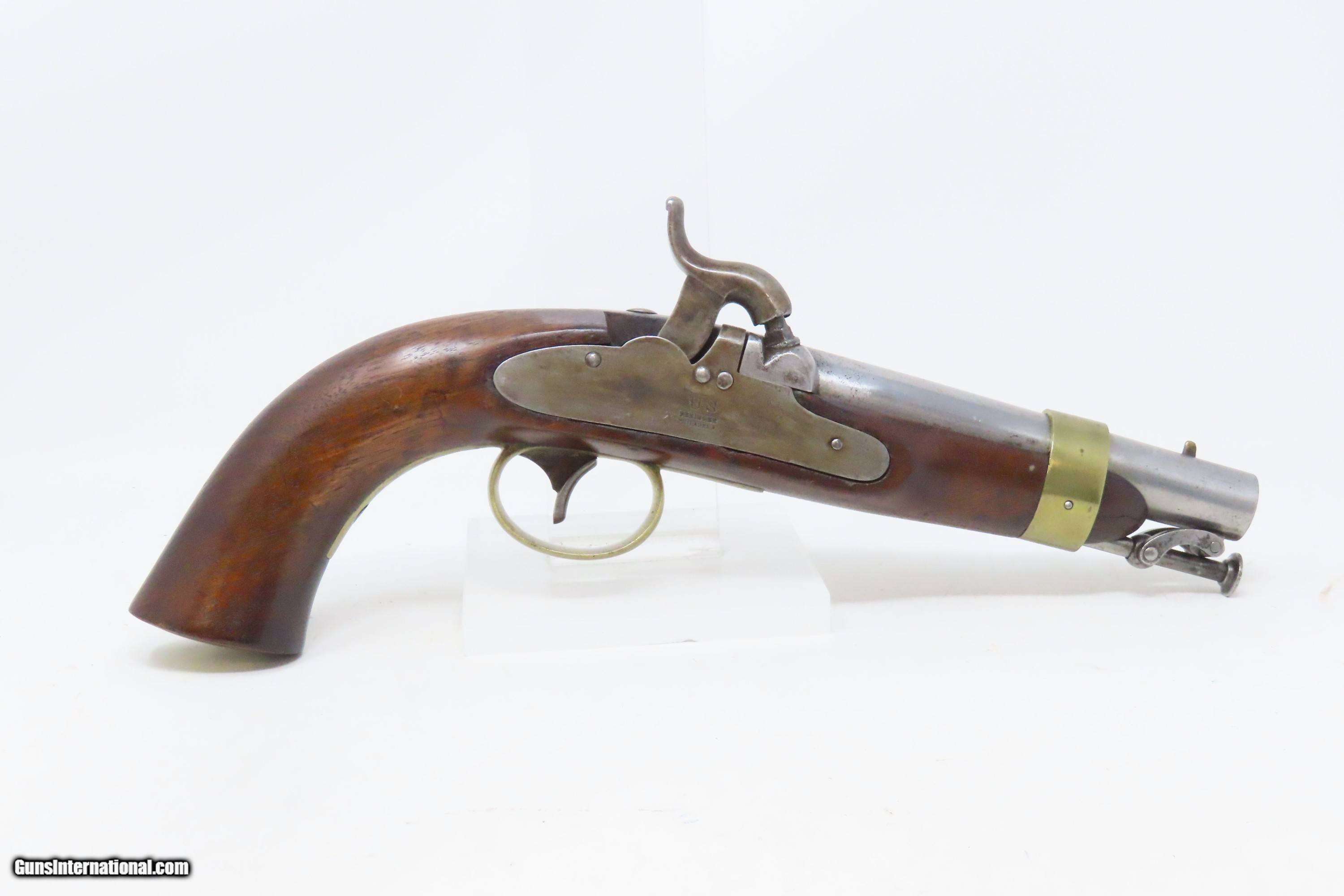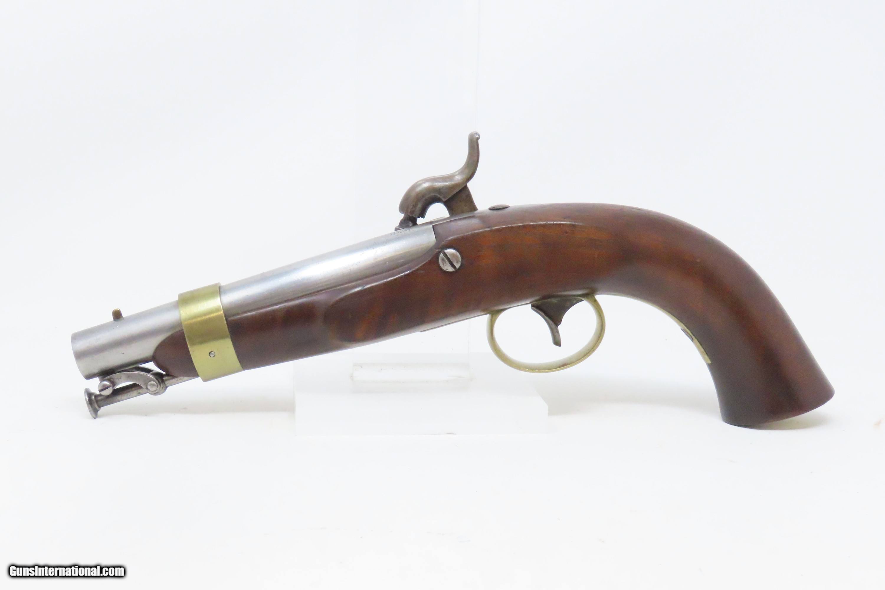 Description: RARE Antique HENRY DERINGER U.S. NAVY Contract Model 1842 “Boxlock” Pistol VERY SCARCE Box Lock Pistol Made for the U.S. Navy Here we present an antique Henry Deringer U.S. Navy Contract Model 1842 “Box Lock” Pistol, in .54 caliber, made circa 1842 in Philadelphia, Pennsylvania. Approximately 1,200 of these pistols were manufactured by famed Philadelphia gunmaker Henry Deringer for the U.S. Navy. Of those, as few as around 200 may have been accepted by the Navy. This variation is the first U.S. martial pistol to feature rifled barrels. Unlike most martial pistols of its time, the hammer is mounted on the interior of the lock plate. It also features a captive ramrod on a swivel to avoid loss in the sea during boarding maneuvers. Most of these scarce Model 1842 pistols saw service during a time of great change and increasing tension, as well as firearms innovation. The Mexican-American War (1846-1848), the numerous conflicts with Native Americans, annexing of new territory, the rising blood-pressure over slavery, and a quick 36% population increase that all culminated in the blood-letting of the American Civil War. This was the first official percussion pistol to be adopted by the U.S. and simultaneously the last large smooth bore single shot pi stol. By 1845 it was the primary issued weapon to the First and Second Regiment of Dragoons, replacing many of their Model 1836 flintlocks, just in time for the Mexican-American War. The Model 1842 was the last single shot smoothbore pistol issued by the U.S. Army, with the Deringer model being the only rifled gun. The lock is marked “US / DERINGER / PHILADELA”. The overall condition is good. Strong action. Good bore for its age. In this case the bore is smooth. Solid wood and contains only light signs of handling, with a thin crack on the right forend towards the muzzle. Markings are legible. This example has been refinished. Own the original! This is a legitimate antique and not a reproduction. Barrel is 6 inches. Caliber: .54 Percussion Overall condition as seen in photos. Very Fast. Very Safe. FREE SHIPPING WORLDWIDE. Delivered directly to your door by express mail! Guaranteed AUTHENTIC & Includes CERTIFICATE OF AUTHENTICITY. ancestryguns $2000 #233048 SOLD Antique: Yes |