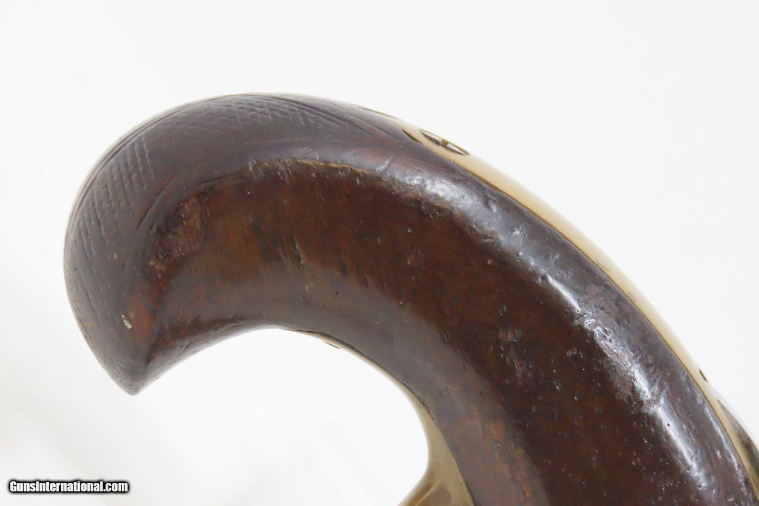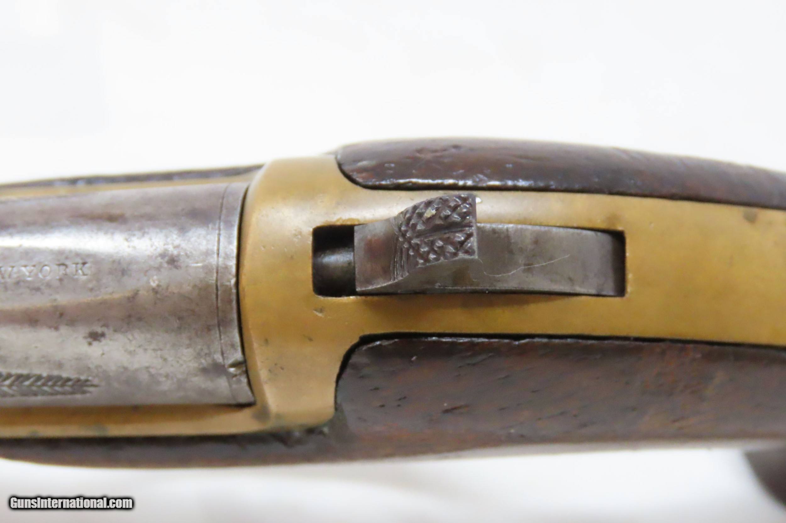 Description: Rare ENGRAVED Antique WILLIAMSON Single Shot CONVERTIBLE .41 Cal. DERINGER Rimfire/Percussion Combination Pistol Here we present an antique Williamson Deringer, made circa 1868 in Brooklyn, New York with a production run between 1866 and 1870. According to “Flayderman's Guide to Antique American Firearms”, this was invented by David Williamson and this unique design that was meant to be the stopgap between a time when the benefits of cartridge pistols were obvious and desirable, but ammunition supply in certain places was questionable. He chambered his deringer for the .41 rimfire cartridge but included a small adapter that allowed the user to use it as a percussion pistol as well. The hammer was such that it would strike the percussion cap if the adapter was being used (see the hole in the center of the breech face), but also had a rimfire striker when that ammunition was used. Fewer than 10,000 of these were made between the Moore’s Patent Fire Arm Company and National Fire Arm Company. The design shows a clear likeness to Henry Deringer's original percussion single shot pistol from the 1840s, especially in size and profile. It even uses Deringer's distinctive wrap-around checkering on the grip handle. This example has been there and done that. The action does not function due to a weak trigger spring. The bore is in good shape for its age. Solid stock/grip with an expected amount of wear. Numbers match. Legible markings. Own the original! This is a legitimate antique and not a reproduction. Barrel is 2-1/2 inches. Caliber: .41 Percussion Overall condition as seen in photos. Very Fast. Very Safe. FREE SHIPPING WORLDWIDE. Delivered directly to your door by express mail! Guaranteed AUTHENTIC & Includes CERTIFICATE OF AUTHENTICITY. ancestryguns $1500 #220122 SOLD Antique: Yes |