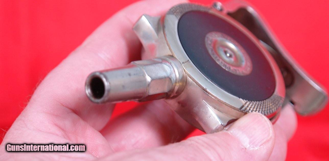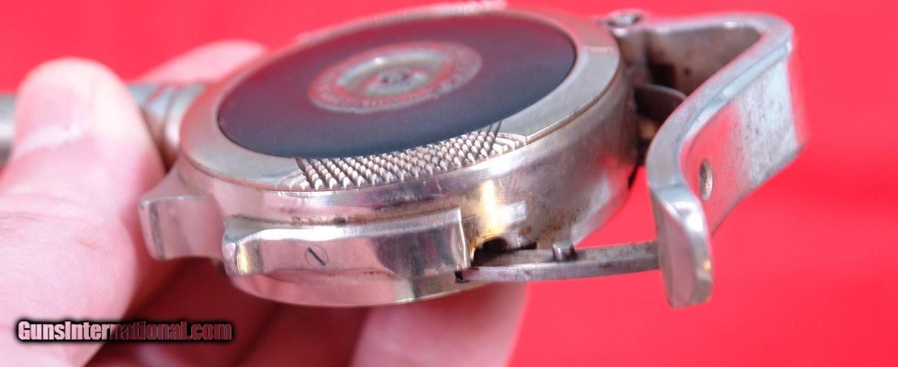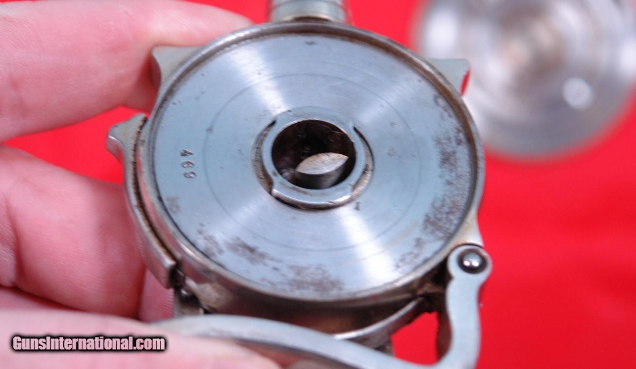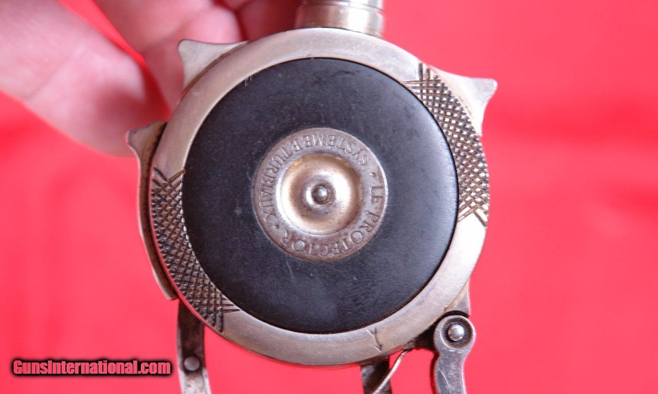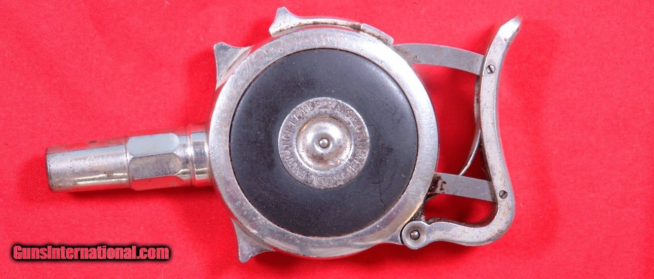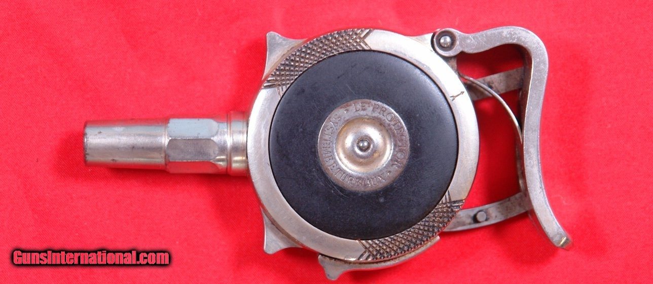 Description: RARE FRENCH TURBIAUX / PARIS LE PROTECTOR .32 EXTRA SHORT RIMFIRE CAL. SQUEEZER CHICAGO PALM PISTOL OR DERRINGER CA. 1882. Early predecessor of the more common American Chicago Firearms Company palm pistol of the same design. Nickel plated with hard rubber grip panels. Center medallions marked “LE PROTECTOR / E. TURBIAUX” and “FRANCE ET A L’ETRANGER PARIS BTE. S.G.D. GEN.”. Excellent all original with nearly all the nickel finish. Perfect grip panels. Tight working order and excellent bore. Very few manufactured and seldom seen for sale. SOLD Antique: Yes Handgun Caliber: .32 Rimfire |