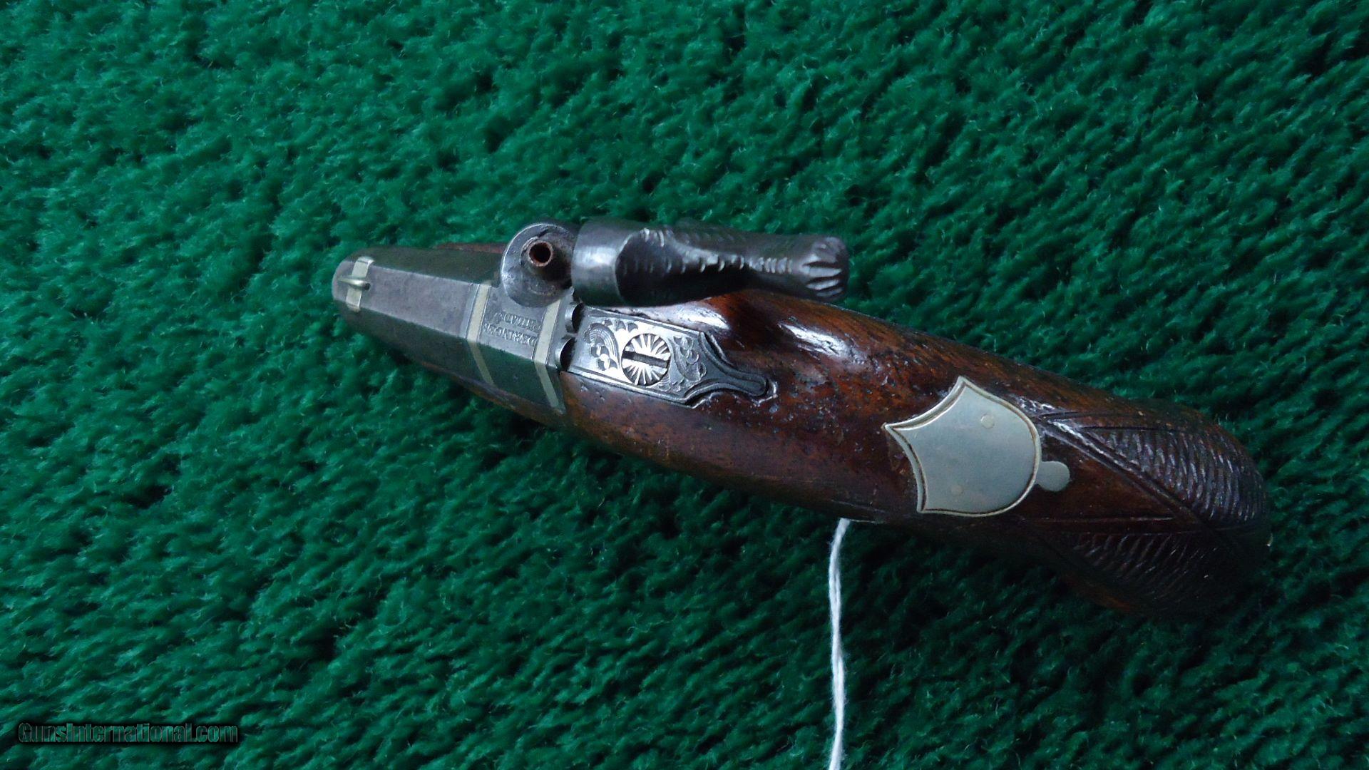 Description: Peanut size Deringer percussion pistol with a 2 inch barrel displaying Deringer Philadelphia mark on the top flat and a "P" proof on left top flat and his usual ‘Deringer – Philadelphia” marking on the lock plate. Mounted in checkered walnut stock with a birds head butt featuring German silver furniture. German silver front sight. Mechanically fine. Less than 5 inches total length. These were the conceal carry guns of the day. Leroy Merz Antique Firearms specializes in antique and vintage Winchesters and other fine American firearms. Since 1965 Mr. Merz has taken part in the world of firearms and has been a contributor to many well known reference books. Just recently we mailed the 127th edition of our privately-published catalog. We have hundreds of additional guns in every price range at our home online. Search for Merz Antiques in google. SOLD Antique: Yes |