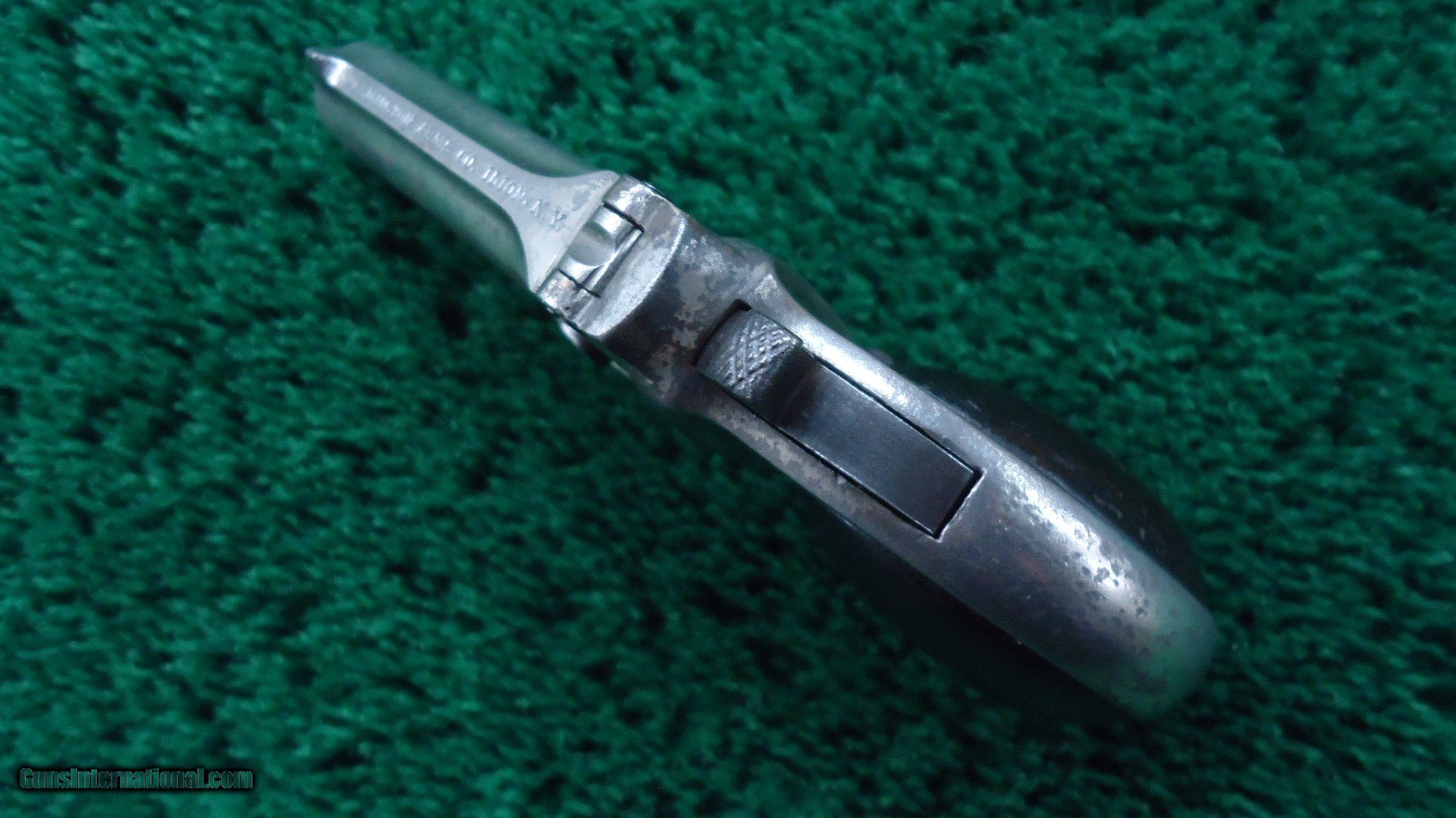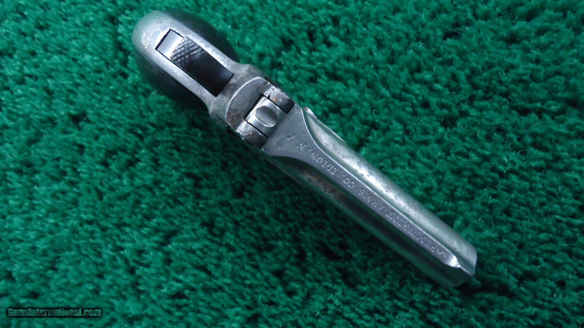 Description: This little spur trigger Remington has a nickel finish that has flaked/worn in areas. 3 inch barrels. Bore has some pitting. Barrel address is good. Mechanics are fine. The rosewood grips have a few handling mars. These were manufactured 1904-1910. Leroy Merz Antique Firearms specializes in antique and vintage Winchesters and other fine American firearms. Since 1965 Mr. Merz has taken part in the world of firearms and has been a contributor to many well known reference books. We have hundreds of additional guns in every price range at our home online. Search for Merz Antiques in google. SOLD Curio/Relic: Yes Handgun Caliber: .41 Rimfire |