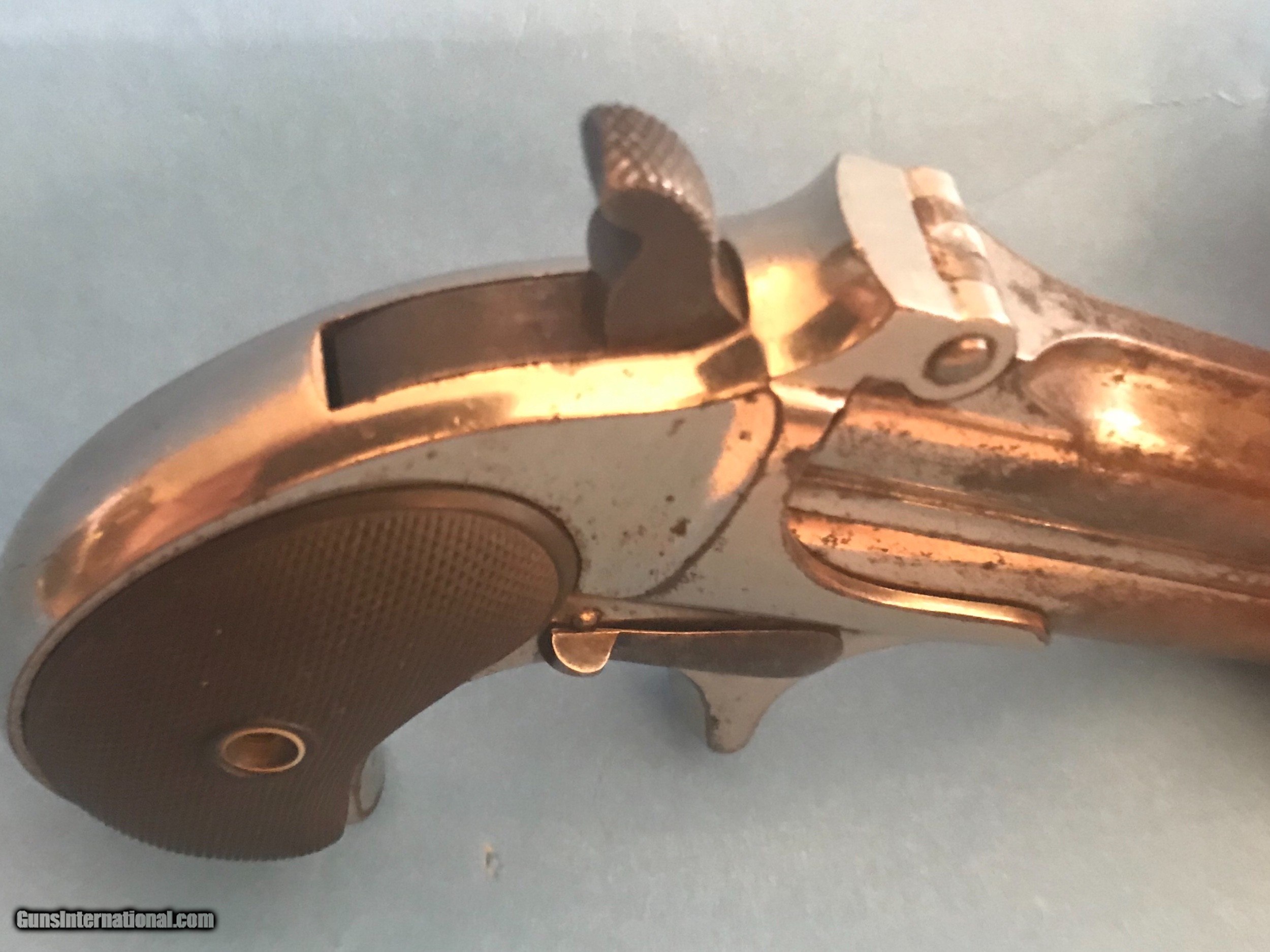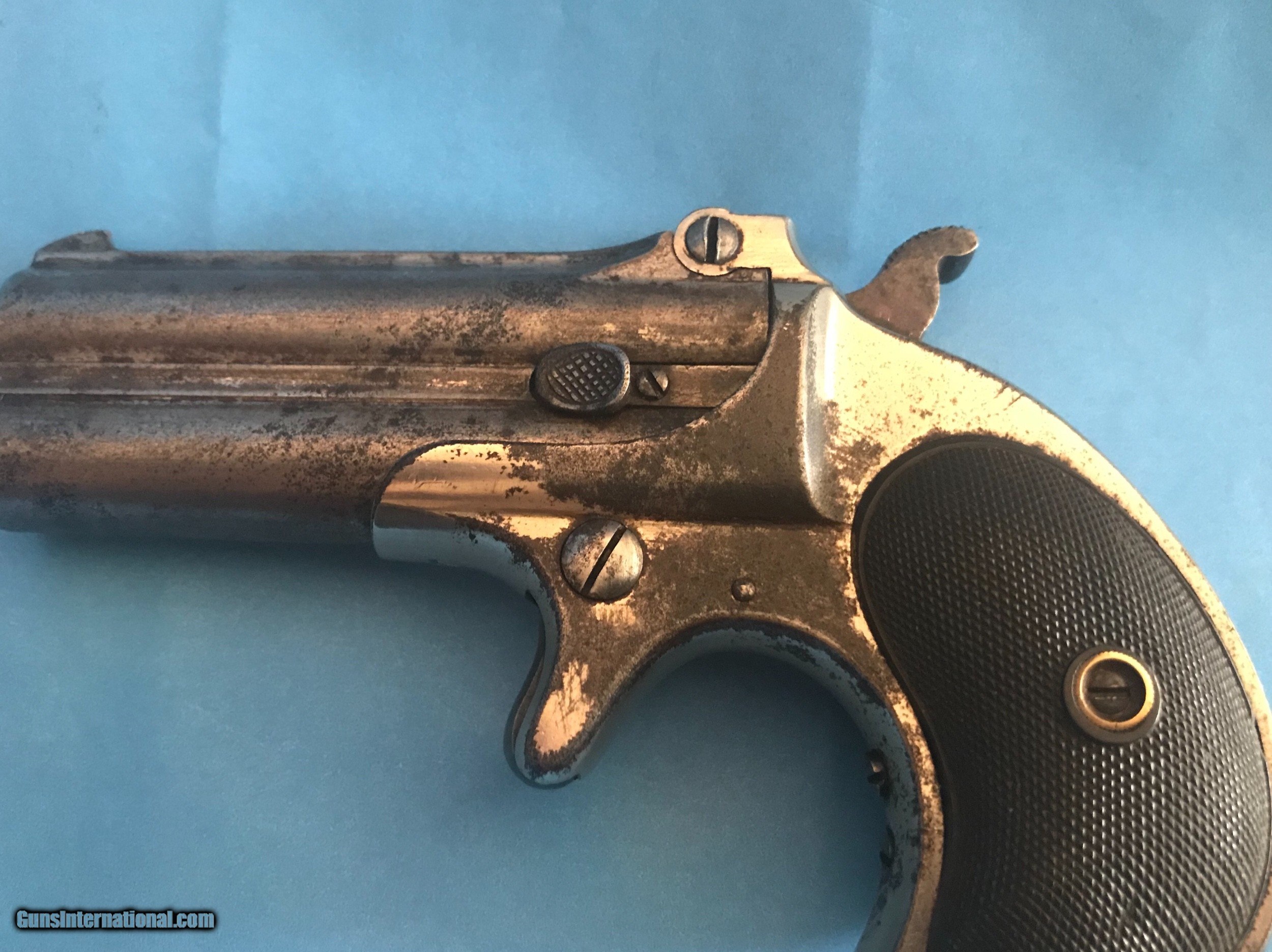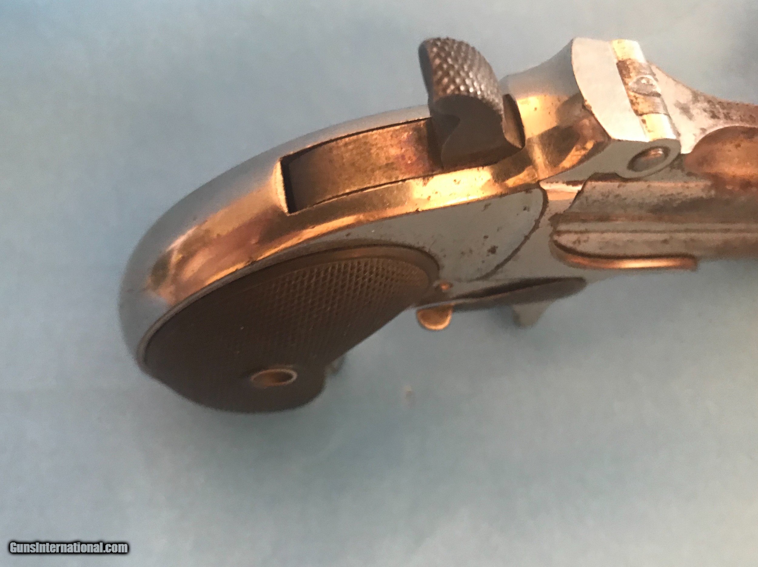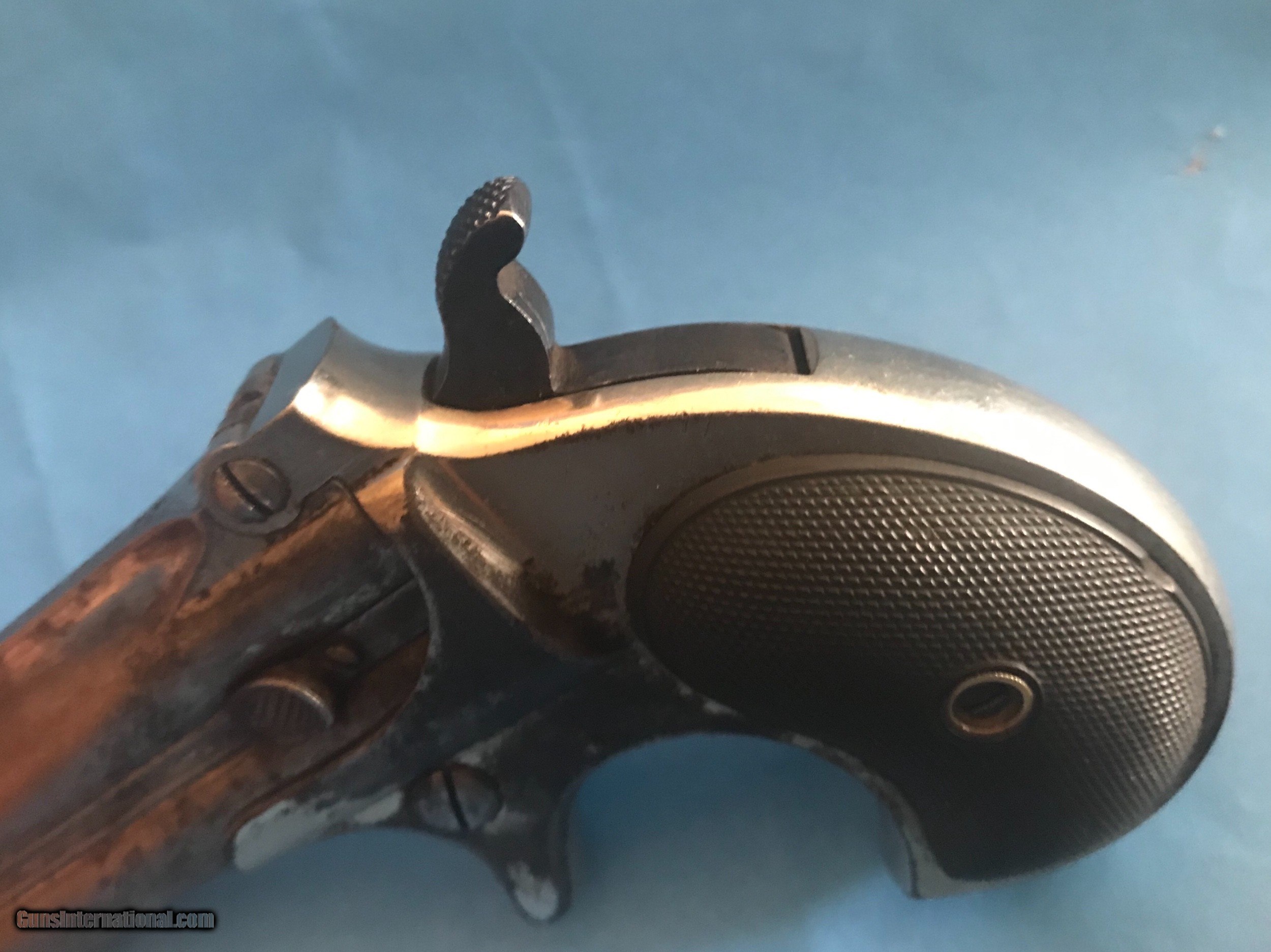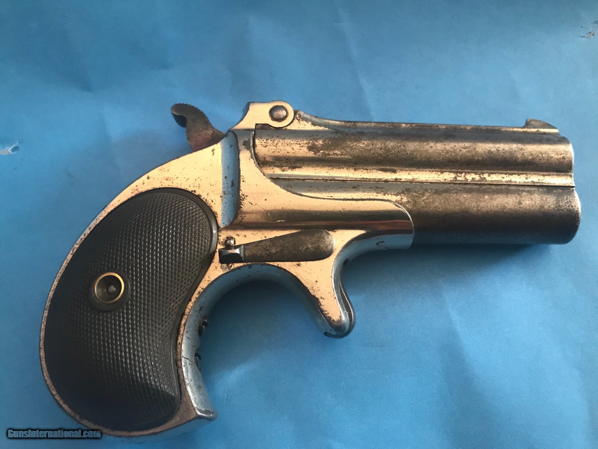 Description: Remington .41 cal O&U. Antique model 95 Nice all original Remington Derringer with moderate wear it retains about %45 original nickel the remainder of the Derringer is common smooth wear, the grips are original, and are in very good condition, the bores are about 9.5 bright and shiny. SOLD Antique: Yes Manufacturer: Remington Model: 95 O & U Serial Number: 2542 Barrel Length: 3” Caliber Info: .41 Condition: Above average Bore Condition: Nice Finish: Nickel Manufacture Date: Antique |