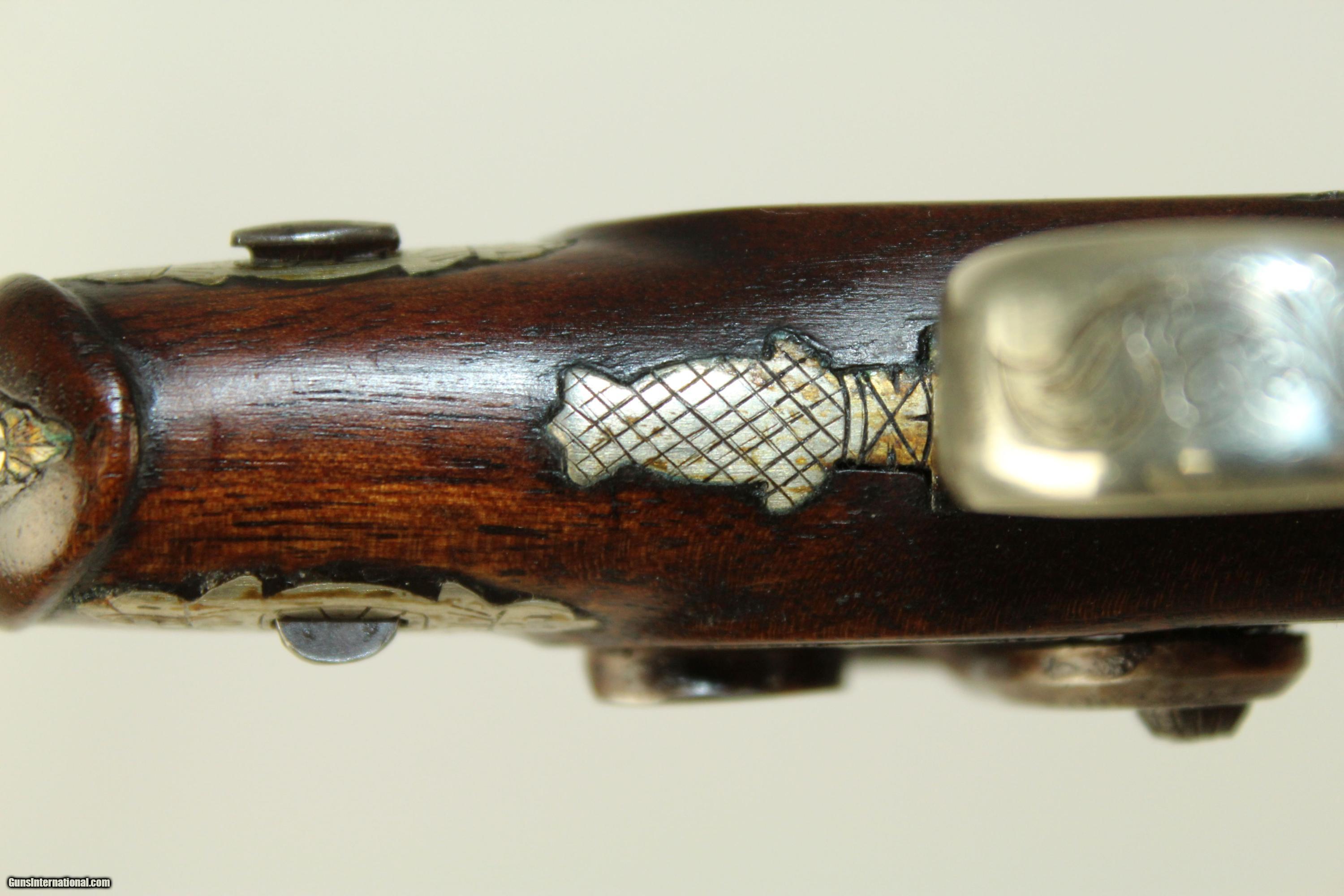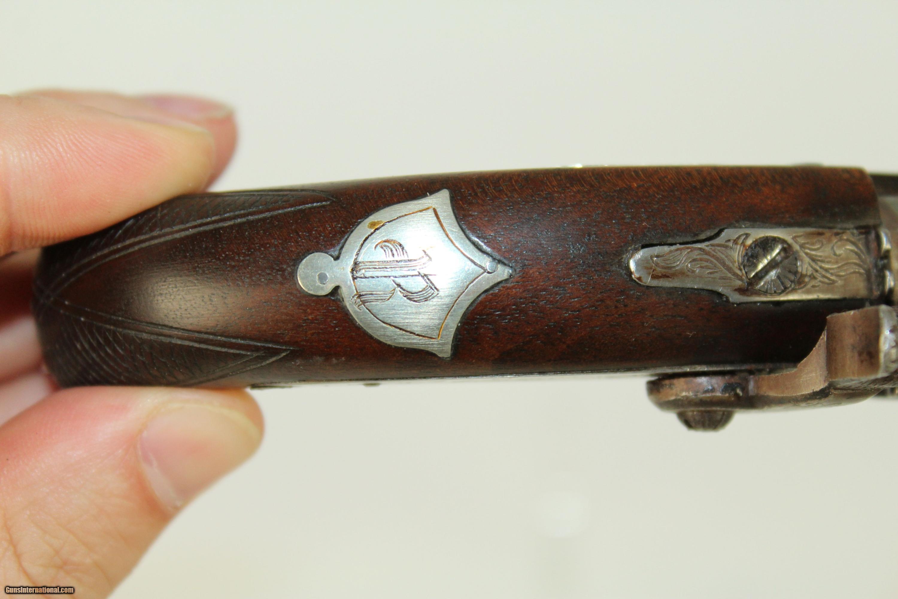 Description: SCARCE Memphis Retailed Henry DERINGER .41 Pistol Retailer Marked “LULLMAN & VIENNA/MEMPHIS TENN” Here we present an antique Henry Deringer Percussion Pistol, made circa 1866 in Philadelphia, Pennsylvania for the Southern retailer Lullman & Vienna of Memphis, Tennessee. Henry Deringer was a very successful Pennsylvanian gunsmith who started his own company in his early twenties, circa 1809. It was not until the 1850s that his prototypical “Deringer” percussion pistol became extremely popular. Once it did become popular, the basic design was copied in dozens of different shops. Not only was it copied, but Deringer’s good name was stamped on guns made by others, some of them not up to the quality standards of Deringer himself. The inventor was apparently very worried about protecting his good name, so he pursued and sued any of the counterfeiters that he could find and warned the buying public to beware of his spurious imitators. Here is what Charles Edwin Chapel had to say about the Deringer pistol: “For a man in a tight spot, with an armed enemy only a few feet away, a pair of single-shot Deringer pistols was more effective than the multishot pepperbox. You either got your man at the first or second shot—if, indeed, you were given the chance to fire twice—or you got a fast funeral. That heavy-calibered little gun was a man-stopper at short range, an effective surprise weapon, an “equalizer” with which many a gold-camp David permanently tamed the muscle-bulging, belligerent Goliaths of the frontier. Included in a man’s personal arsenal, the pistol was carried either as a principal weapon or as a reserve to be used when revolver, pepperbox or Bowie knife failed.” The name “Deringer” often invokes certain historical event, characters or moments in film. Deringer’s name has become both a noun and a catch-all term. President Abraham Lincoln was shot and killed with one of Henry Deringer’s pocket sized percussion pistols, the night John Wilkes Booth revenged the South at the Ford Theater. They conjure images of the California Gold Rush, as well as riverboat gamblers. These pistols were very practical for the time, being small and concealable and of large bore size. This specimen is an example of one of Henry Deringer’s “peanut” sized guns. It has a short barrel and tiny overall size, still with a .41 caliber bore. Like his other “Deringers”, it is decorated with nicely engraved German silver, a stylistic a continuation of the period when Kentucky rifles were elaborately adorned. It is a very scarce specimen bearing the mark of Southern retailer “LULLMAN & VIENNA/MEMPHIS, TENN.” The lock and barrel are marked “DERINGER/PHILADELA” and the left side of the barrel is marked with the “Sunburst/P”. The barrel is also scroll engraved, which is unusual and perhaps there due to the retailer. The firm started out as Henry Folsom & Company in St. Louis in about 1854. As the Federal Army gained ground in the South, so did his business. After Memphis, Tennessee was captured by the Union in 1862, Folsom also installed a new store there at 345 Main Street. After New Orleans fell in 1864, Folsom opened another location at 3 Old Levee Street. John Christopher Lullman managed the Memphis branch until purchasing with Anthony J. Vienna in 1866. Interestingly, there is a record of a Private John Lullman, who was a soldier in Company K of the 83rd Ohio Volunteer Infantry and died of disease on December 16, 1862. He was buried at Mississippi River Cemetery in Memphis, Tennessee. One can imagine that there is some familial relation. According to another source, he was the first casualty of K Company and the third of the Regiment. The overall condition is fine. The iron has a smooth with a gray brown patina. Markings are still clear and legible. The original walnut stock is fine. The bore is in very good condition. The action is fine. Own the original! This is a legitimate antique and not a reproduction. Barrel is 2 inches in length. Caliber: .41 percussion The bore is in good condition. The action is functional. Overall condition as seen in photos. Here is an original Henry Deringer Pistol for your collection. Very Fast. Very Safe. FREE SHIPPING WORLDWIDE. Delivered directly to your door by express mail! Guaranteed AUTHENTIC & Includes CERTIFICATE OF AUTHENTICITY. ancestryguns $2250 #21895 SOLD Antique: Yes |