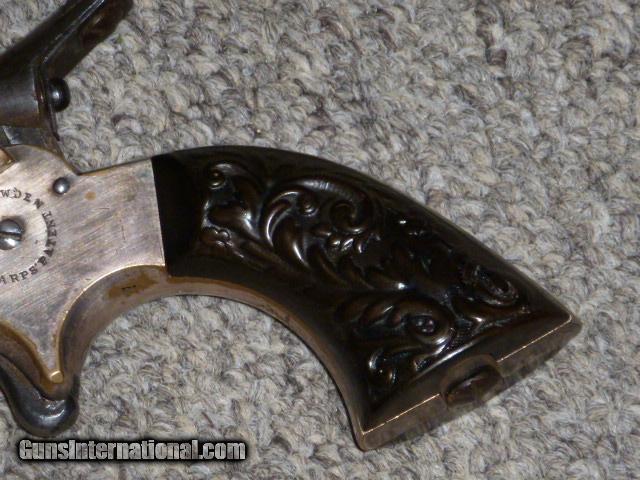 Description: Tipping & Lawden Sharp's patent 4 barrel pepperbox. .30 Caliber rim fire. Excellent grips lots of nickel finish remaining on the brass frame with thinning blue on the barrels. Good bores. serial #4505 SOLD Antique: Yes |