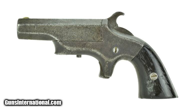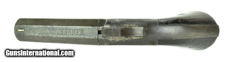 Description: Southerner Derringer. Iron frame model. Dark gray patina with spots of light pitting. Grips show light wear. Action works well.