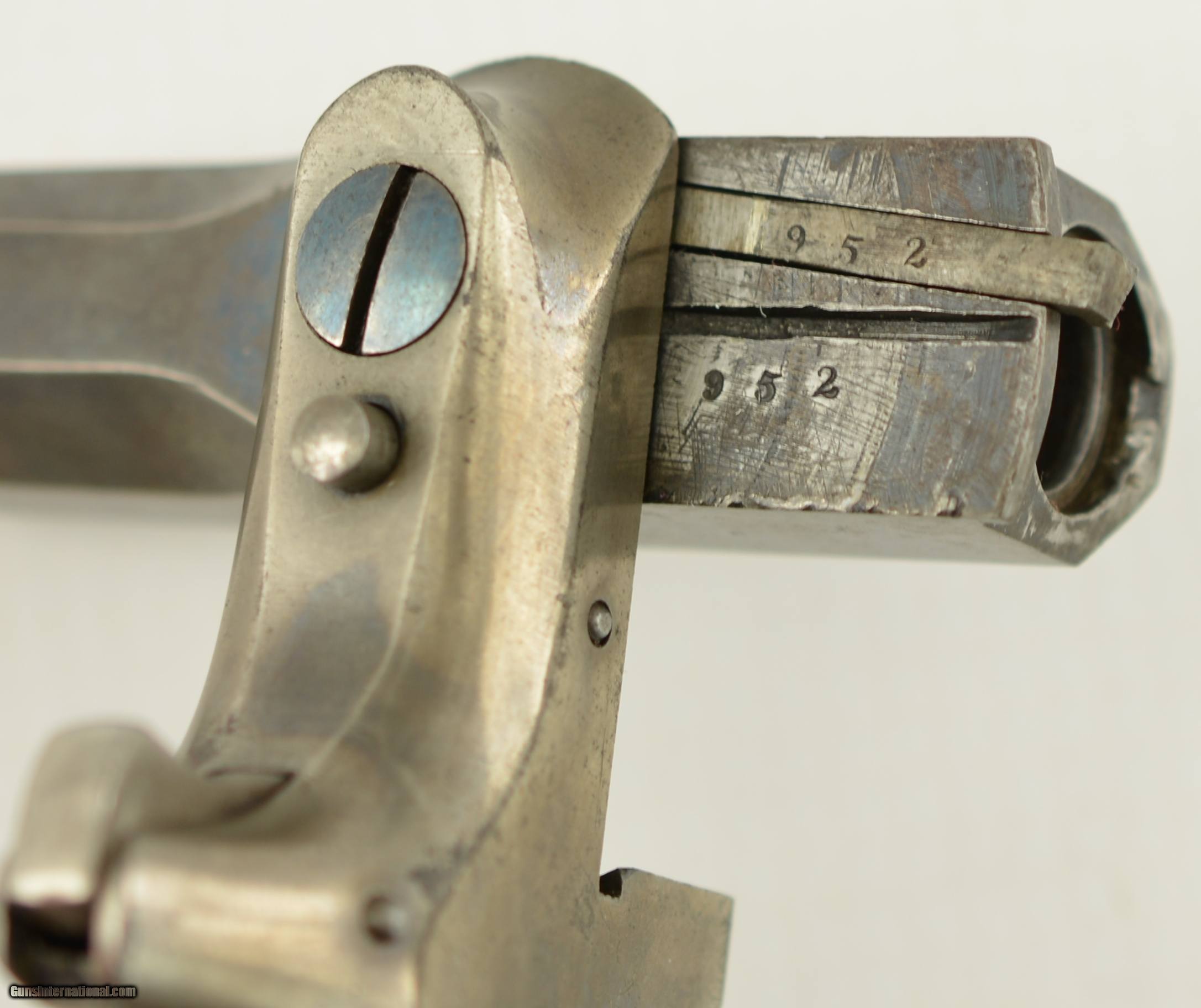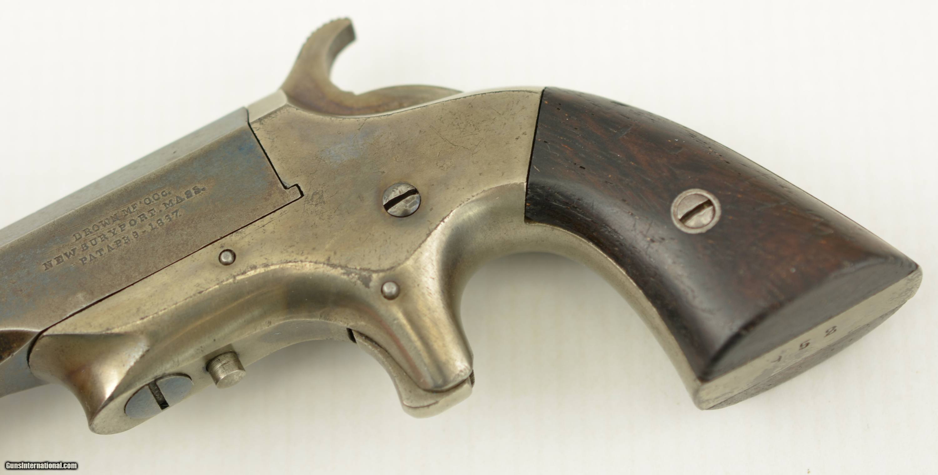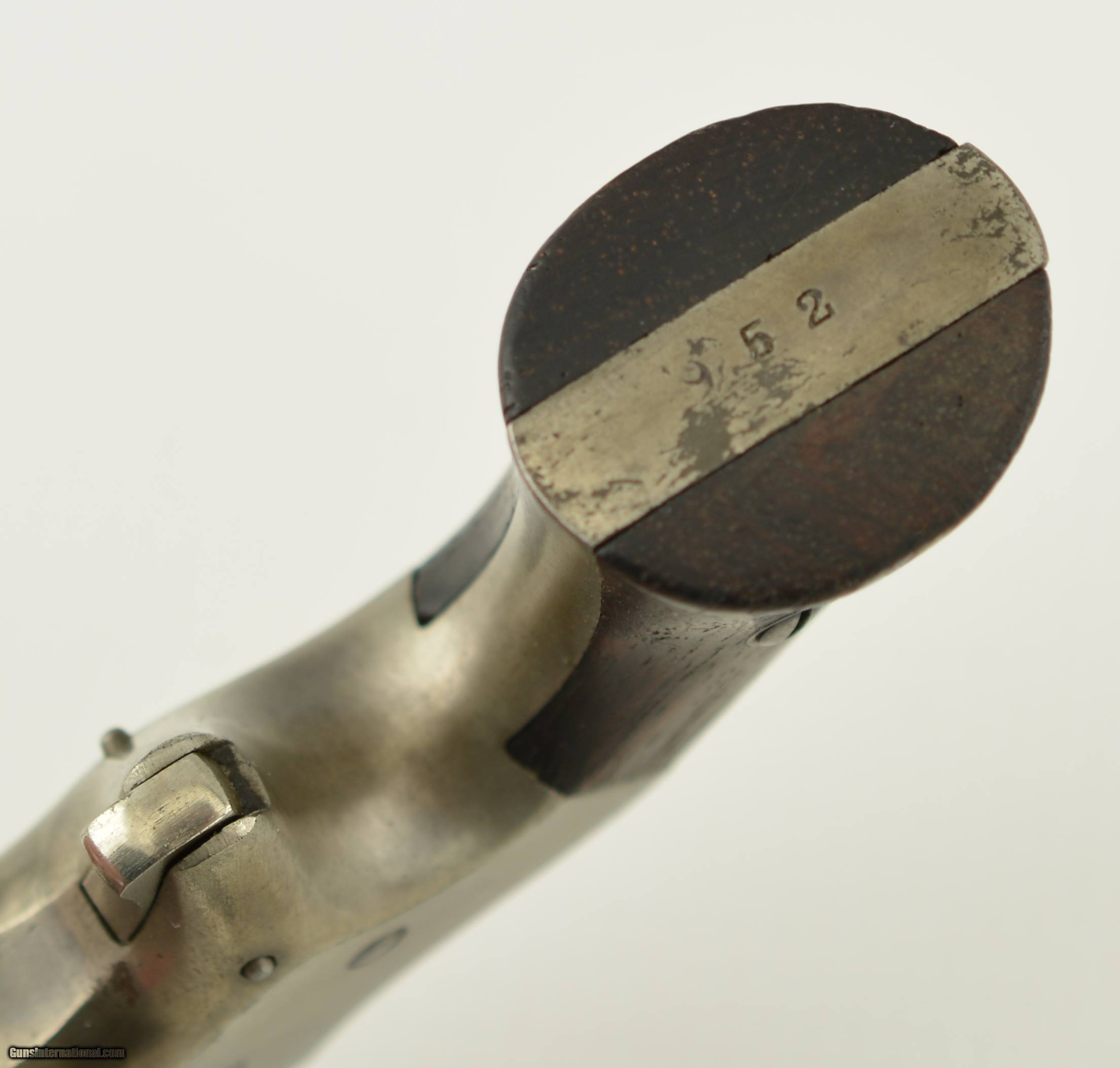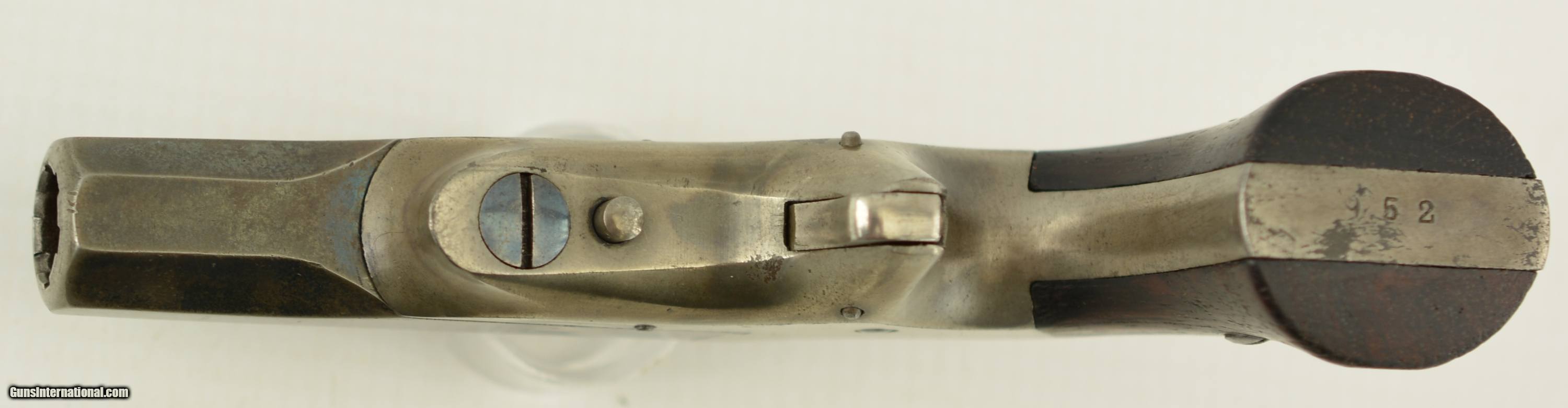Description: This is a superb condition and fairly early (SN 952) Iron frame Brown manufactured Southerner single shot derringer chambered in 41 RF. Octagon barrel is 2 1/2" with a very good bright strong bore with fine to light pitting throughout. Barrel is blued and retains about 85% original thinning and fading color. The iron frame is case colored and retains about 30% coverage; strongest on the rear of the receiver on either side of the hammer. The hammer is also case colored and retains about 40% coverage. The serial number on the butt, bottom of the barrel, extractor and the inside of both grip panels "952" match. Grips have a few light dings and marks. A rare Iron Frame Southerner with high condition and low serial number. SOLD Antique: Yes Manufacturer: Brown Model: Deringer Caliber Info: .41RF Gauge Info: .41RF |