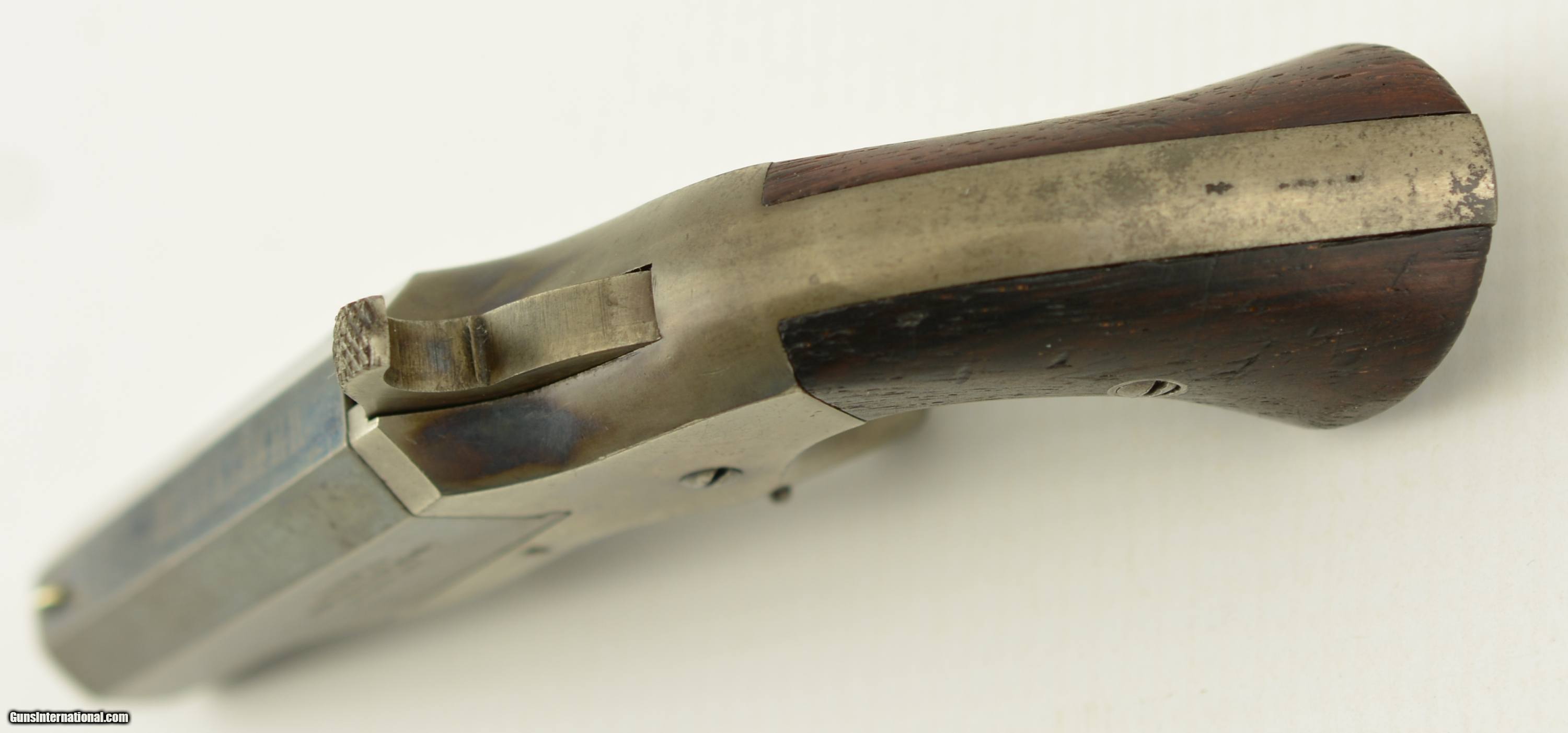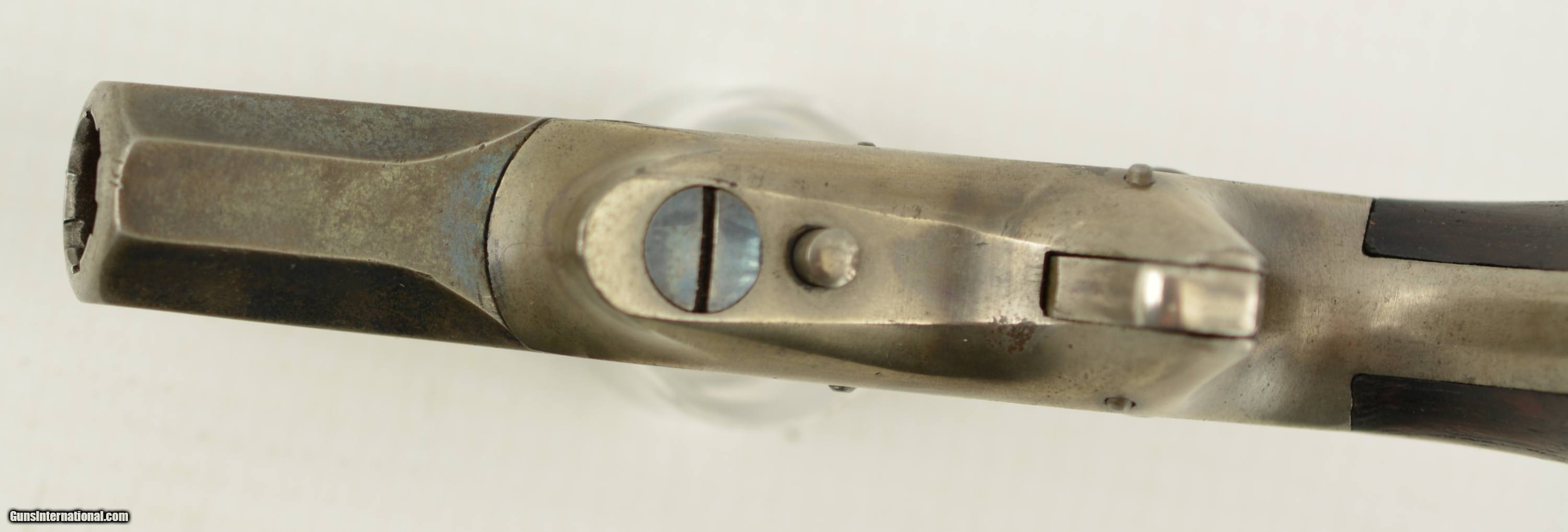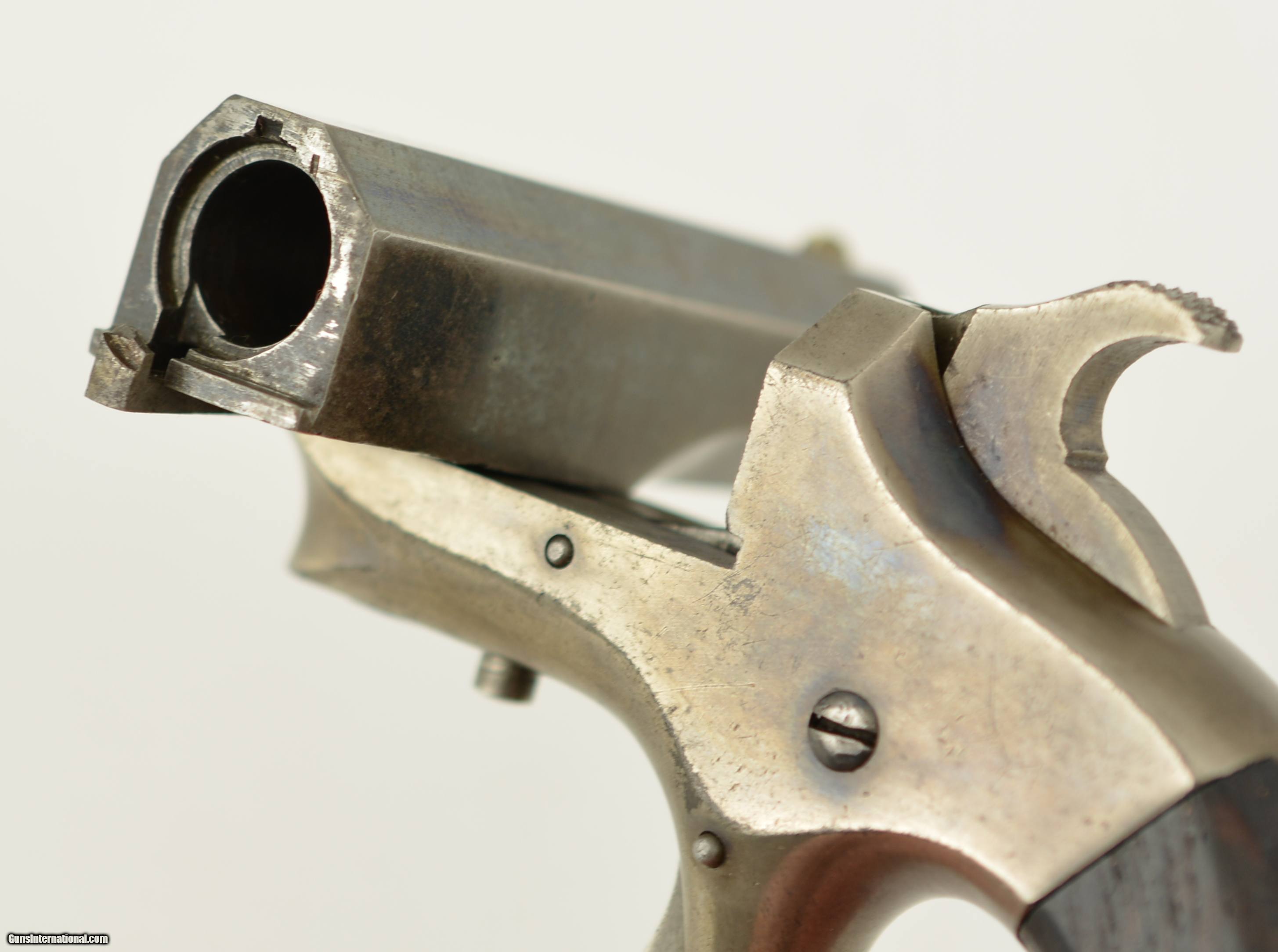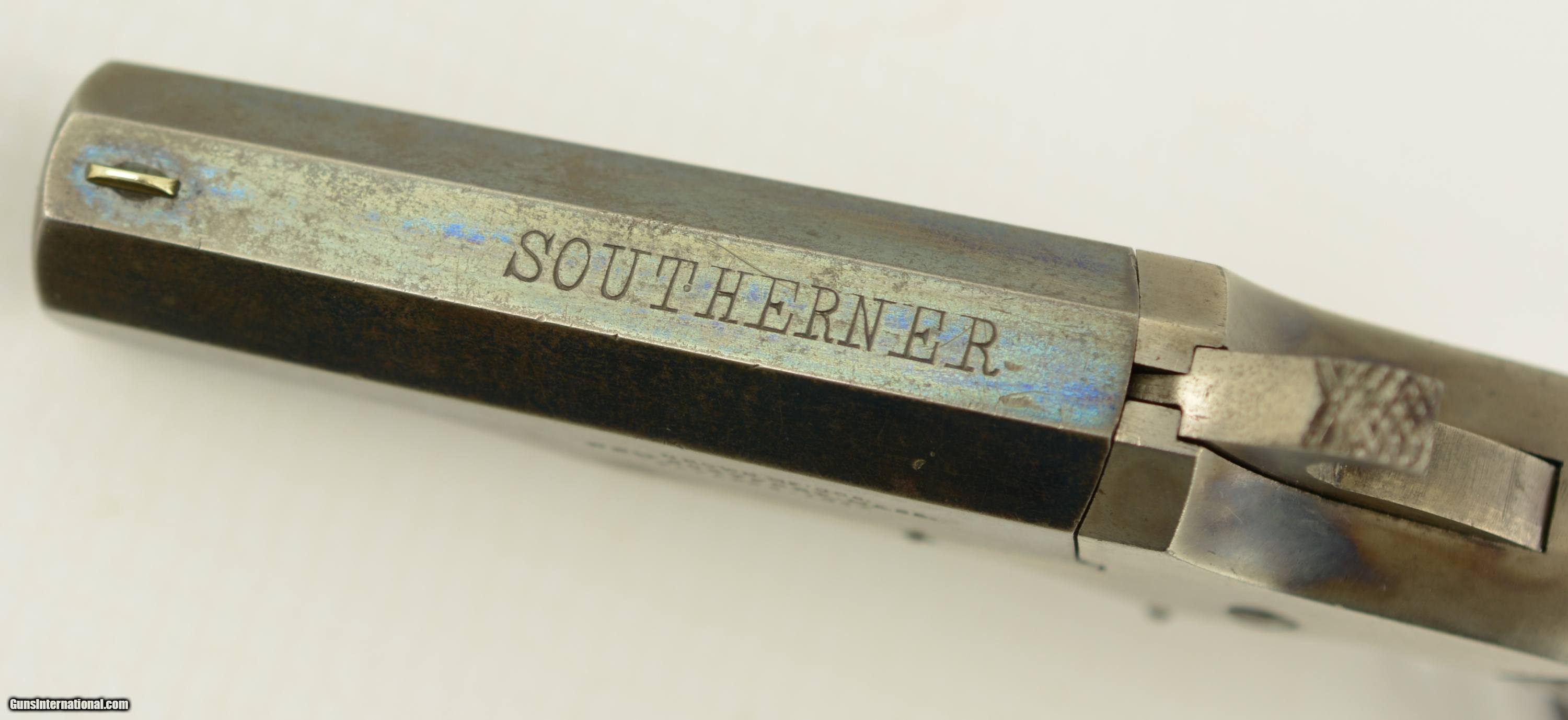 Description: This is a superb condition and fairly early (SN 952) Iron frame Brown manufactured Southerner single shot derringer chambered in 41 RF. Octagon barrel is 2 1/2" with a very good bright strong bore with fine to light pitting throughout. Barrel is blued and retains about 85% original thinning and fading color. The iron frame is case colored and retains about 30% coverage; strongest on the rear of the receiver on either side of the hammer. The hammer is also case colored and retains about 40% coverage. The serial number on the butt, bottom of the barrel, extractor and the inside of both grip panels "952" match. Grips have a few light dings and marks. A rare Iron Frame Southerner with high condition and low serial number. SOLD Antique: Yes Manufacturer: Brown Model: Deringer Caliber Info: .41RF Gauge Info: .41RF |