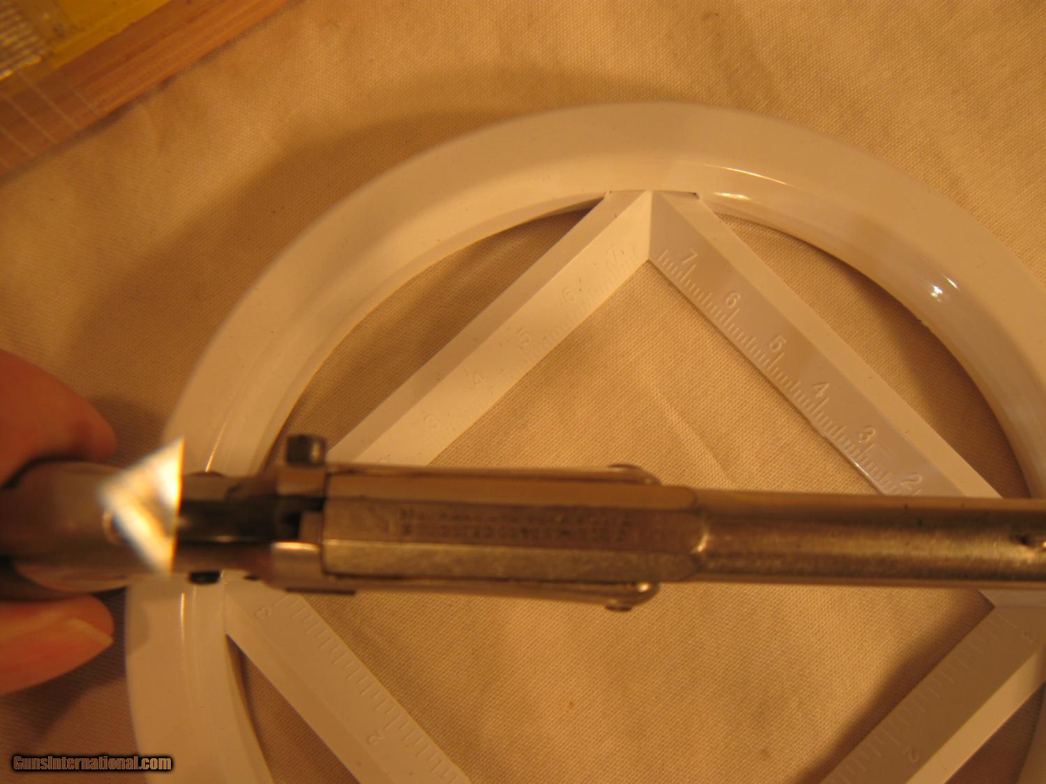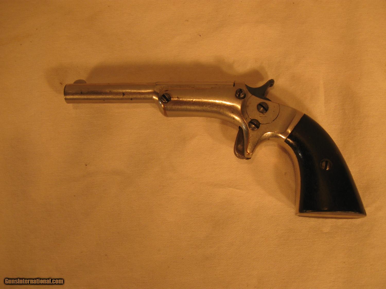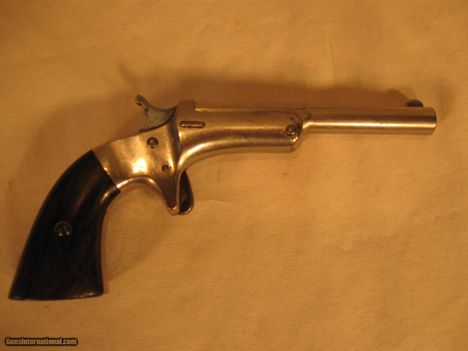 Description: Stevens Old Model Pocket pistol in 22RF. Brass frame with nickel plate. 90% plate good bore with very light pitting. Rosewood grips. Made 1864 to 1886. Overall a nice pistol. SOLD Antique: Yes |