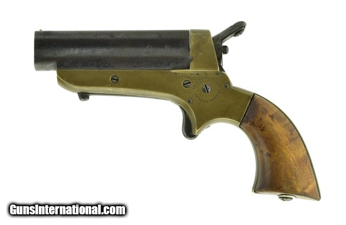 Description: Copy of the Sharps 4 barrel Deringer. Manufactured circa 1860 in England. Has blue in the flutes, the rest is even patina. Brass frame has untouched patina. SOLD Antique: Yes |