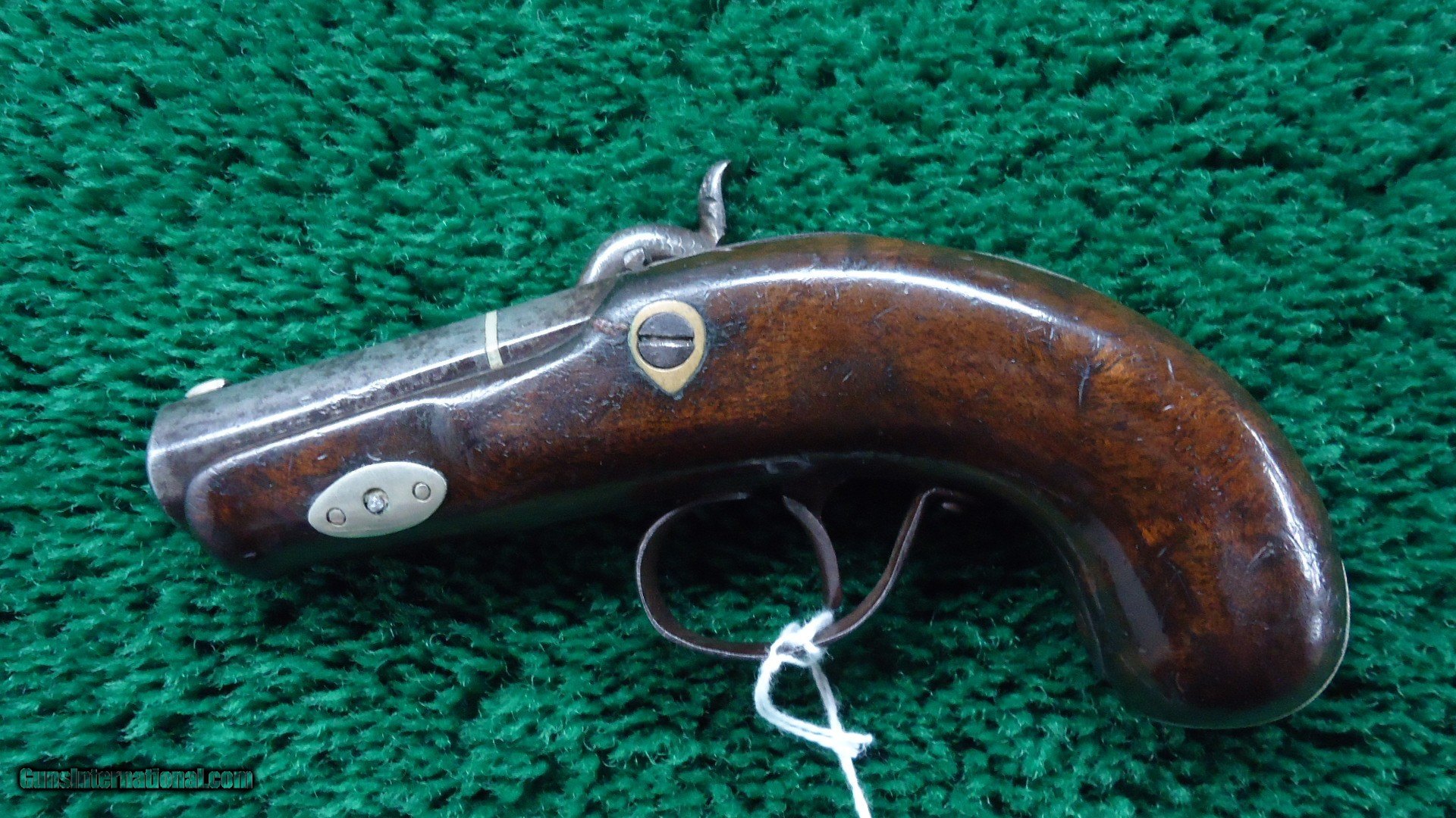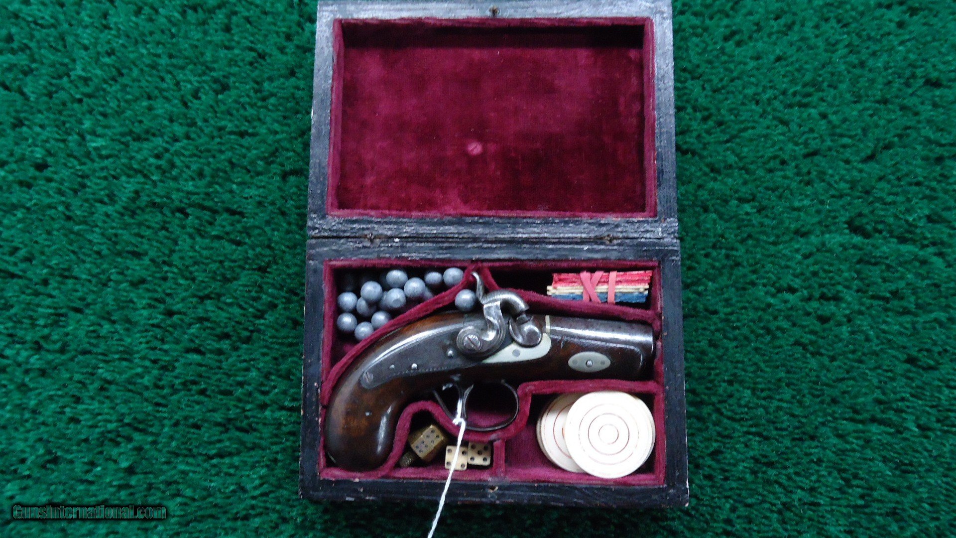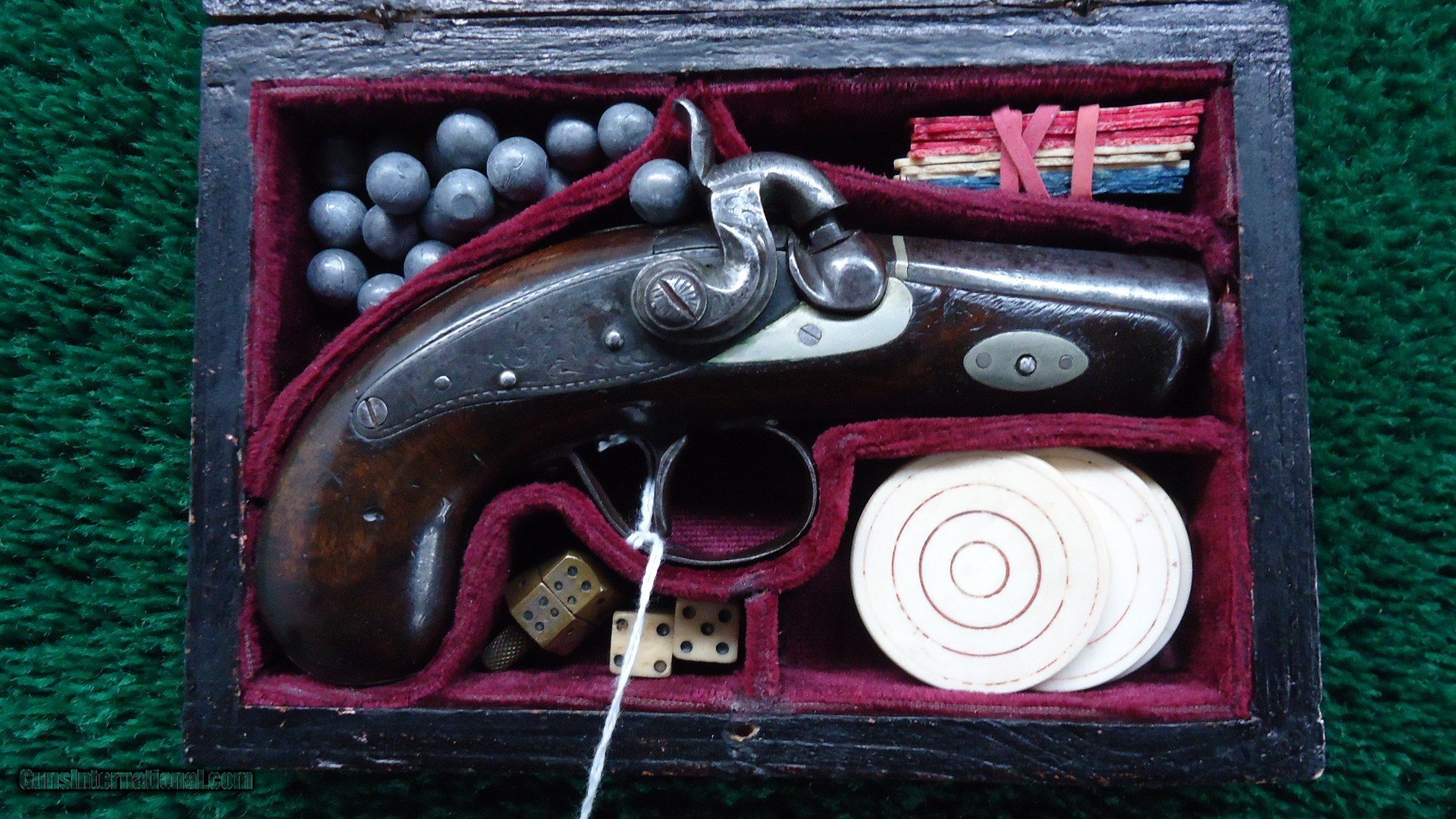 Description: Includes a percussion Deringer pistol similar to the Abraham Lincoln Derringer. An unmarked gun but very high quality. Platinum barrel band, original sights and engraved back action lock. Mostly a plum/brown color. German silver parts. The Gold gilded case is decorated with an image of 4 playing cards of hearts, clubs, spades and diamonds. A neat box. It holds a device marked "Spinim Patd April 12-21", 5 antique Ivory poker chips, 2 small Ivory dice, red white and blue markers as well as some lead balls. A very unique set. Leroy Merz Antique Firearms specializes in antique and vintage Winchesters and other fine American firearms. Since 1965 Mr. Merz has taken part in the world of firearms and has been a contributor to many well known reference books. We have hundreds of additional guns in every price range at our home online. Search for Merz Antiques in google. SOLD Antique: Yes |