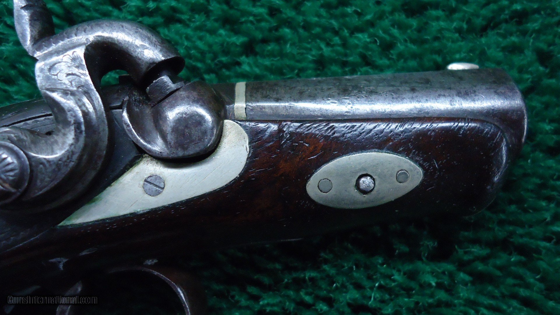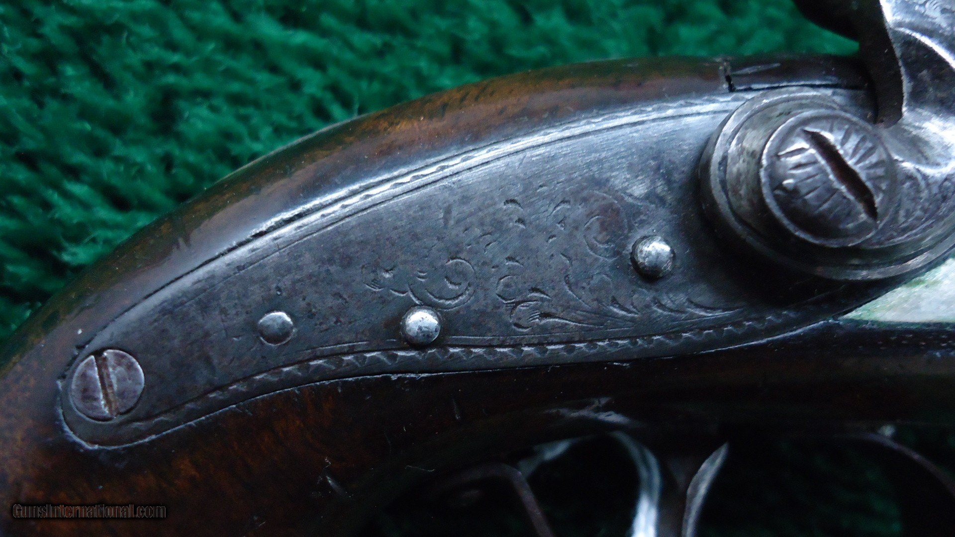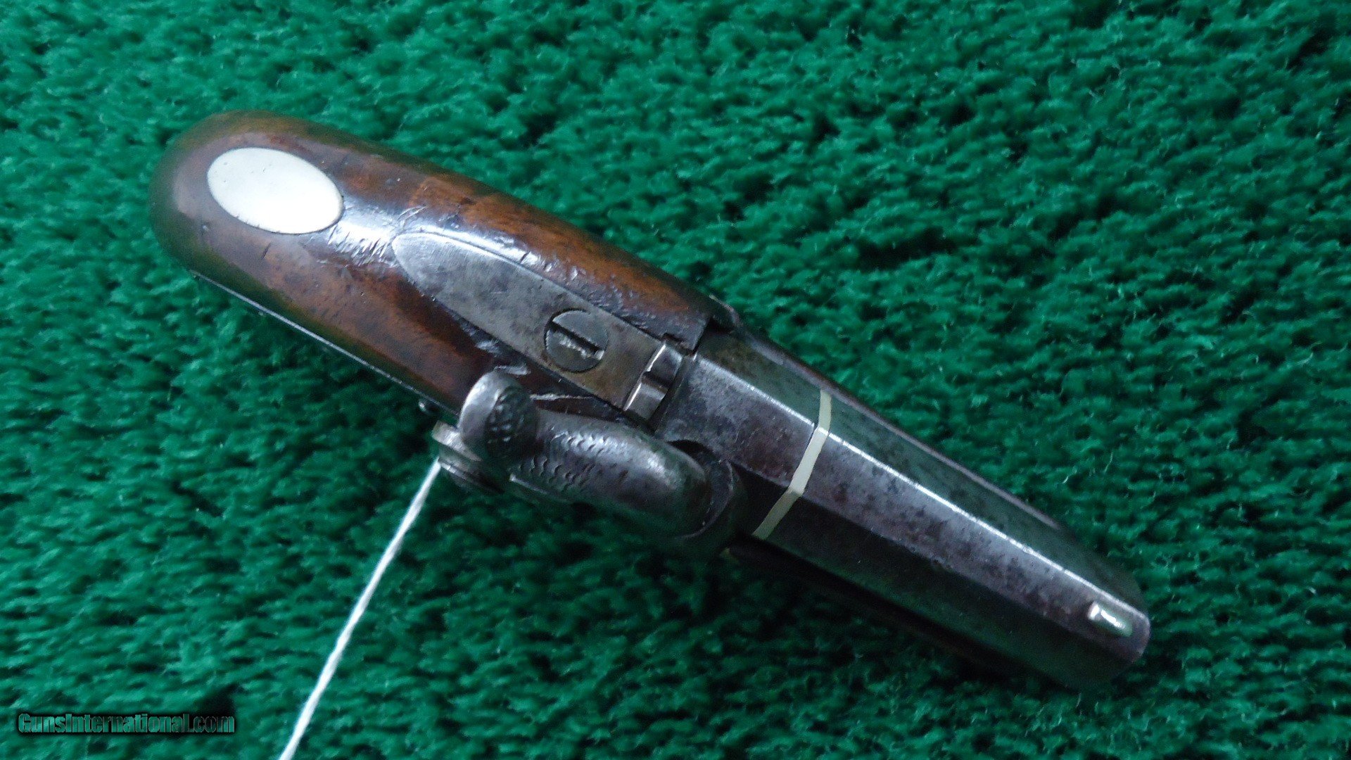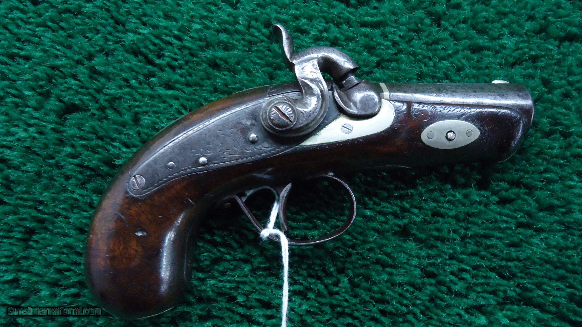 Description: Includes a percussion Deringer pistol similar to the Abraham Lincoln Derringer. An unmarked gun but very high quality. Platinum barrel band, original sights and engraved back action lock. Mostly a plum/brown color. German silver parts. The Gold gilded case is decorated with an image of 4 playing cards of hearts, clubs, spades and diamonds. A neat box. It holds a device marked "Spinim Patd April 12-21", 5 antique Ivory poker chips, 2 small Ivory dice, red white and blue markers as well as some lead balls. A very unique set. Leroy Merz Antique Firearms specializes in antique and vintage Winchesters and other fine American firearms. Since 1965 Mr. Merz has taken part in the world of firearms and has been a contributor to many well known reference books. We have hundreds of additional guns in every price range at our home online. Search for Merz Antiques in google. SOLD Antique: Yes |