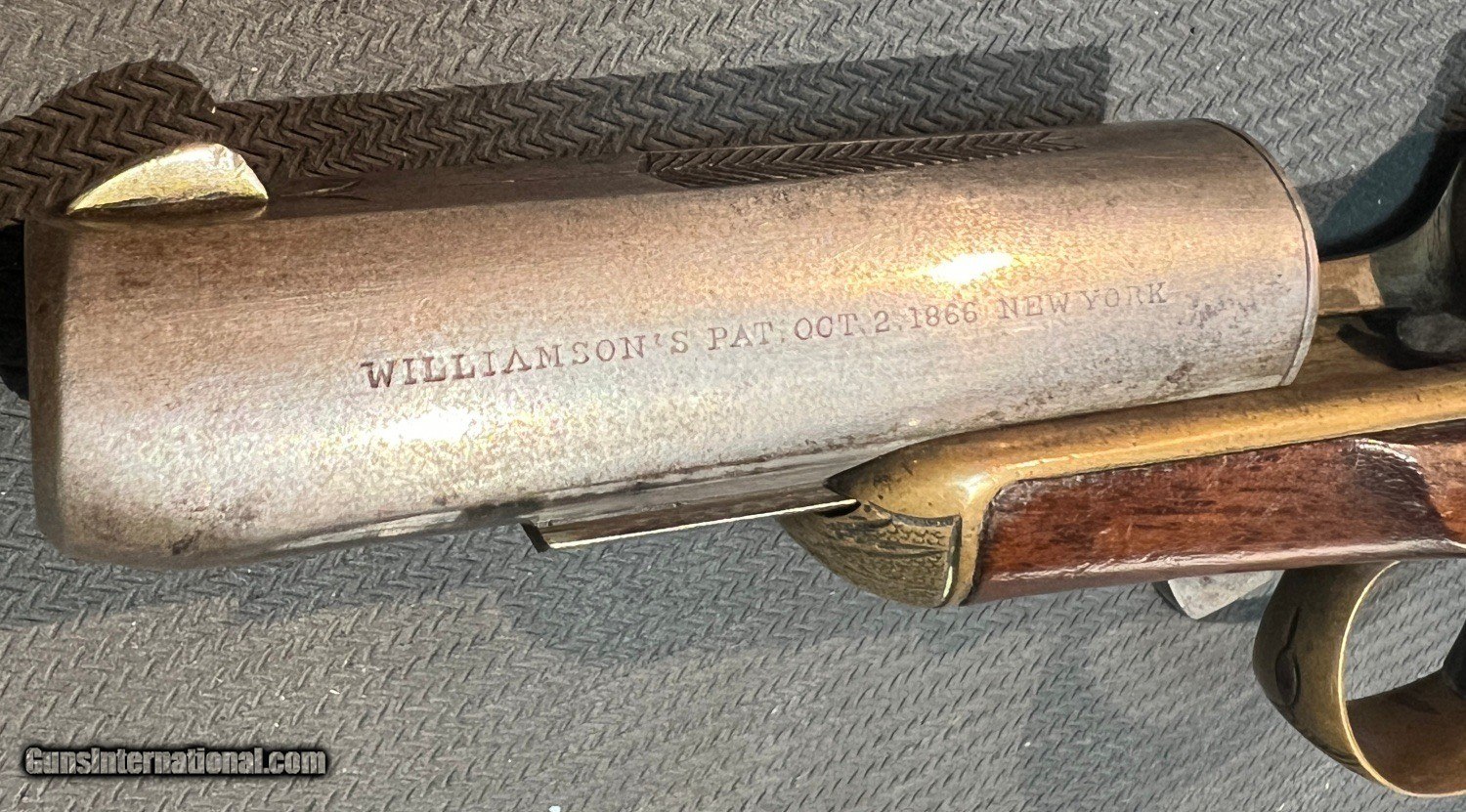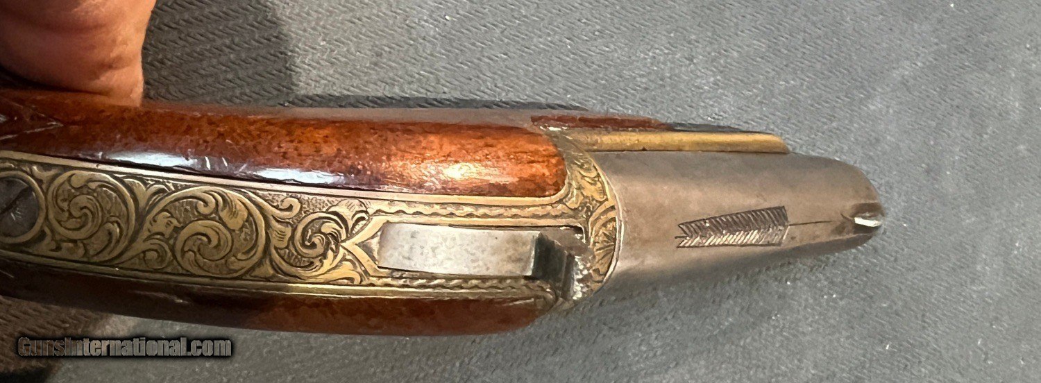 Description: 38 caliber rimfire. Manufactured circa 1866-1870, and designed by David Williamson. German Silver Blade front and hammer notch rear sights, with an engraved arrow on top of the barrel and "WIlliamson's Pat Oct 2 1866 NEW YORK" on the left . Fine scroll Engraving is visible on the gilt finished upper tang, breech, trigger guard and trigger guard finials, with a sunburst pattern on the tip of the stock, which ends in a checkered bird's head butt. It comes with an auxiliary/adapter for 22 rimfire. Note Wild Bill Hickok was known to carry one just like this in his shirt pocket. Excellent condition. Can be seen by appointment in our Raleigh NC Proshop Can be purchased at goshoot Curio/Relic: Yes Antique: Yes Manufacturer: Williamson Moore Firearms Model: Derringer Serial Number: 2993 Price: $1,395.00 Shipping: $30.00 Contact Seller |