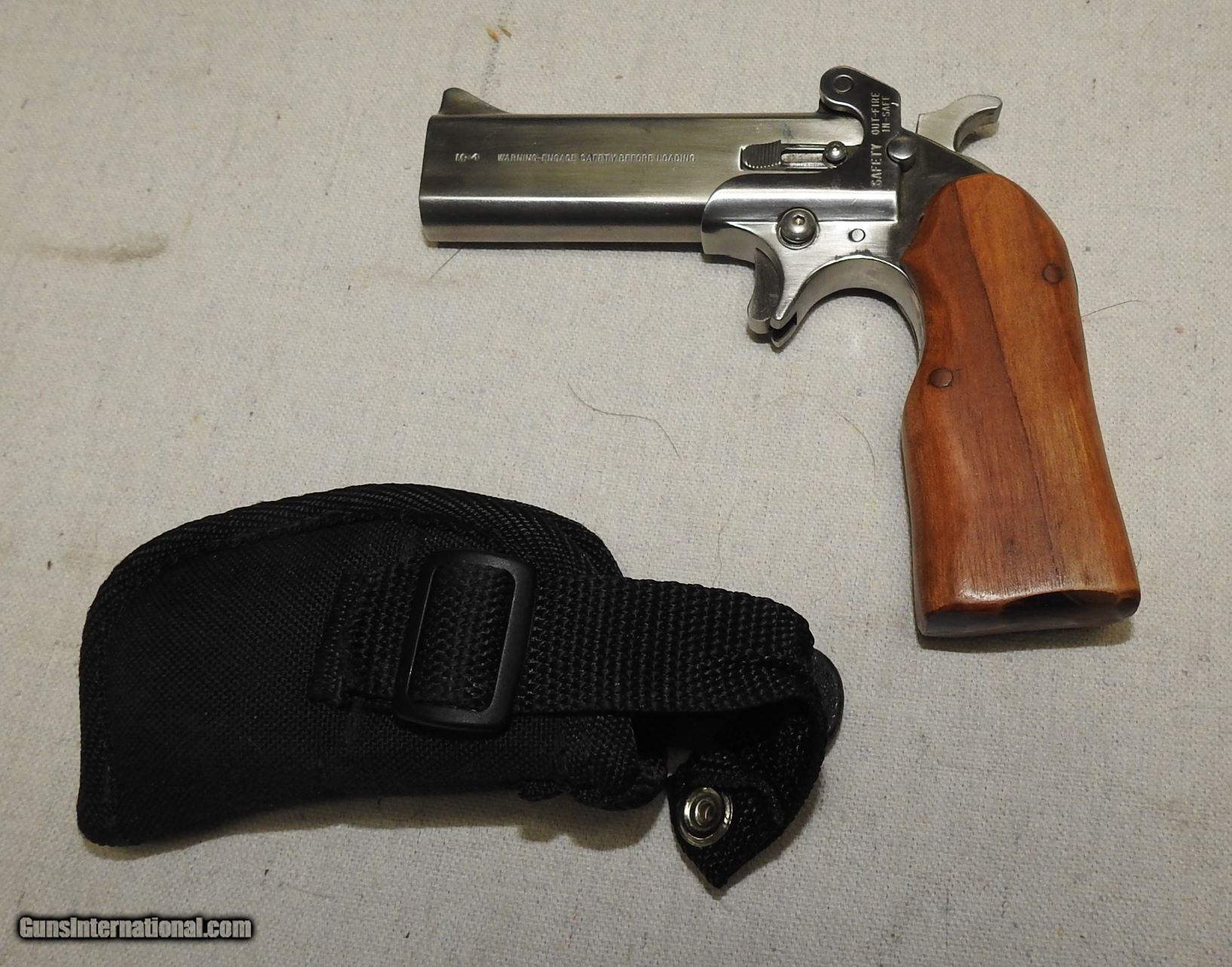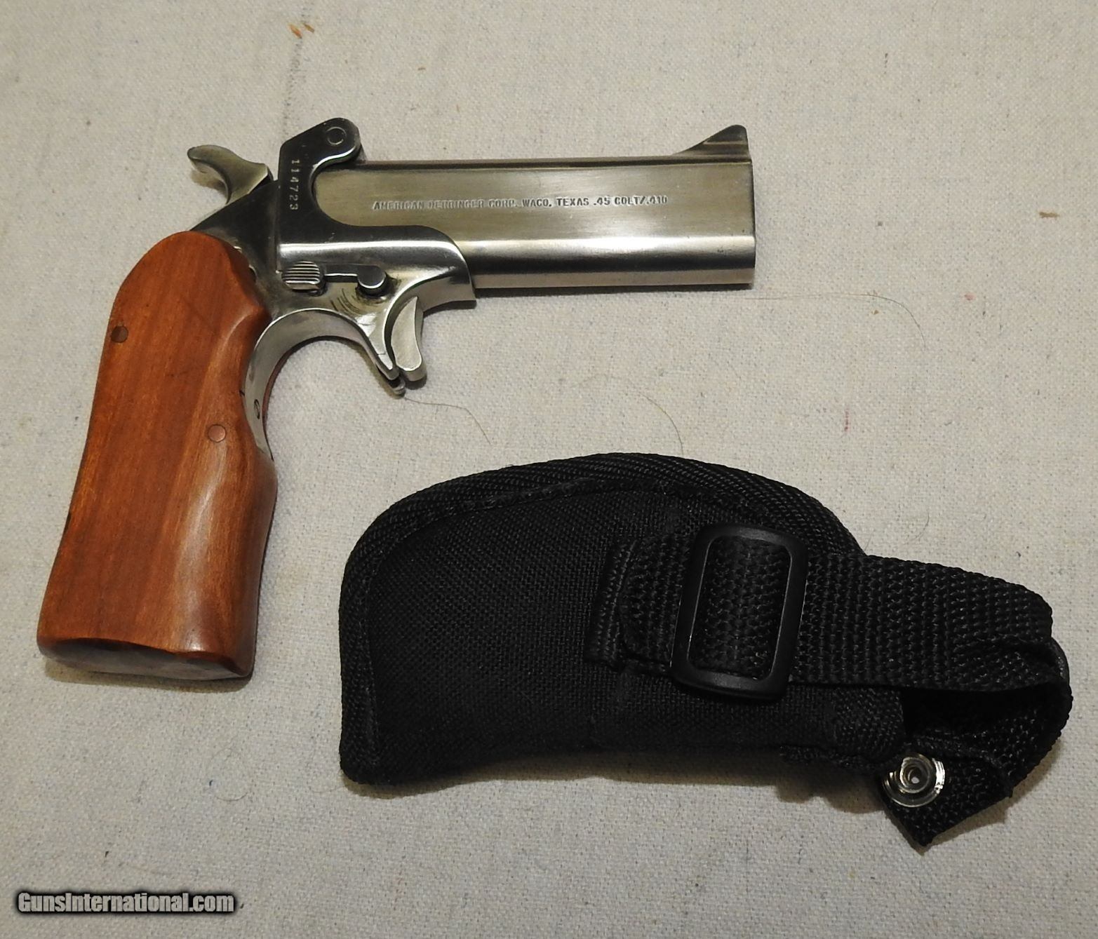Description: American Derringer Model M4 2 shot derringer in .45 Colt /.410. Custom Grips, only shot with shotgun ammo, less than 50 rounds. Comes with nylon holster. Buyer pays shipping. Sorry, no sales to CA. SOLD Handgun Caliber: .45 Colt Shotgun Gauge: .410 Gauge |