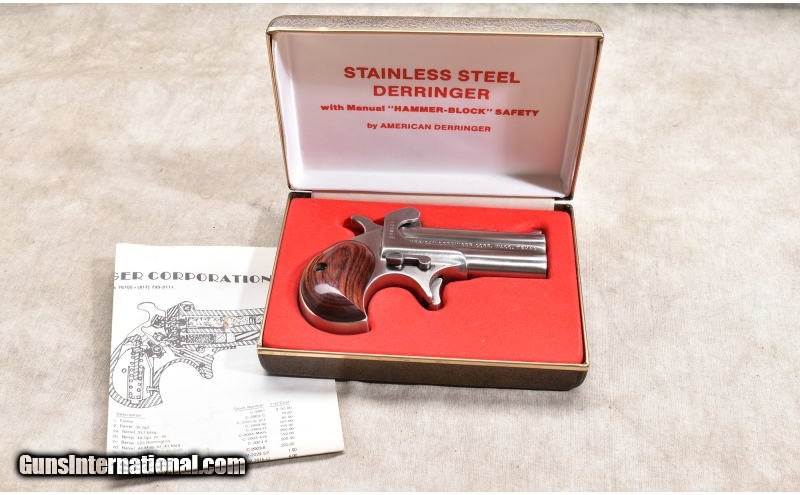 Description: The Derringer is the iconic self-defense pocket pistol. This one features stainless steel construction for easy maintenance, and fixed sights for reliable pointing. With the .22 Hornet chambering comes that "little bit of extra" that can make :all the difference." It is in excellent, apparently unfired, condition. .22 Hornet SOLD Chambers: 2 rounds Metal Condition: Excellent. Wood Condition: Excellent. Bore Condition: Shiny and bright with good rifling. Barrels: 3 inches Triggers: Factory single action spur trigger. Butt Pad: Smooth hardwood. Weight: 19 ounces Sights: Fixed post and notch. Item Location: Rogers |