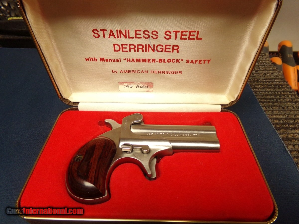 Description: Guns Listing ID: 685996 American Derringer M-1 45 ACP...stainless...wood grips...beautiful gun...includes original box...3\" barrel SOLD Manufacturer: American Derringer Model: M-1 Caliber Info: 45 ACP Condition: Used - Non-Certified Barrels: 3 BARREL Finish: STAINLESS |