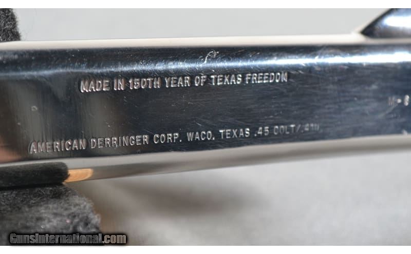 Description: This American made American Derringer Co chambered in 45 Colt and .410 gauge. This high polish satin finish with a stamp of "Made in 150th year of Texas Freedom" is a unique piece for any collection. .45 Colt / 410 Gauge SOLD Barrels: 6 Inches Item Location: Lacey, WA |