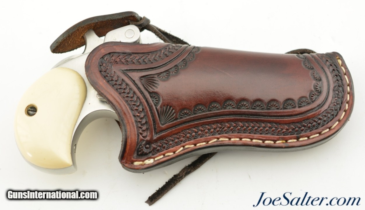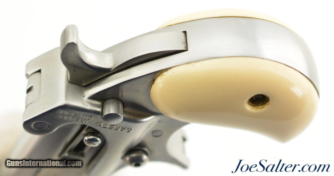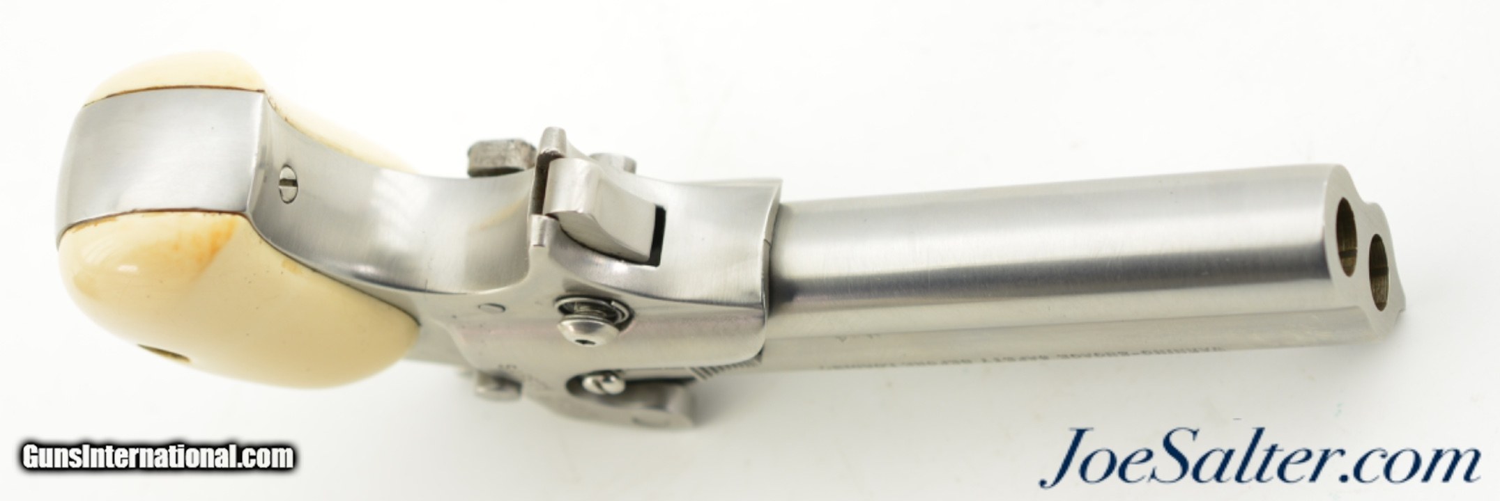 Description: Serial #058864S, .357 Magnum, 4 inch barrels with excellent bores. This is the American Derringer Corp. model M-4 Derringer manufactured in Waco, Texas. In excellent condition the very well made over/under pistol retains virtually all, 96-98% of the original stainless finish with some very mild use marks around the barrel latch. The synthetic ivory grips are likewise excellent. The action locks up tight with proper mechanical function holding at half and full cock with a crisp trigger. It comes in a custom tooled Montana made leather "The Absaroka Kid" holster which is in excellent condition. FFL SOLD |