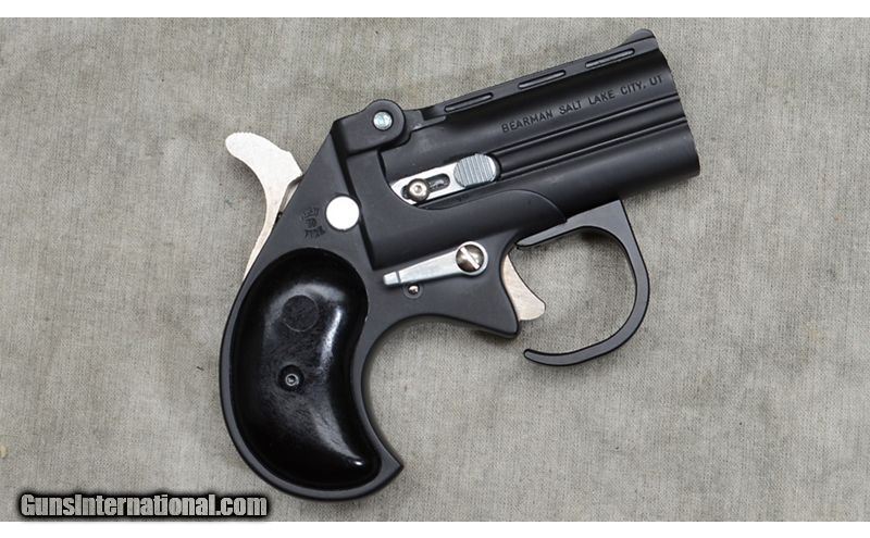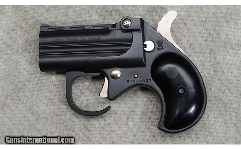 Description: This black derringer features like new in the box condition, oversize trigger guard and .22 Mag. chambering. .22 MAG SOLD Chambers: 2 Metal Condition: Like New in the Box. Wood Condition: Like New in the Box. Bore Condition: Like New in the Box. Barrels: 2-3/4 inch. Triggers: "Spur trigger, single action only. Butt Pad: Black plastic grips. Weight: 15 oz. Sights: Post and notch. Item Location: Rogers |