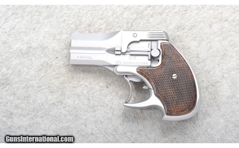 Description: This BTJ Model DA is a stainless steel derringer pistol in 9mm Cal. It has 3 inch barrels. A blade front sight and notch rear sight. The grip is a diamond checkered hardwood. 9mm Parabellum SOLD Chambers: 2 shot. Metal Condition: Excellent. Wood Condition: Excellent. Bore Condition: Excellent. Barrels: 3 inch. Weight: 14 oz. Sights: Blade front. Notch rear. Item Location: Richfield, WI |