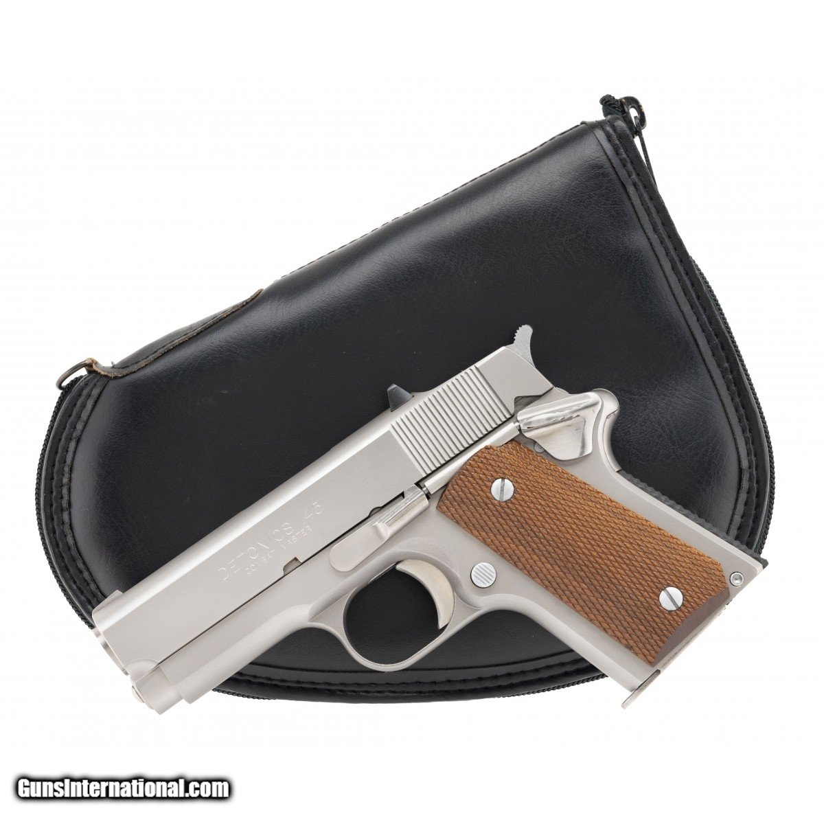 Description: " The original subcompact 1911, made in Seattle. Stainless steel with wood grips, in excellent condition. Comes with original Detonics pouch. A very desirable Detonics pistol, hard to find in this condition. SOLD |