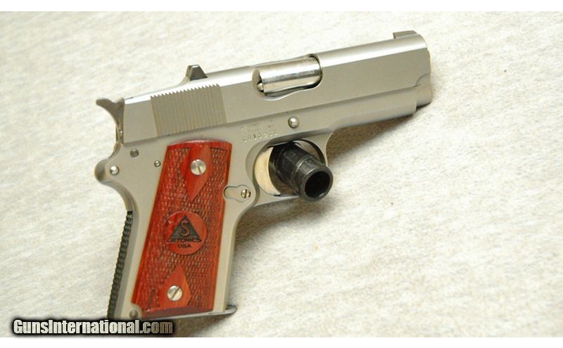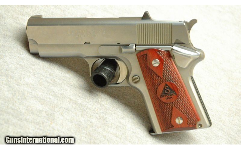 Description: Detonics Combat Master Pistol. Excellent condiiton with 2 mags. Bushingless bull barrel, stainless finish, combat sights. One of the first serious big bore concealed carry pistols, a great choice for those trained in the use of single action handguns. .45 Auto SOLD Chambers: Semi auto Metal Condition: Excellent Wood Condition: Grips are excellent Bore Condition: Bright Barrels: 3 1/2 Triggers: Single action Butt Pad: Factory wood grips Sights: Iron sights Item Location: La Vista, NE |